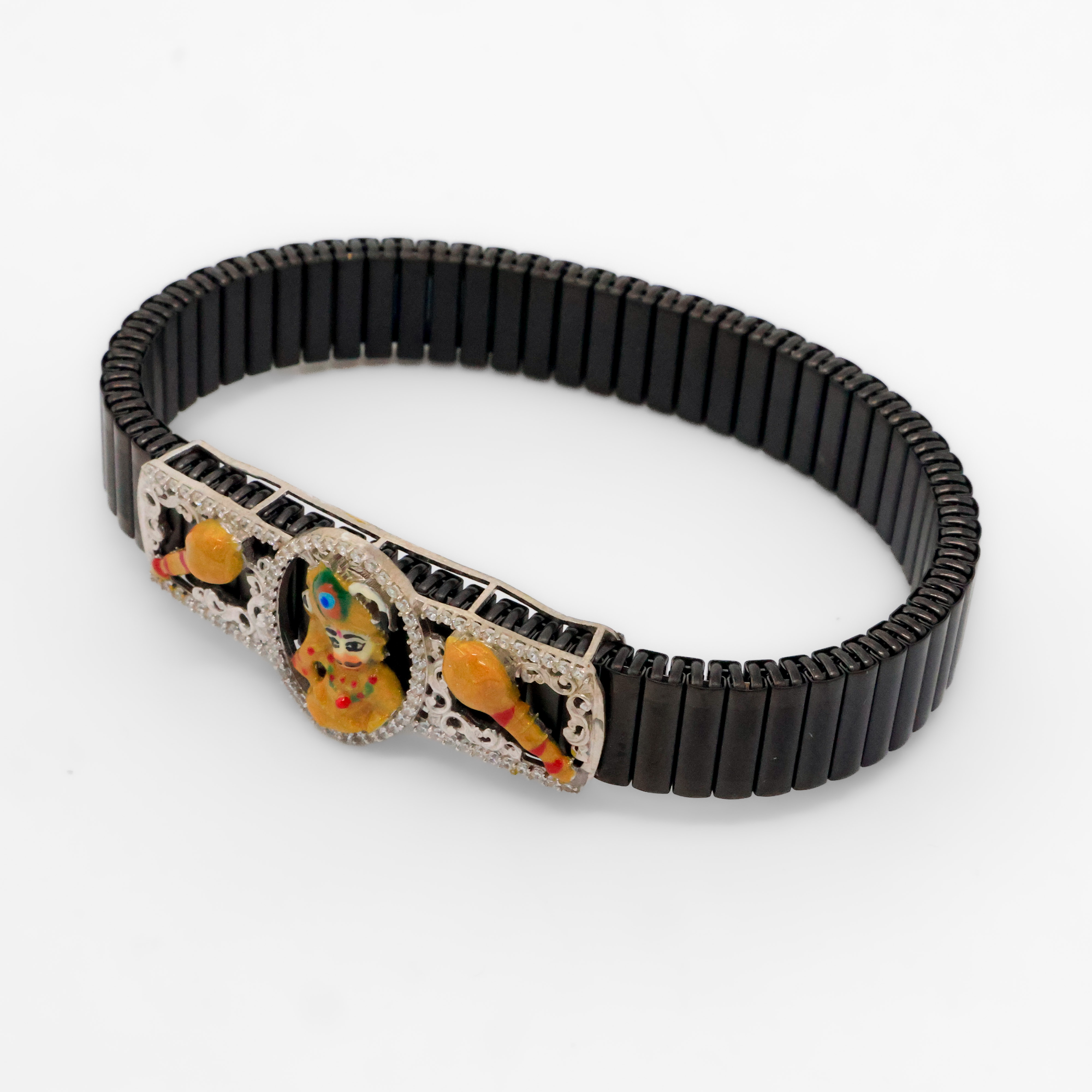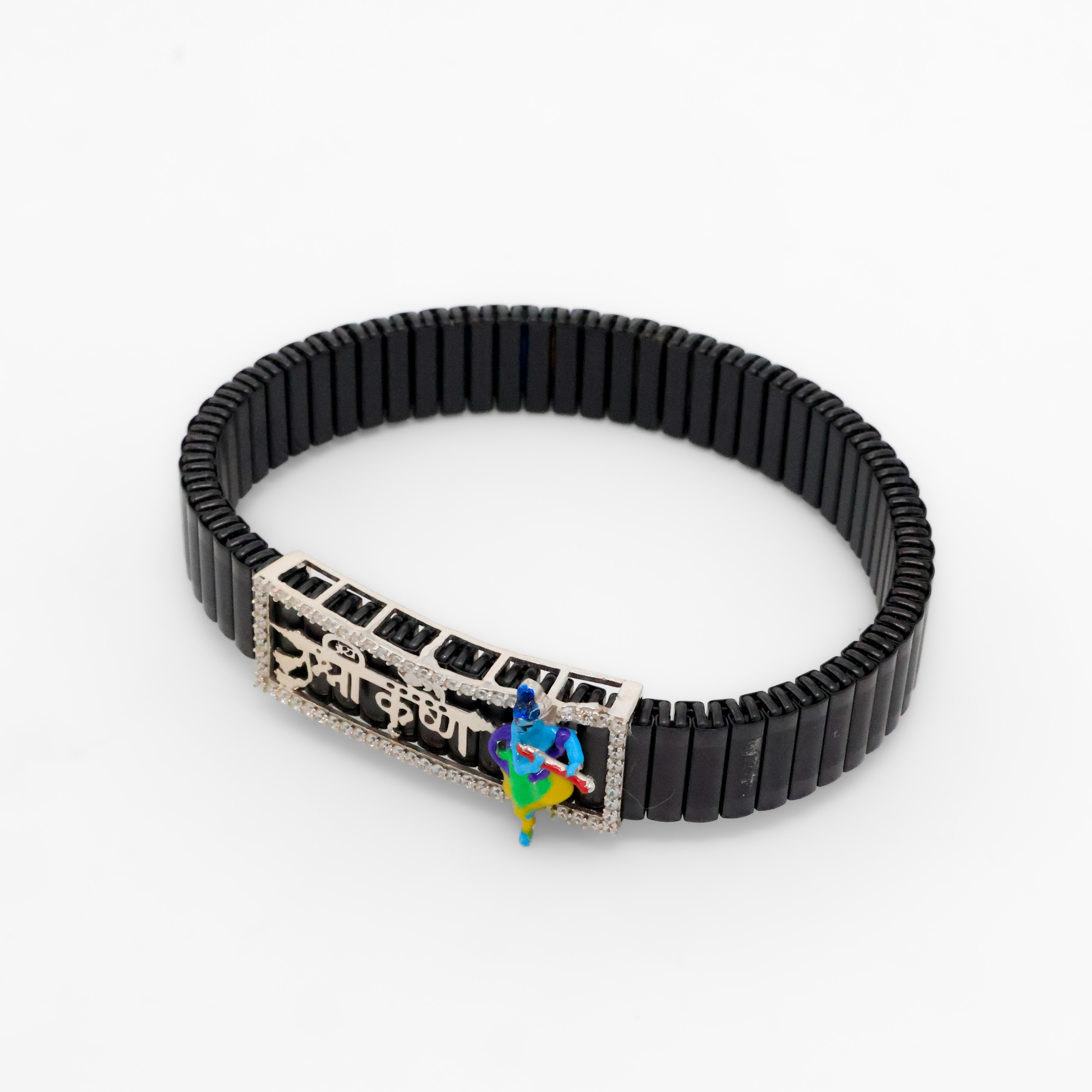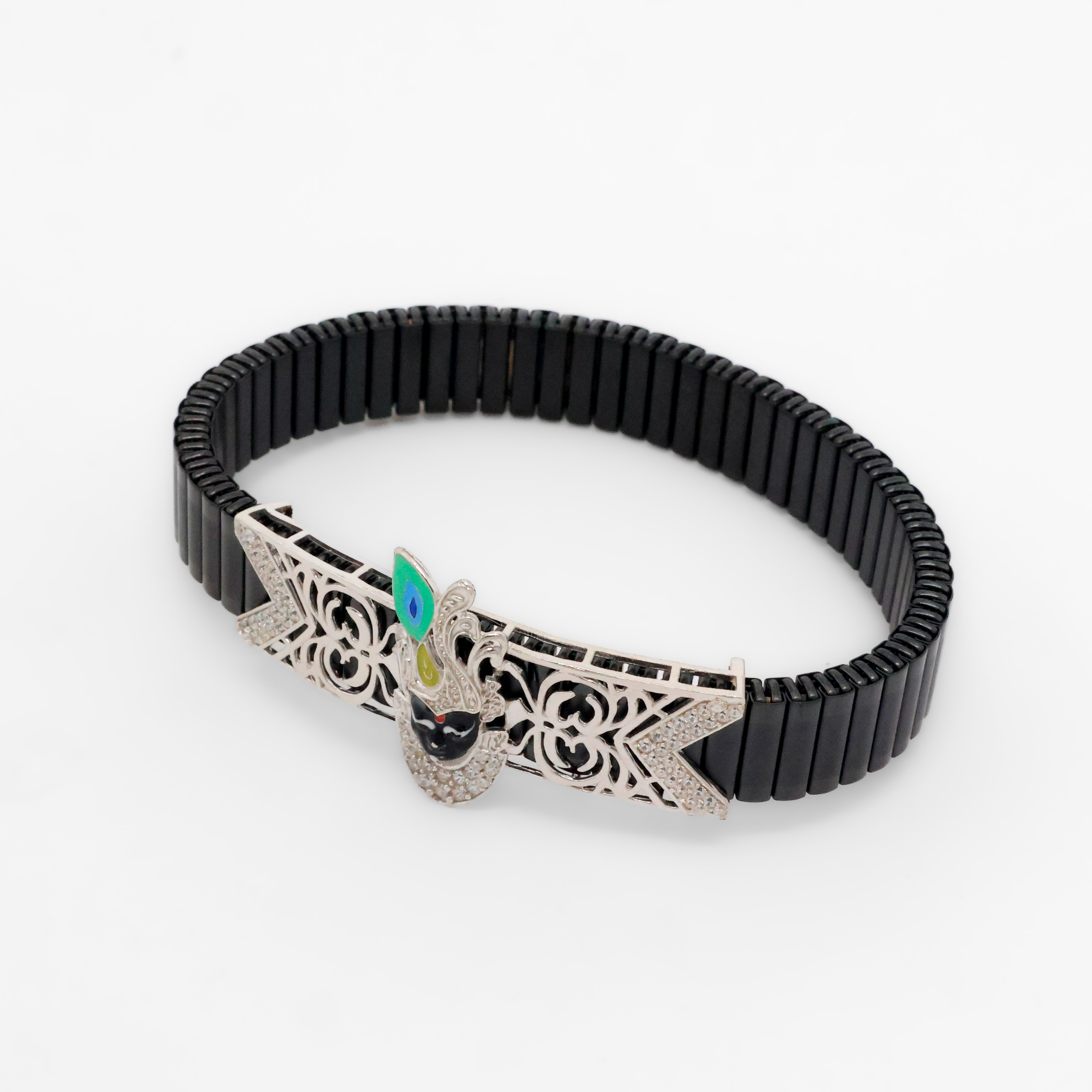 Elegant silver Krishna bracelet featuring intricate detailing and a unique design, perfect for festive occasions. Buy silver Krishna bracelet from Arham Silver Palace in Hyderabad.