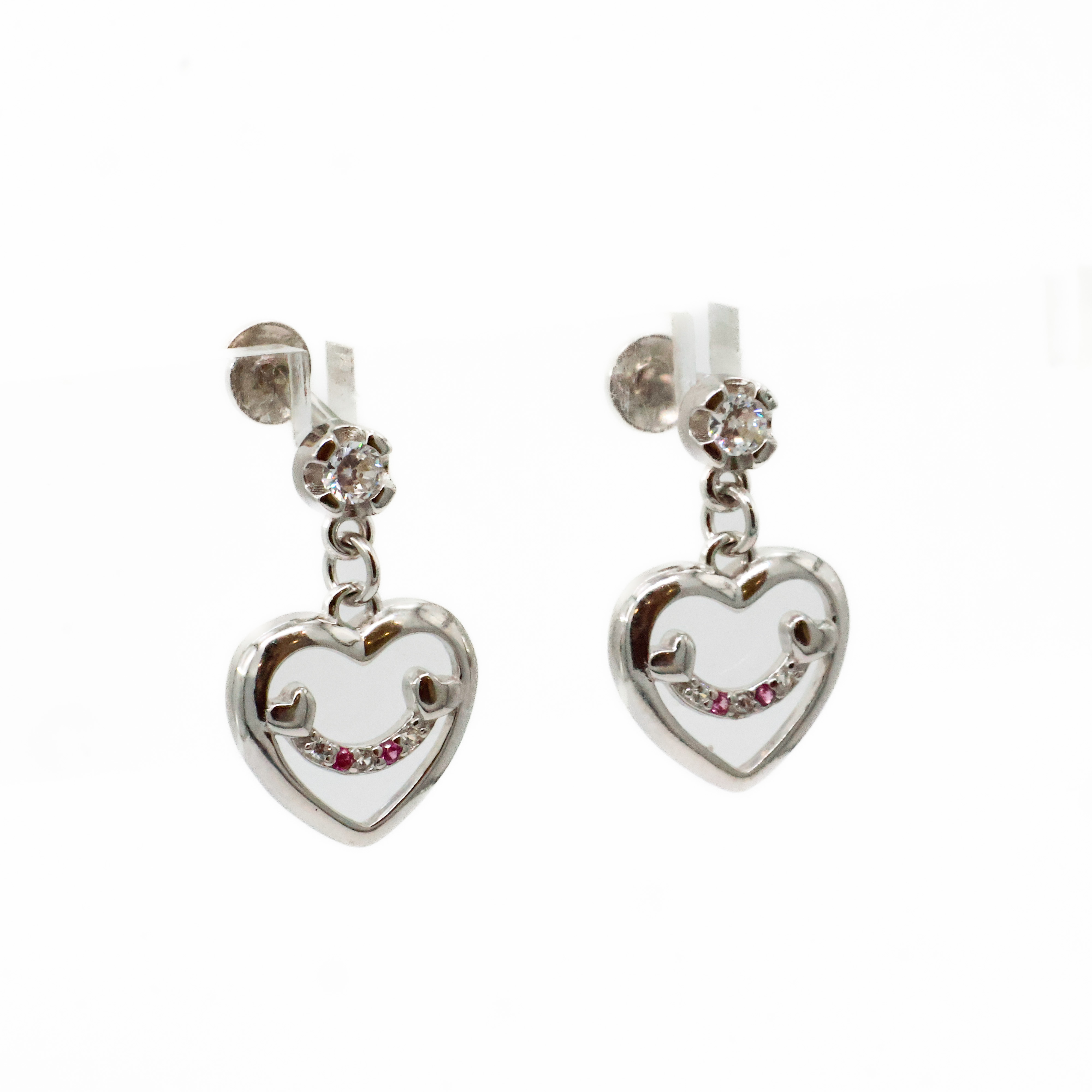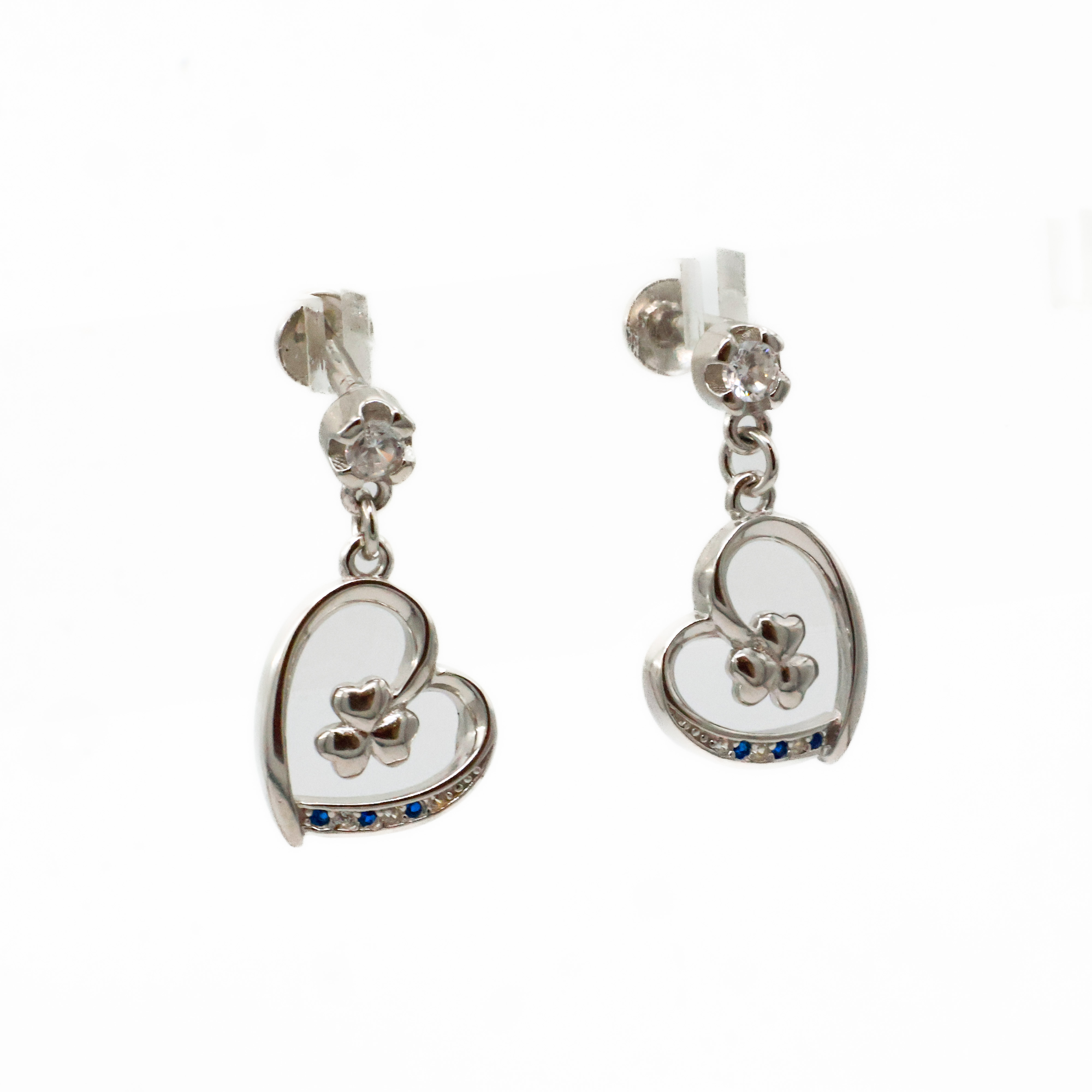 Elegant silver heart earrings with clover accent, perfect for everyday wear and special occasions. Buy silver heart earrings from Arham Gold in Hyderabad.