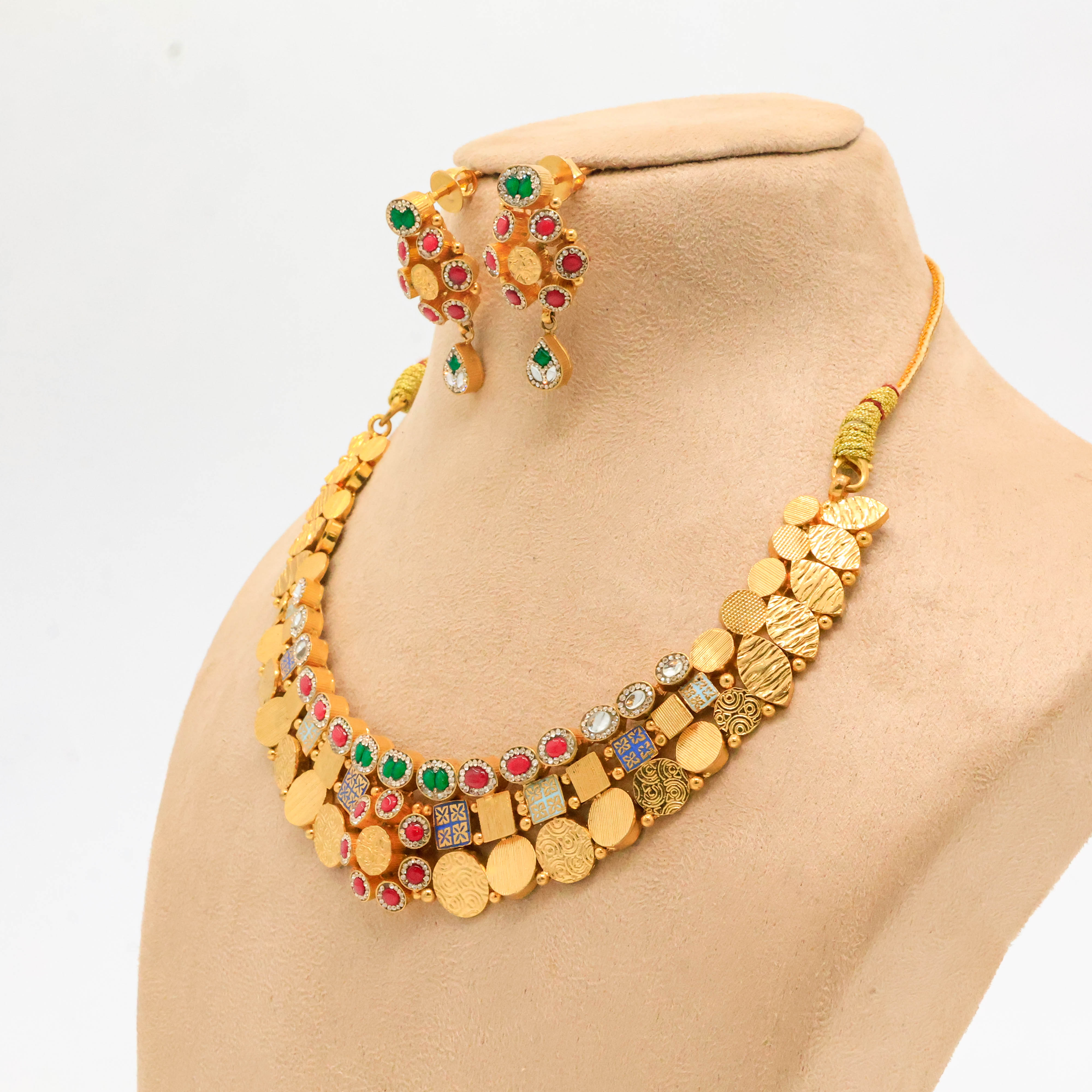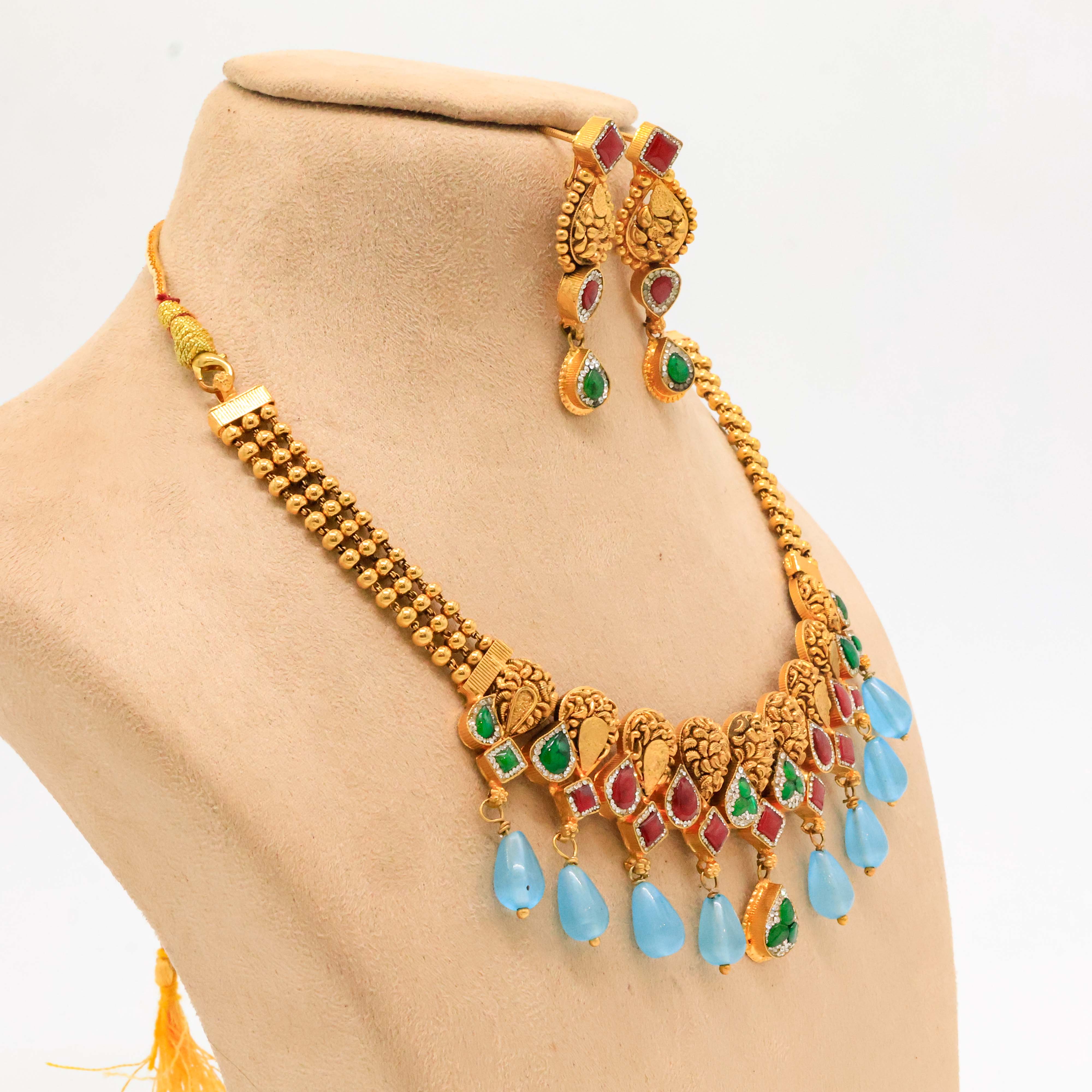 Elegant gold plated necklace with red, green and blue stones, perfect for weddings and festive occasions. Buy gold plated necklace from Arham Jewellery in Hyderabad.