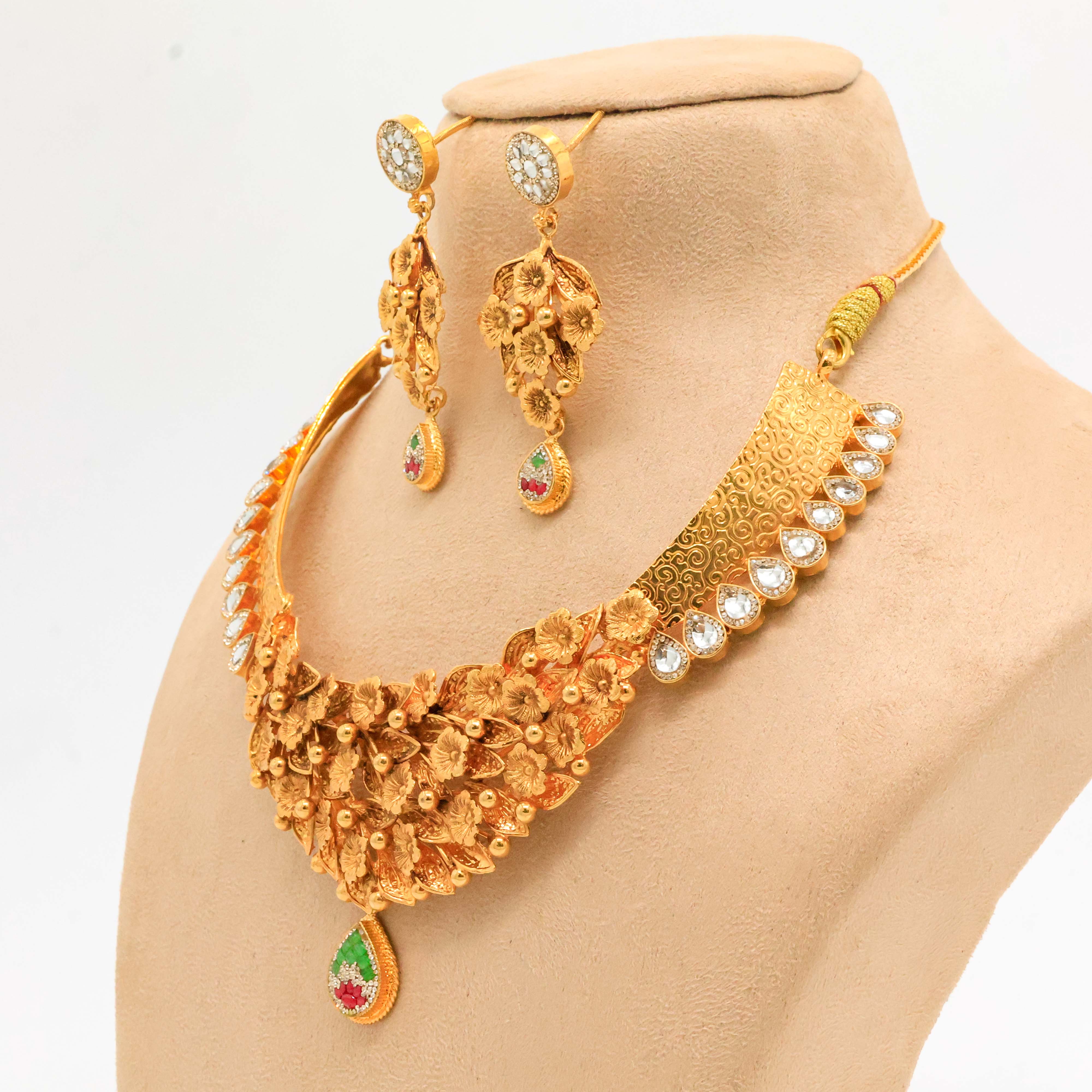 Elegant gold floral necklace with gemstone accents, perfect for weddings and special occasions. Buy gold floral necklace from Arham Jewellery in Hyderabad.