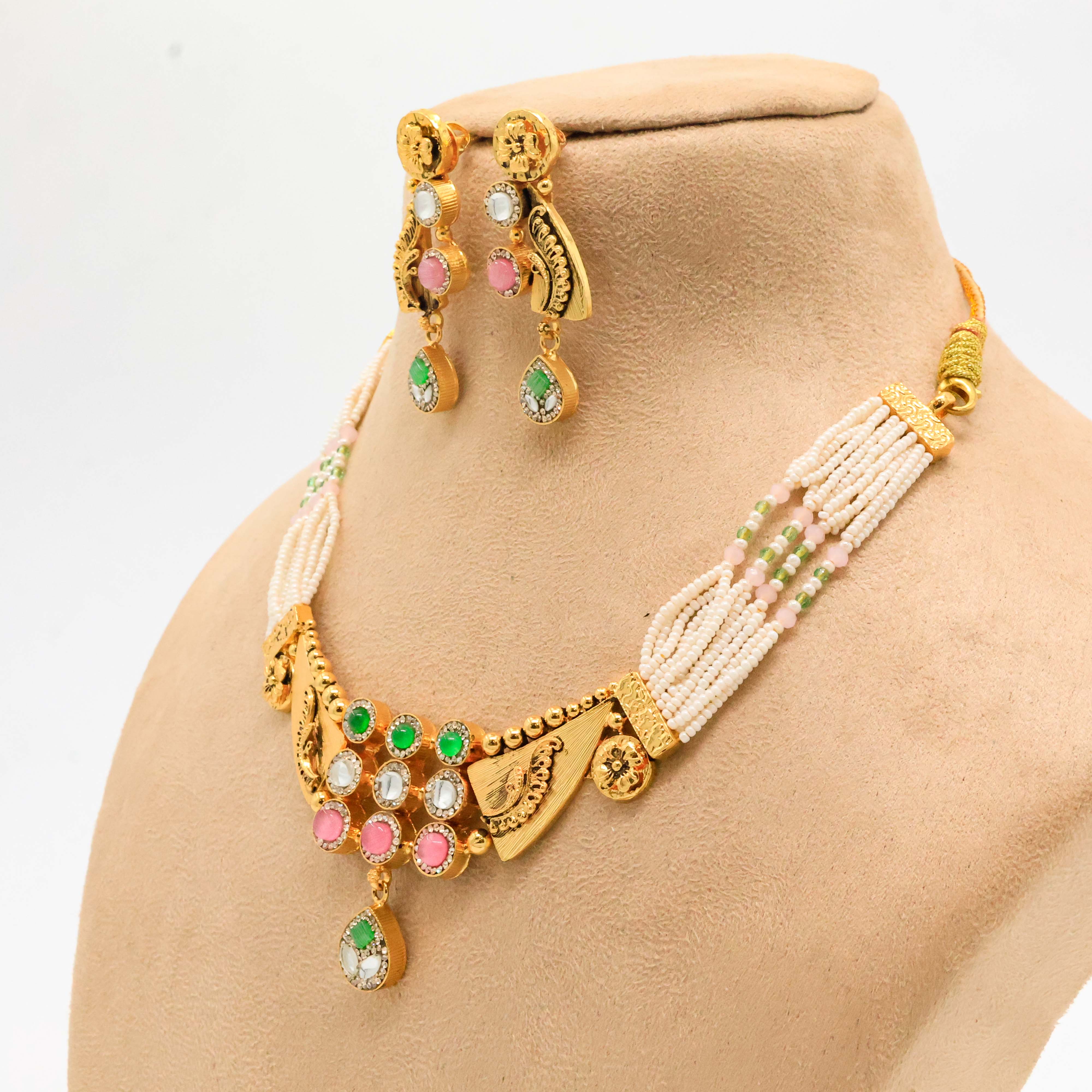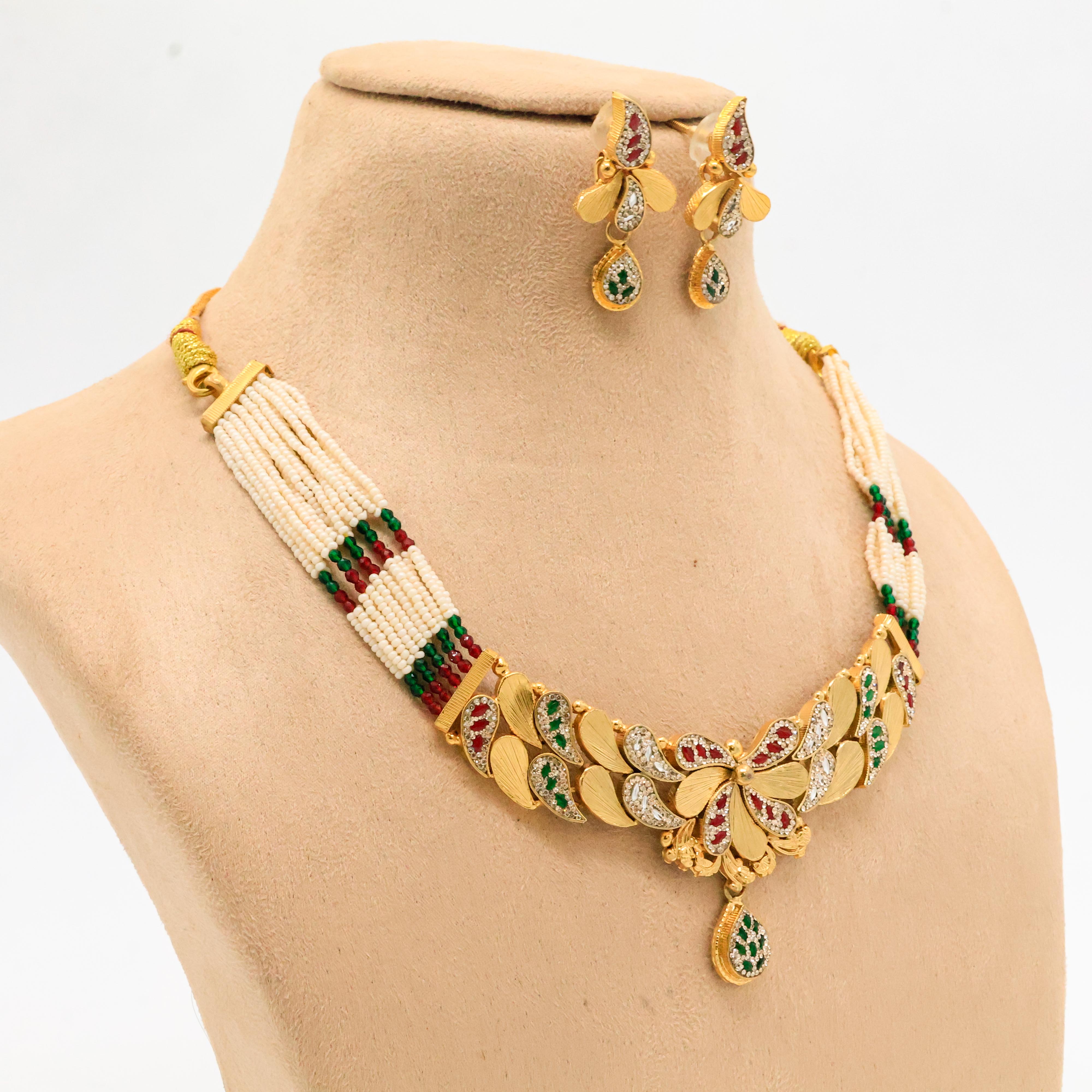Elegant gold plated necklace with pearl accents, perfect for weddings and festive occasions. Buy gold pearl necklace from Arham Jewellery in Hyderabad.