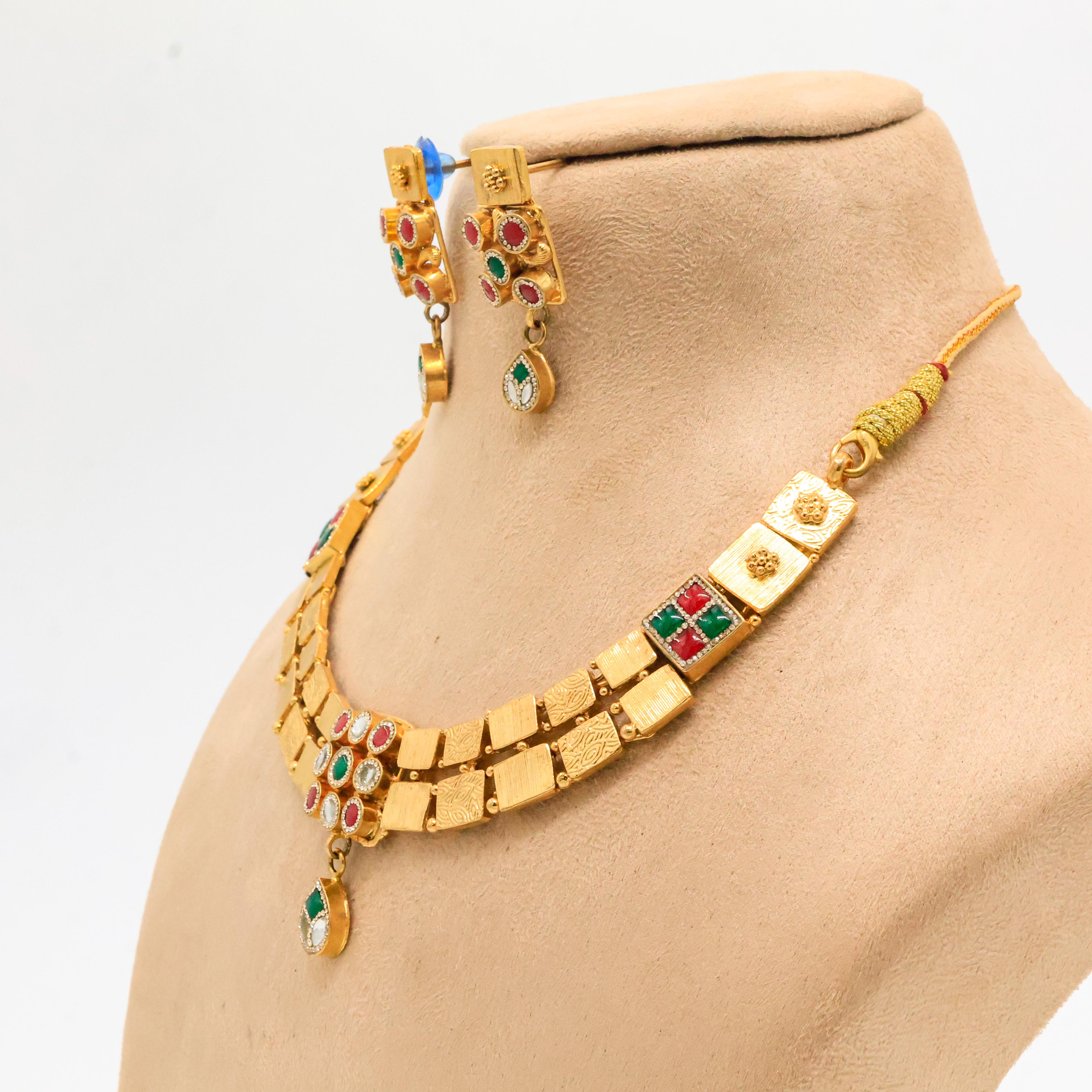 Elegant gold plated necklace set with red and green stones, perfect for traditional occasions. Buy Gold Plated Necklace from Arham Jewellery in Hyderabad.