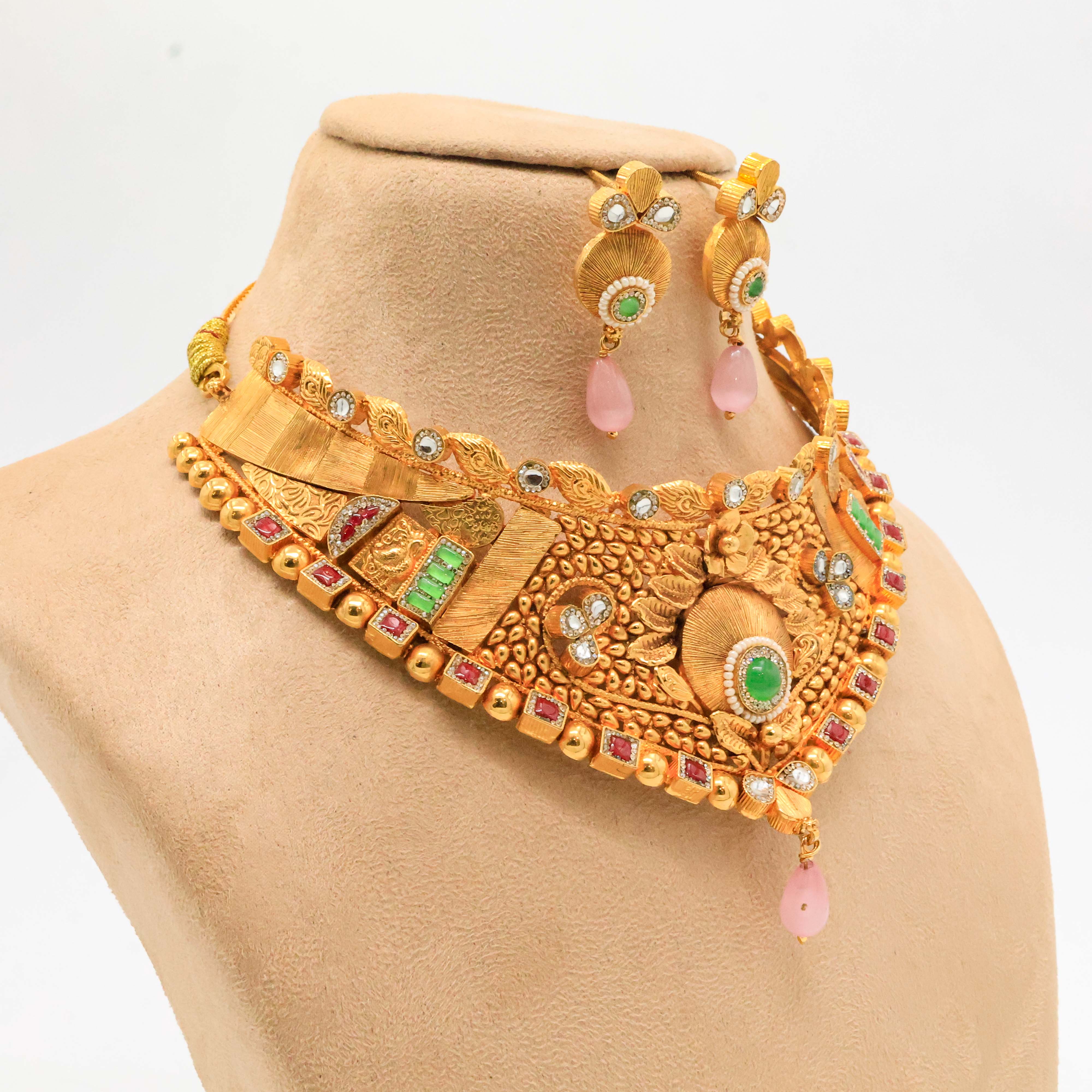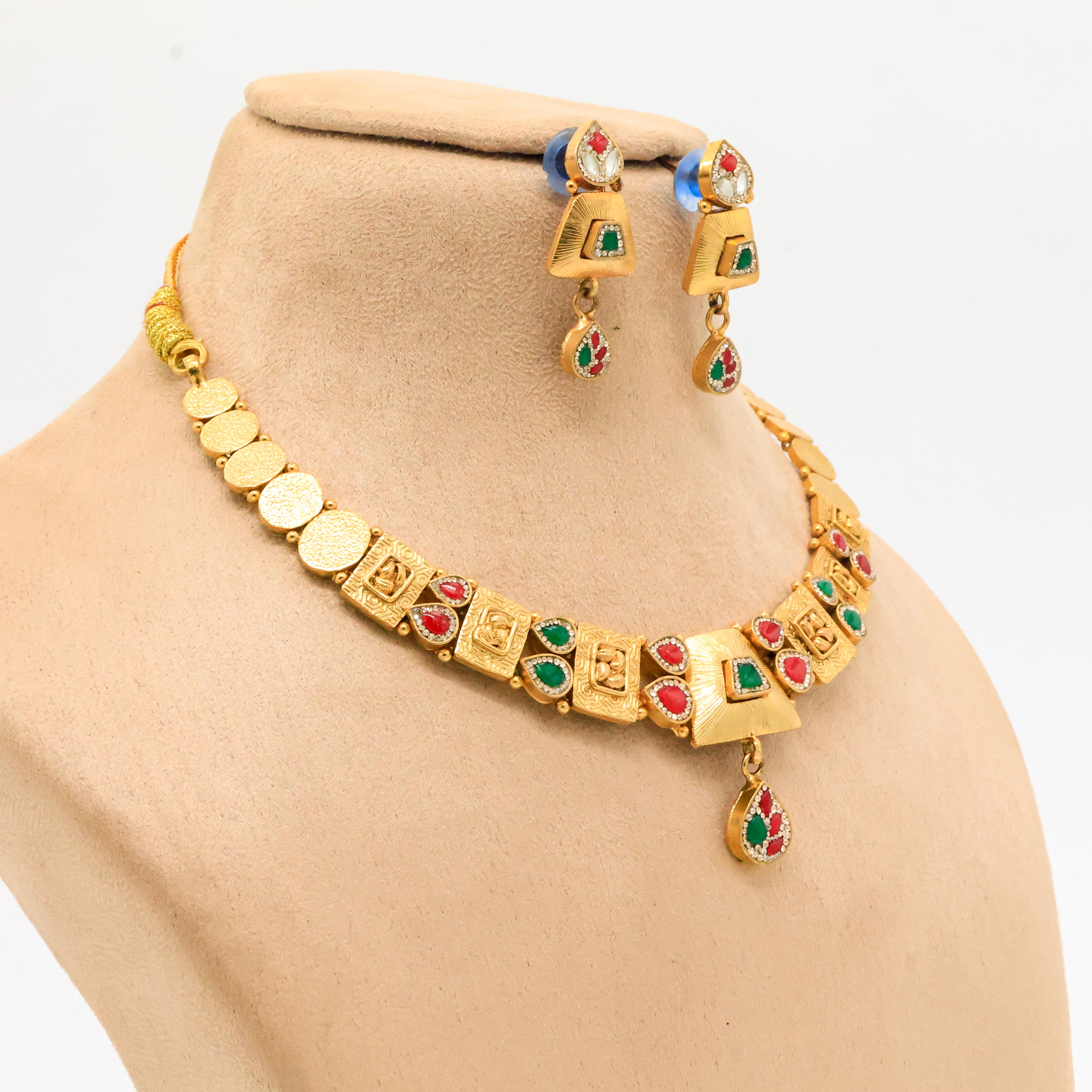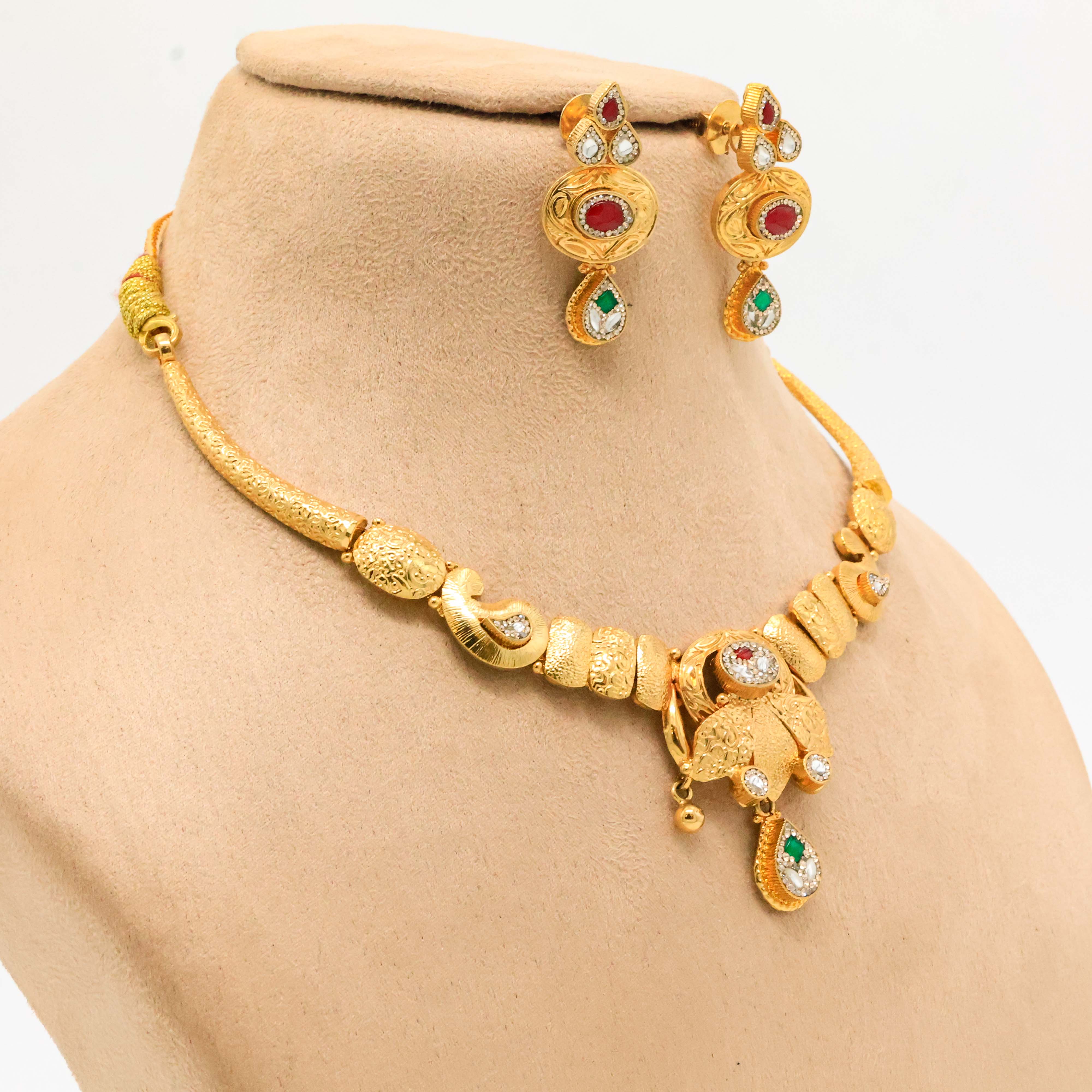 Elegant gold necklace set with red and green stones, perfect for weddings and festive occasions. Buy gold necklace set from Arham Jewellery in Hyderabad.