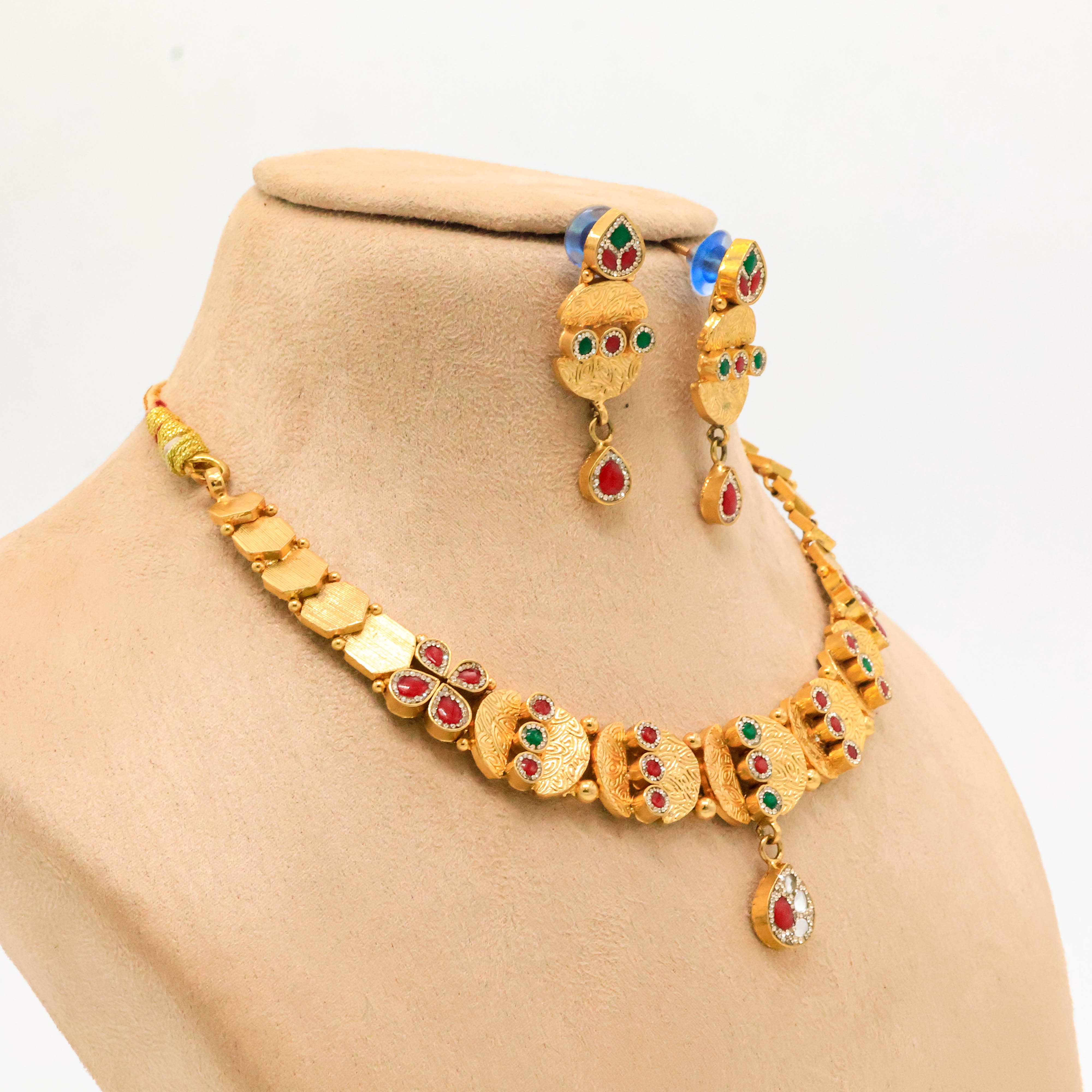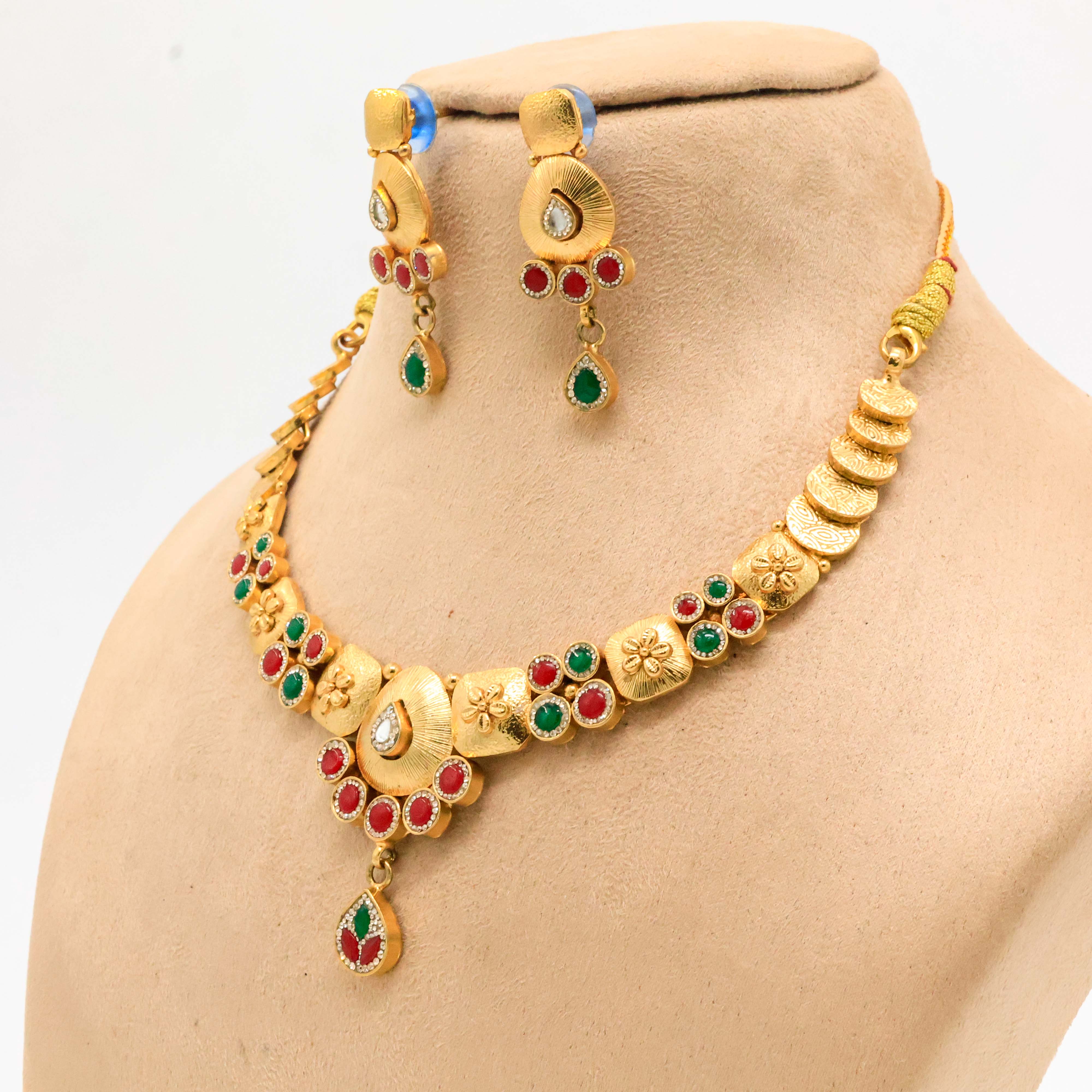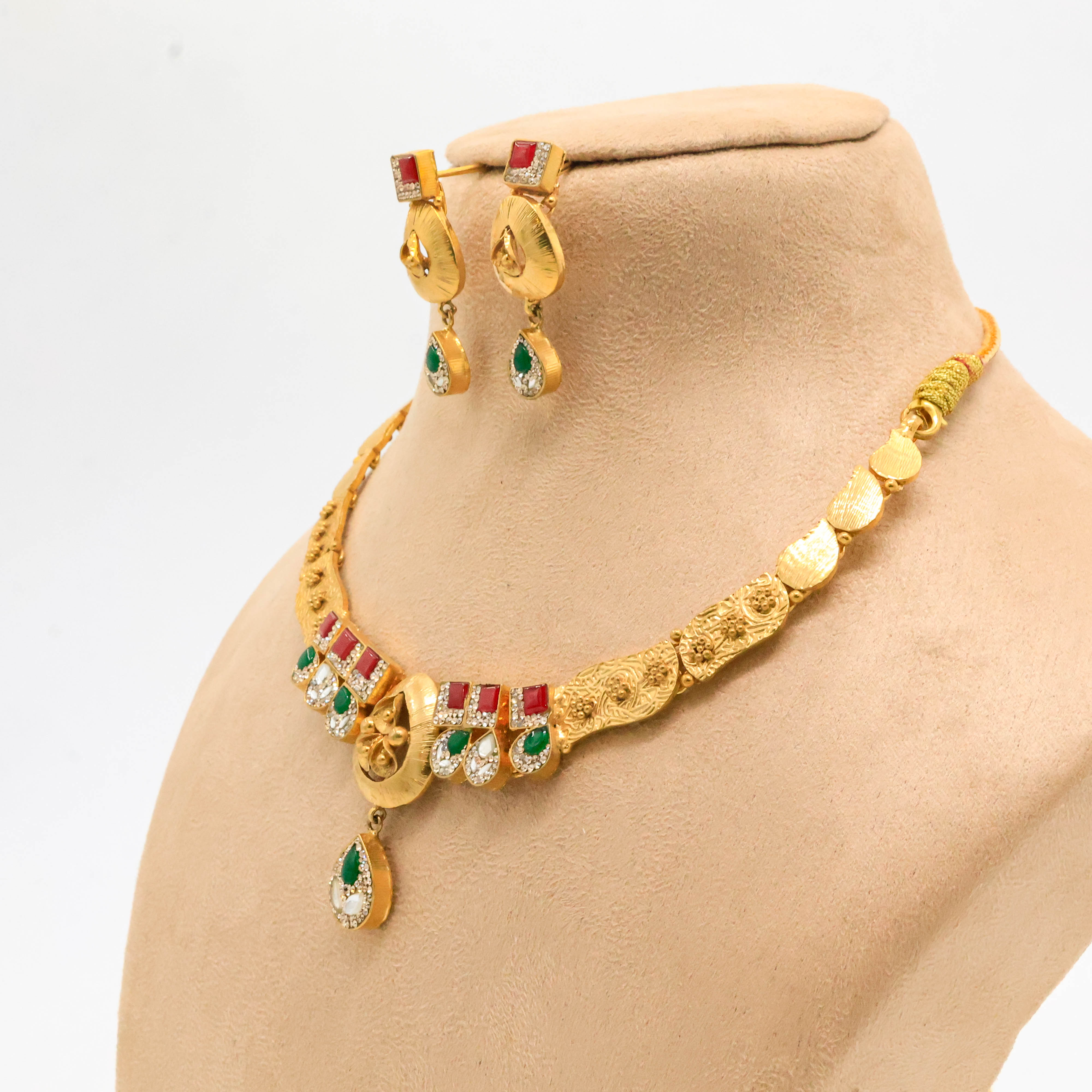 Elegant gold necklace set with red and green stones, perfect for weddings and festive occasions. Buy gold necklace set from Arham Jewellery in Hyderabad.