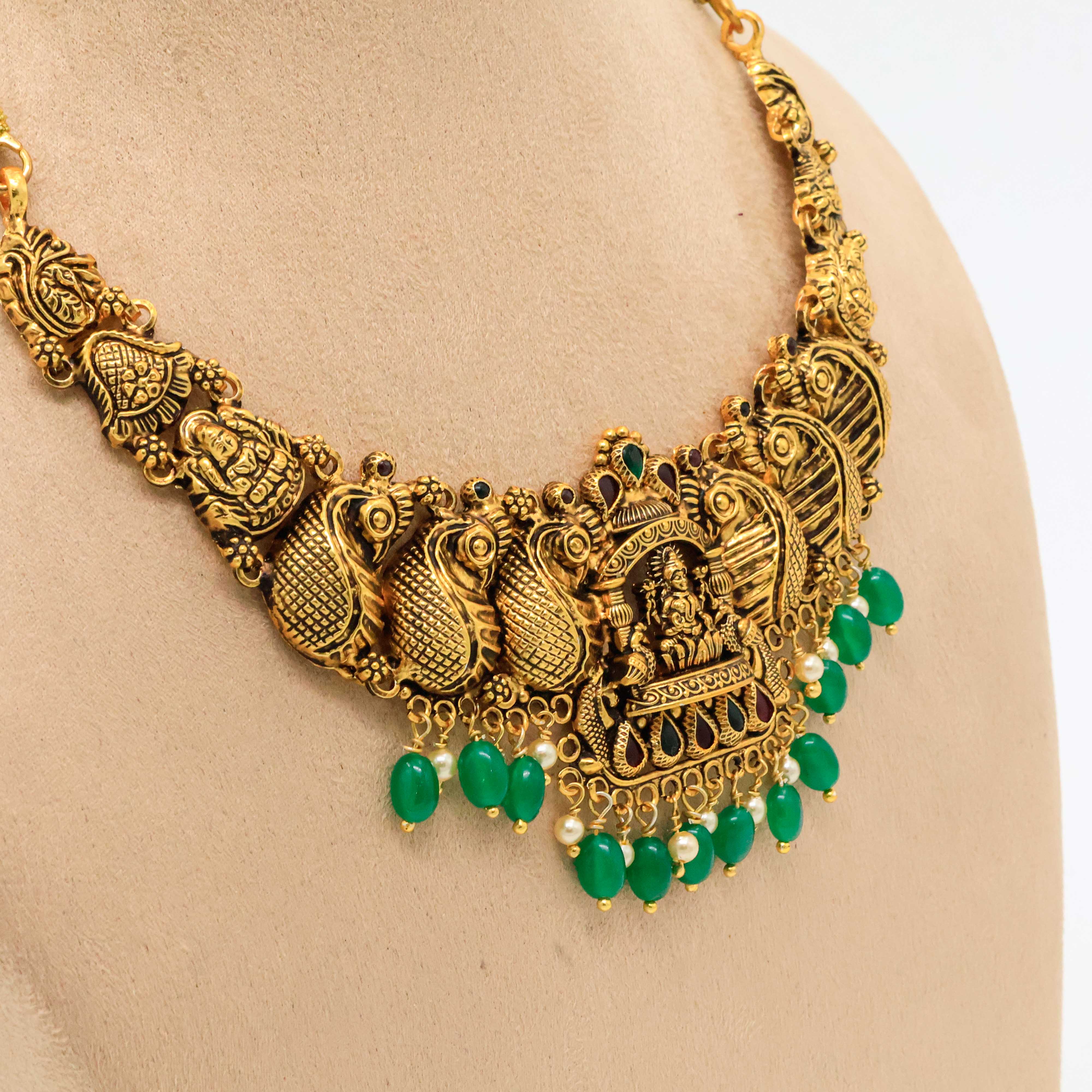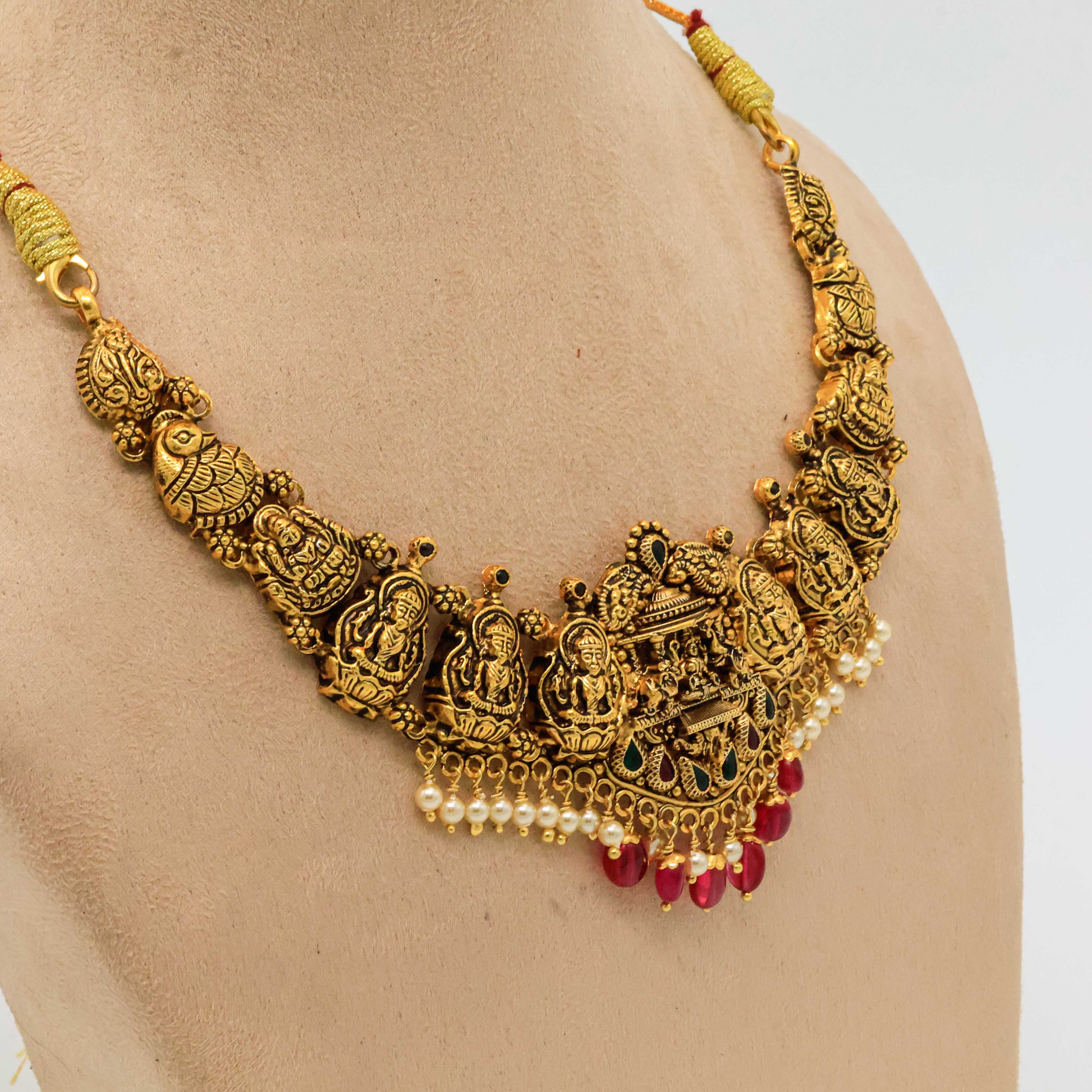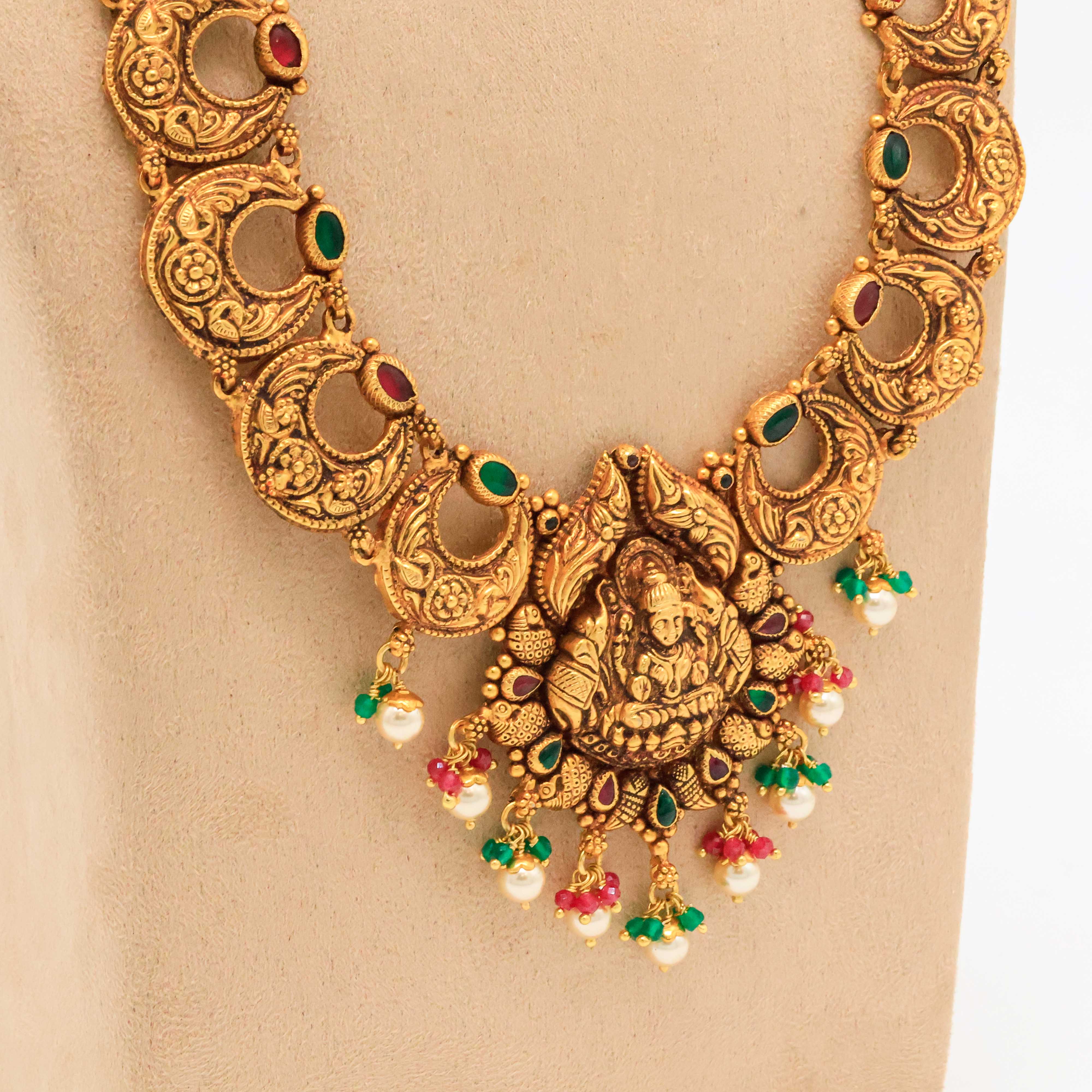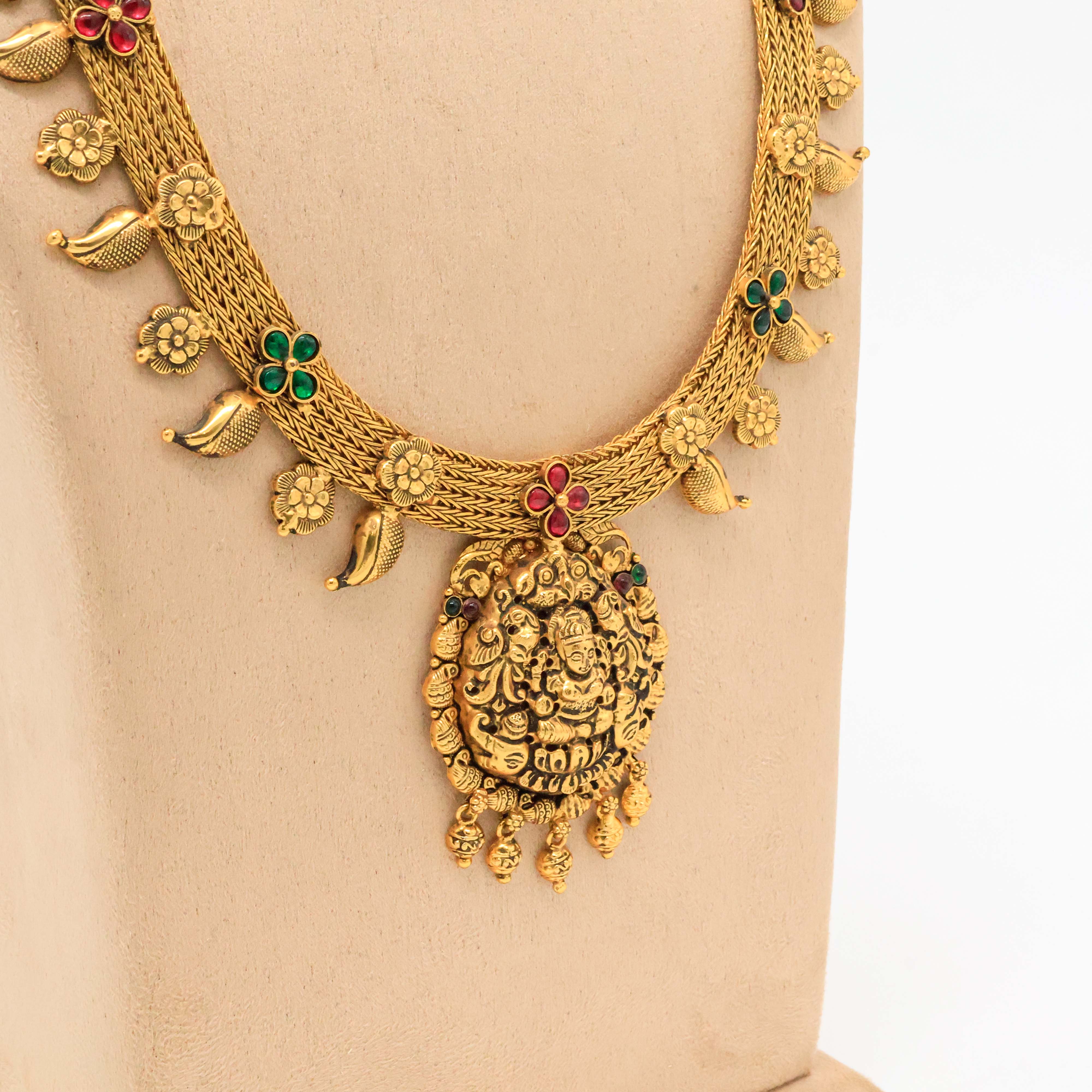 Antique gold temple necklace featuring traditional Indian design, perfect for weddings and cultural events. Buy Gold Temple Necklace from Arham Jewellery in Hyderabad.