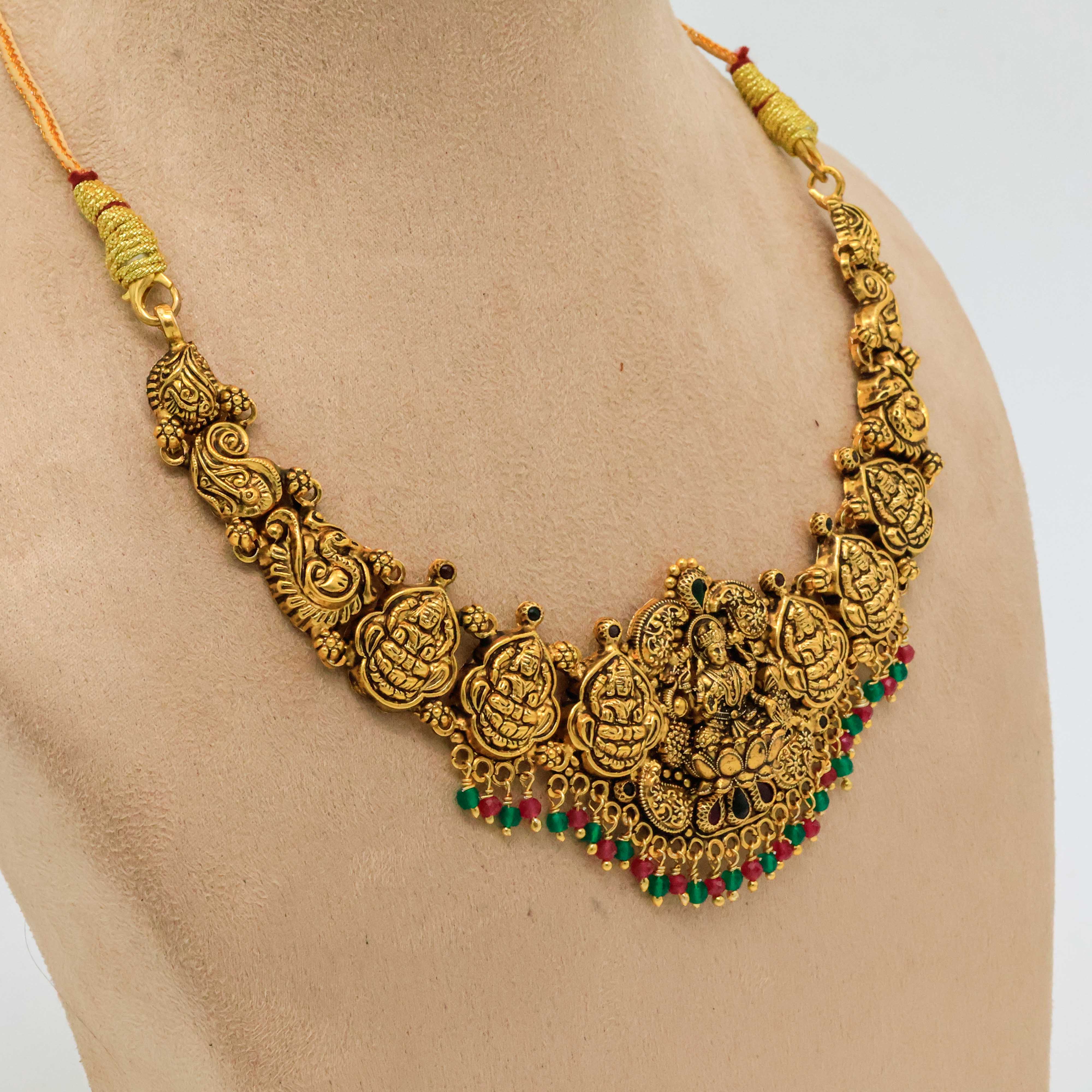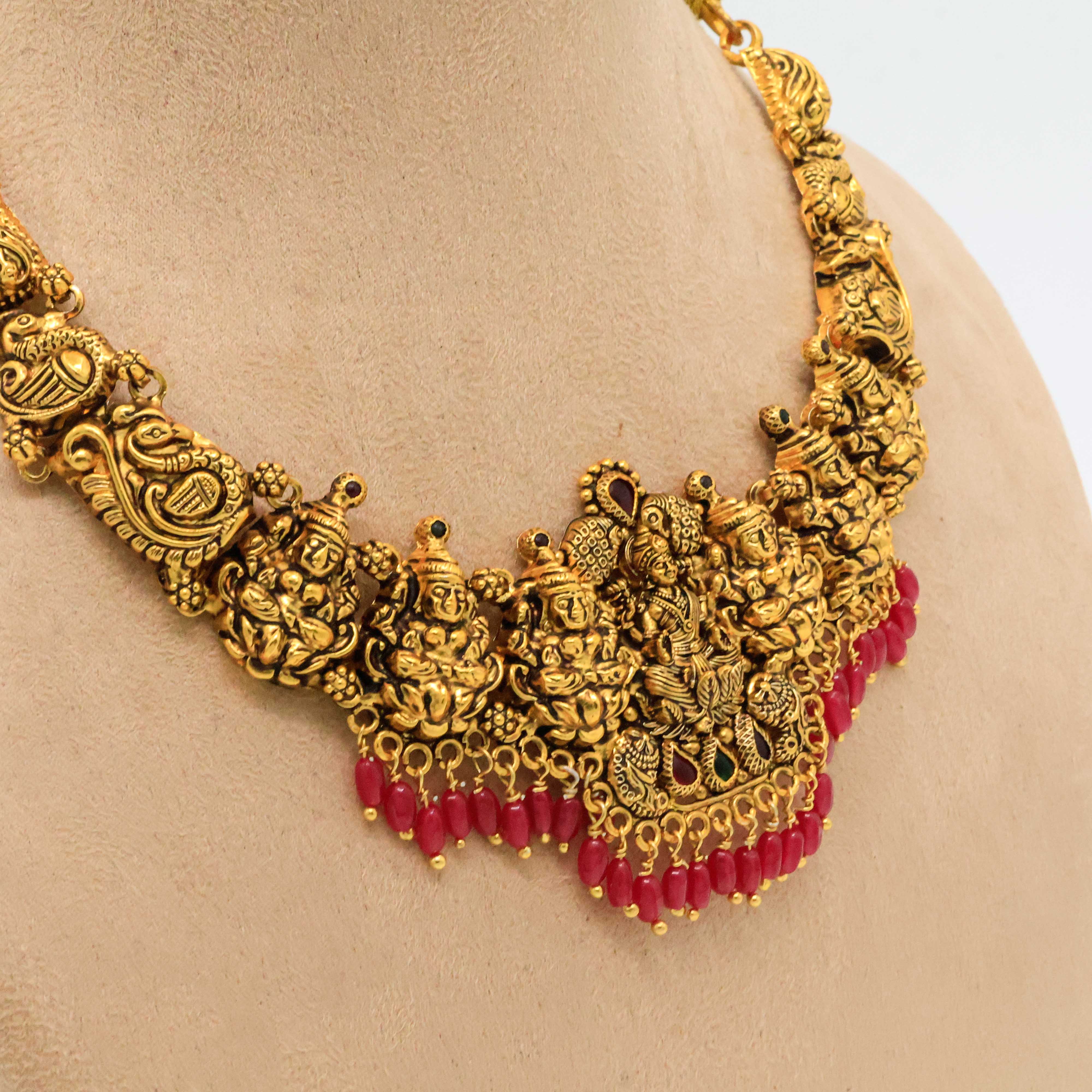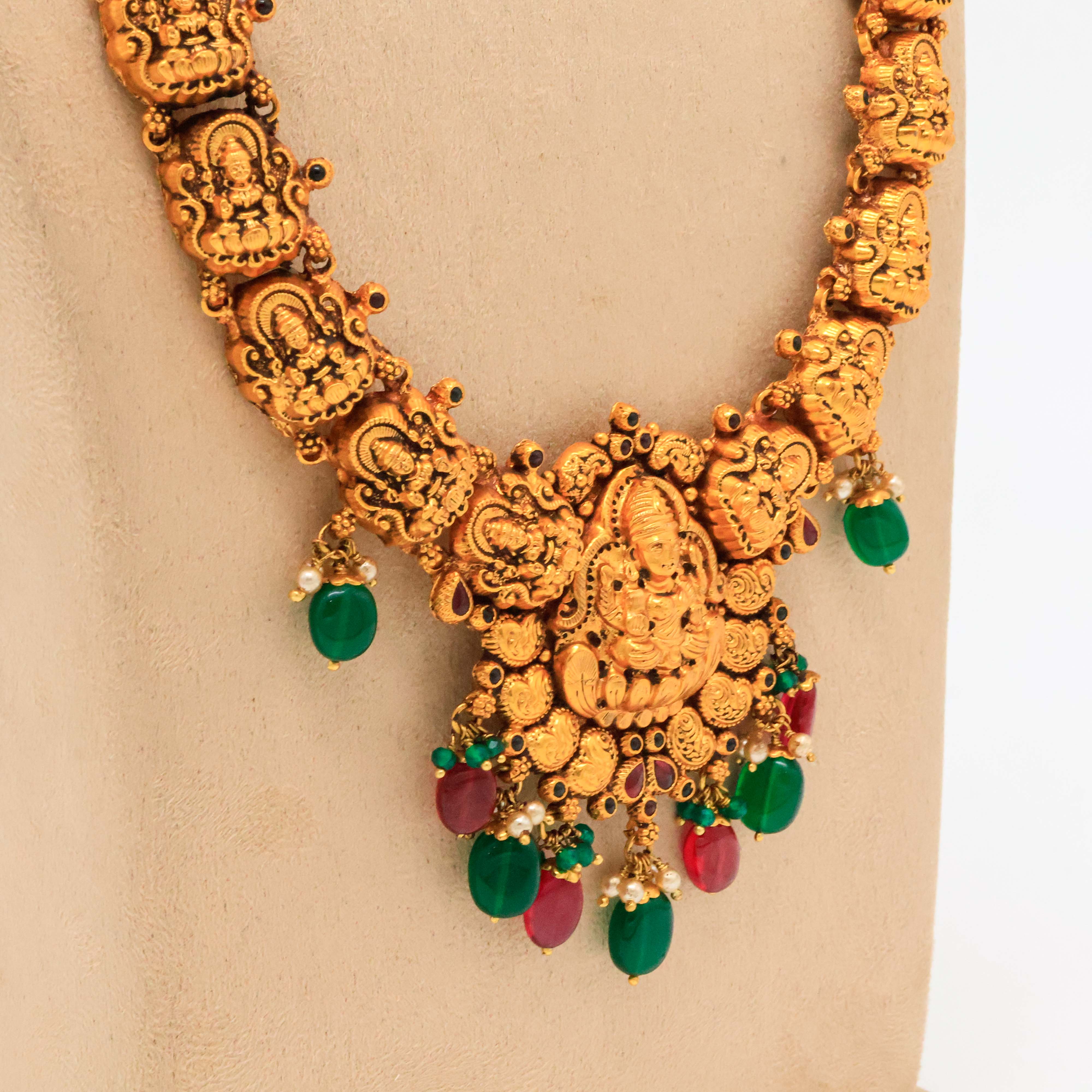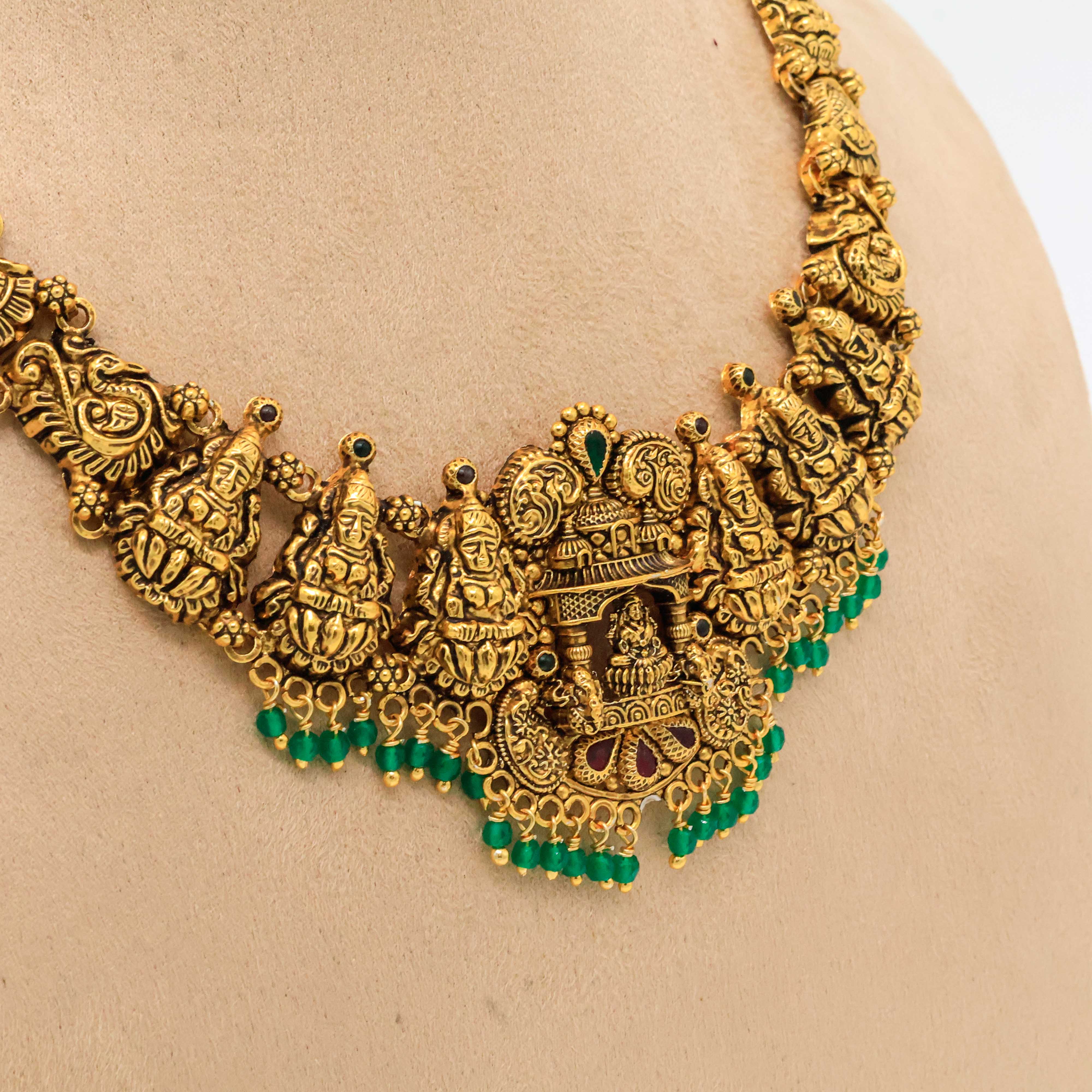 Antique gold temple necklace featuring traditional Indian design, perfect for weddings and cultural events. Buy Gold Temple Necklace from Arham Jewellery in Hyderabad.