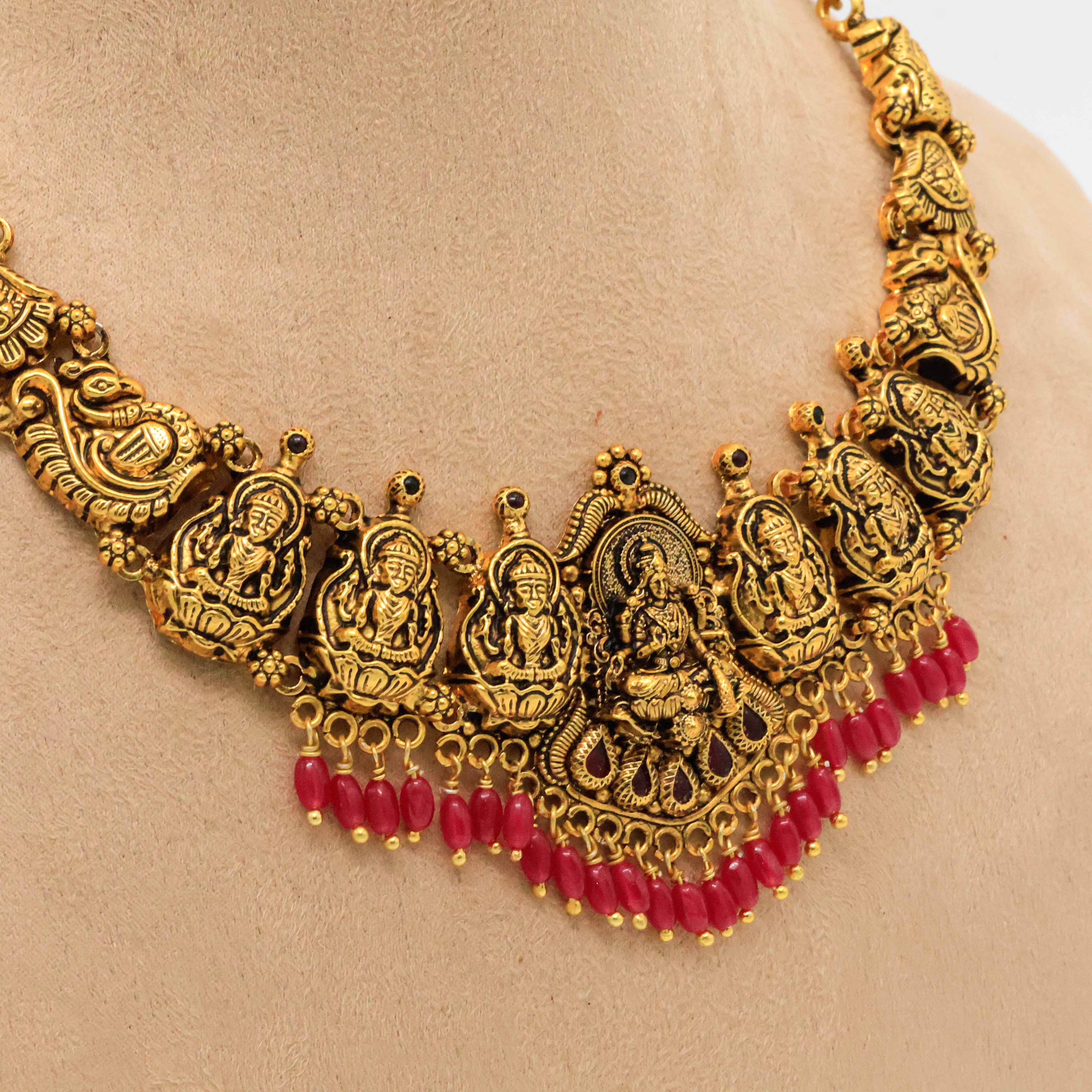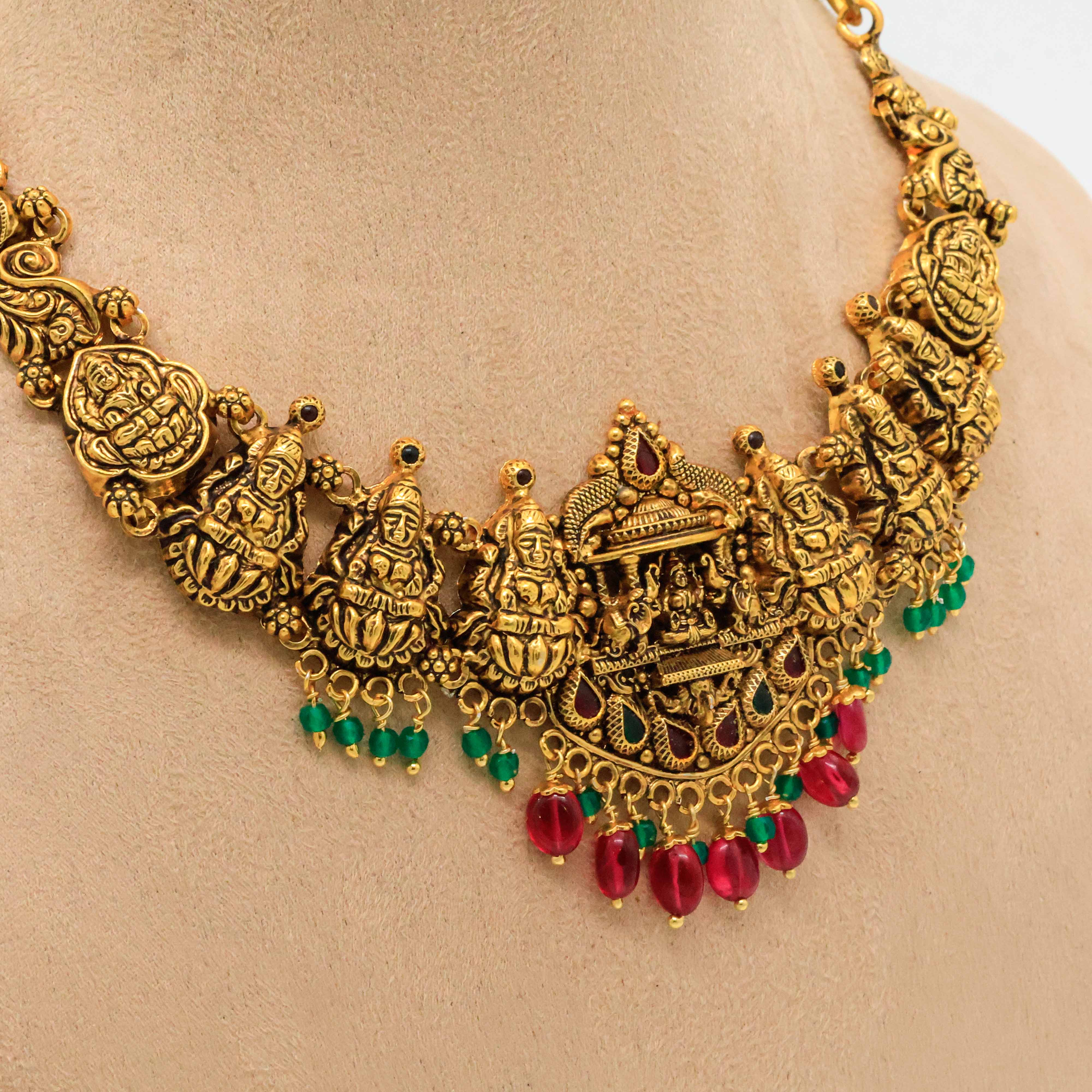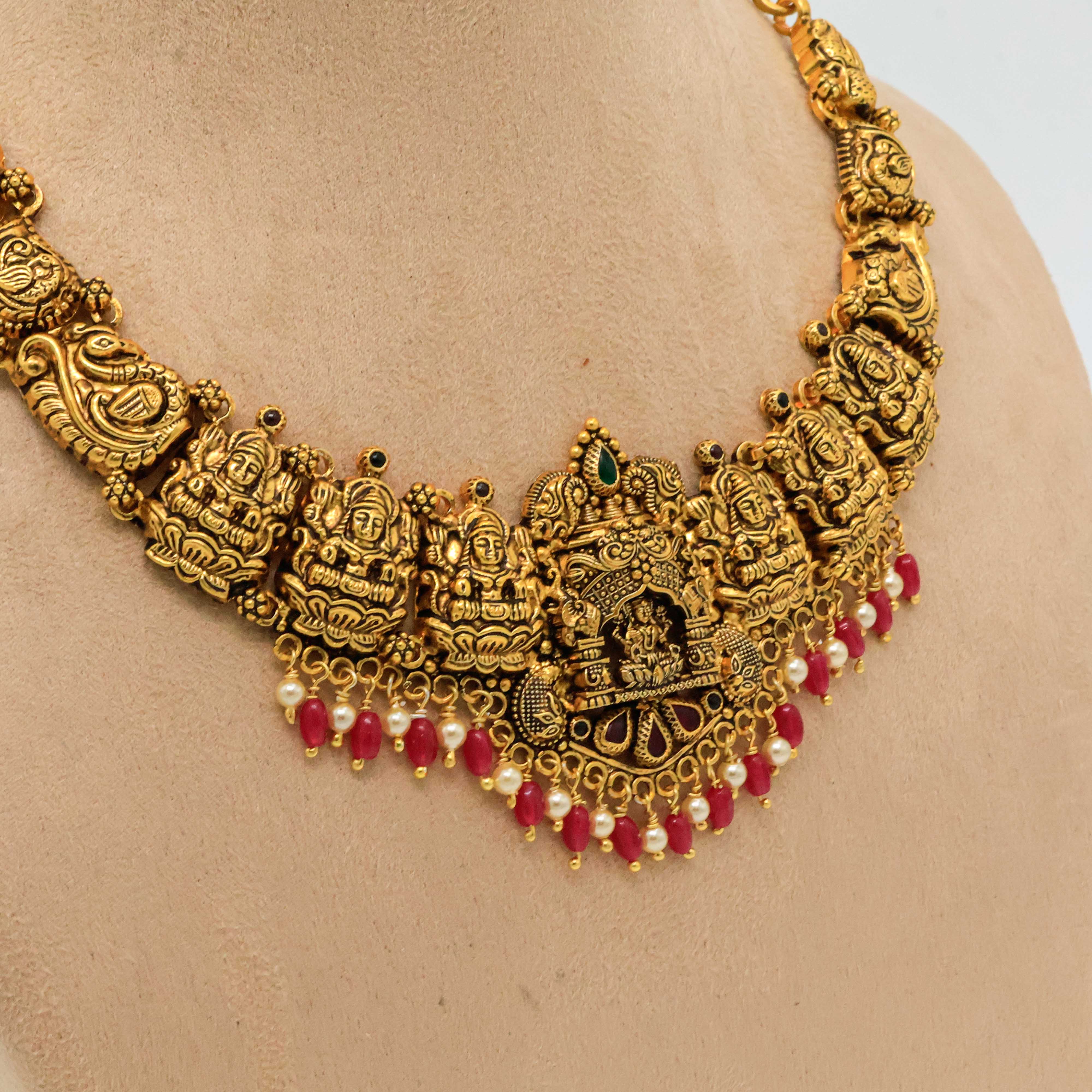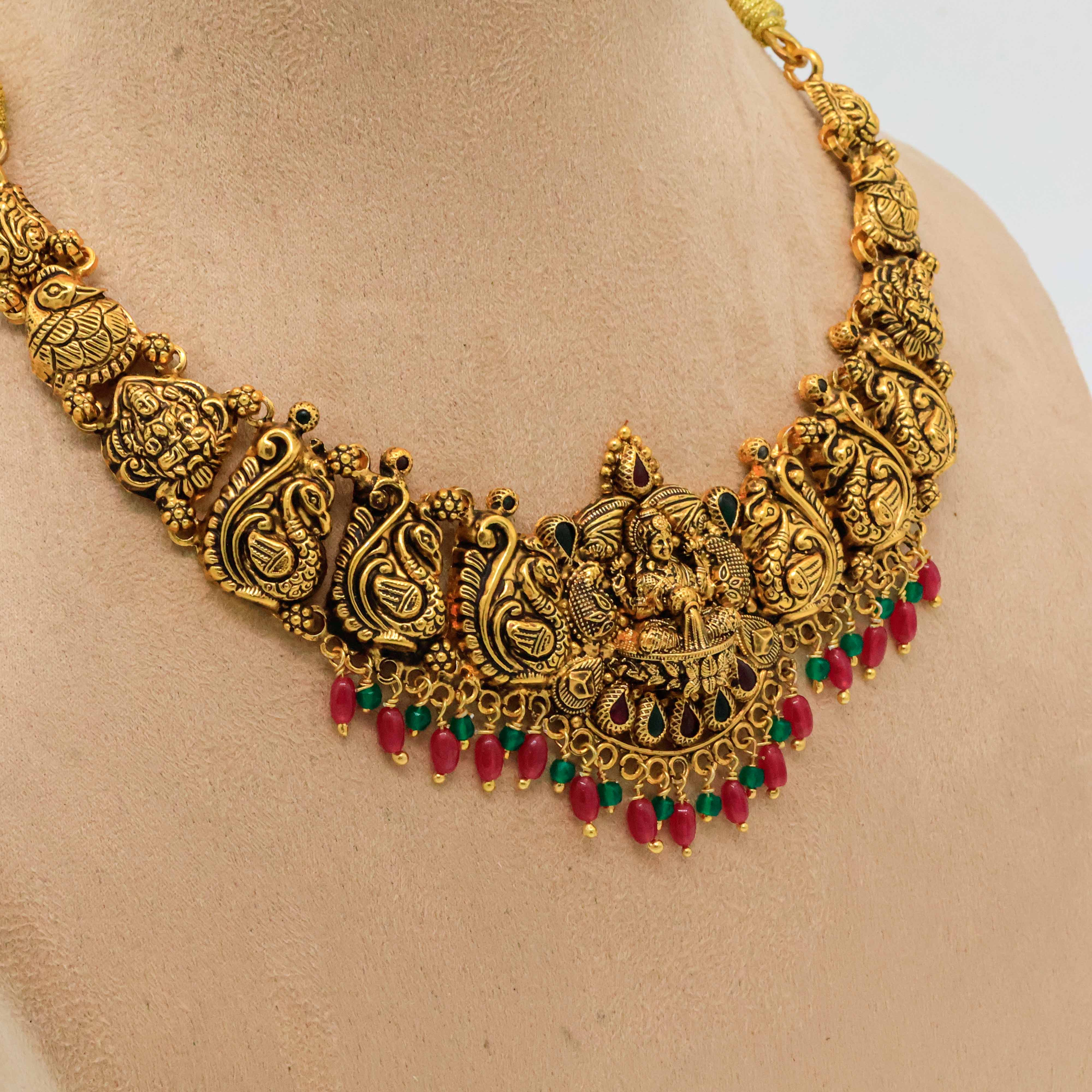 Antique gold temple necklace featuring traditional Indian design, perfect for weddings and cultural events. Buy Gold Temple Necklace from Arham Jewellery in Hyderabad.