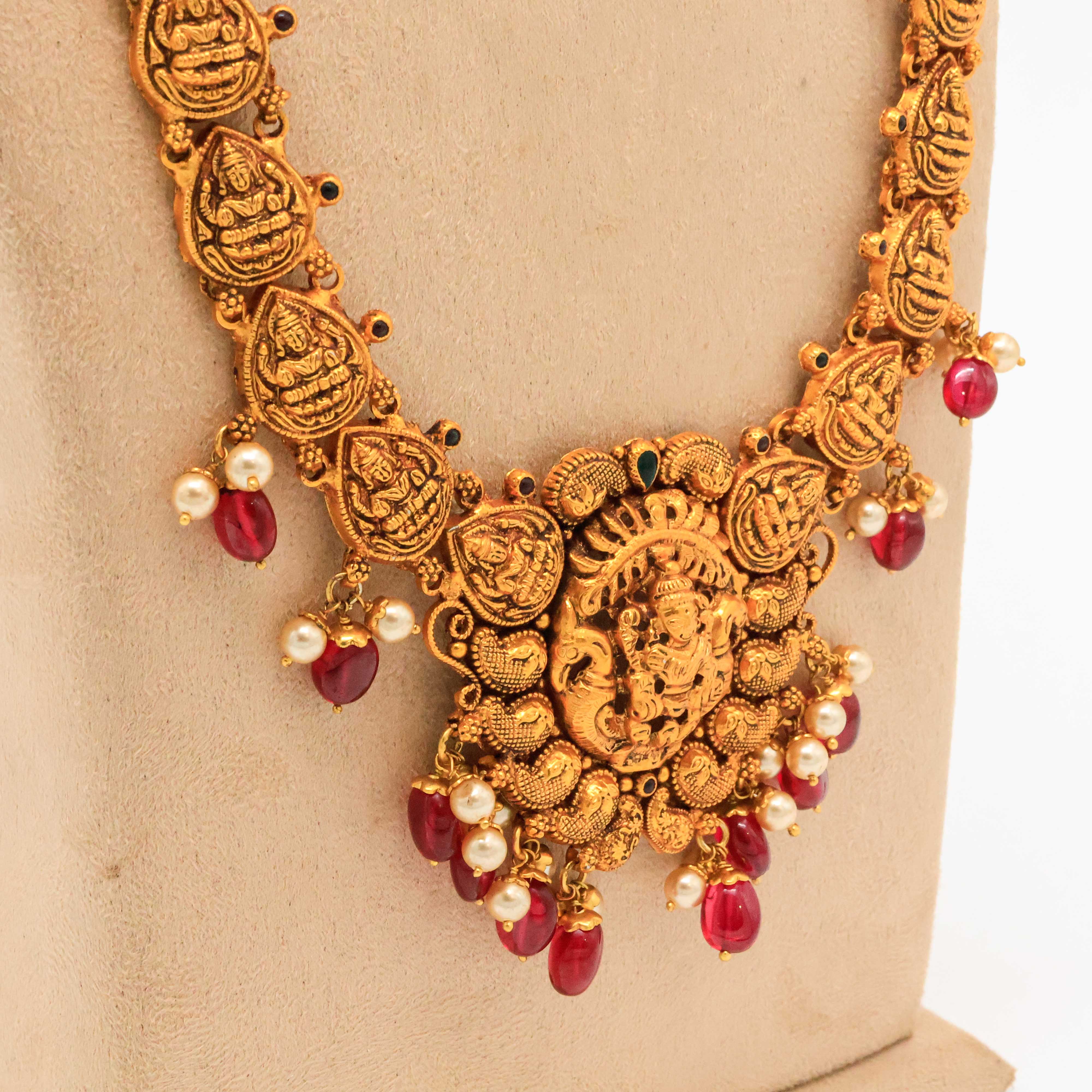 Ornate gold Lakshmi necklace featuring ruby and pearl accents, perfect for weddings and traditional events. Buy gold Lakshmi necklace from Arham Jewellery in Hyderabad.