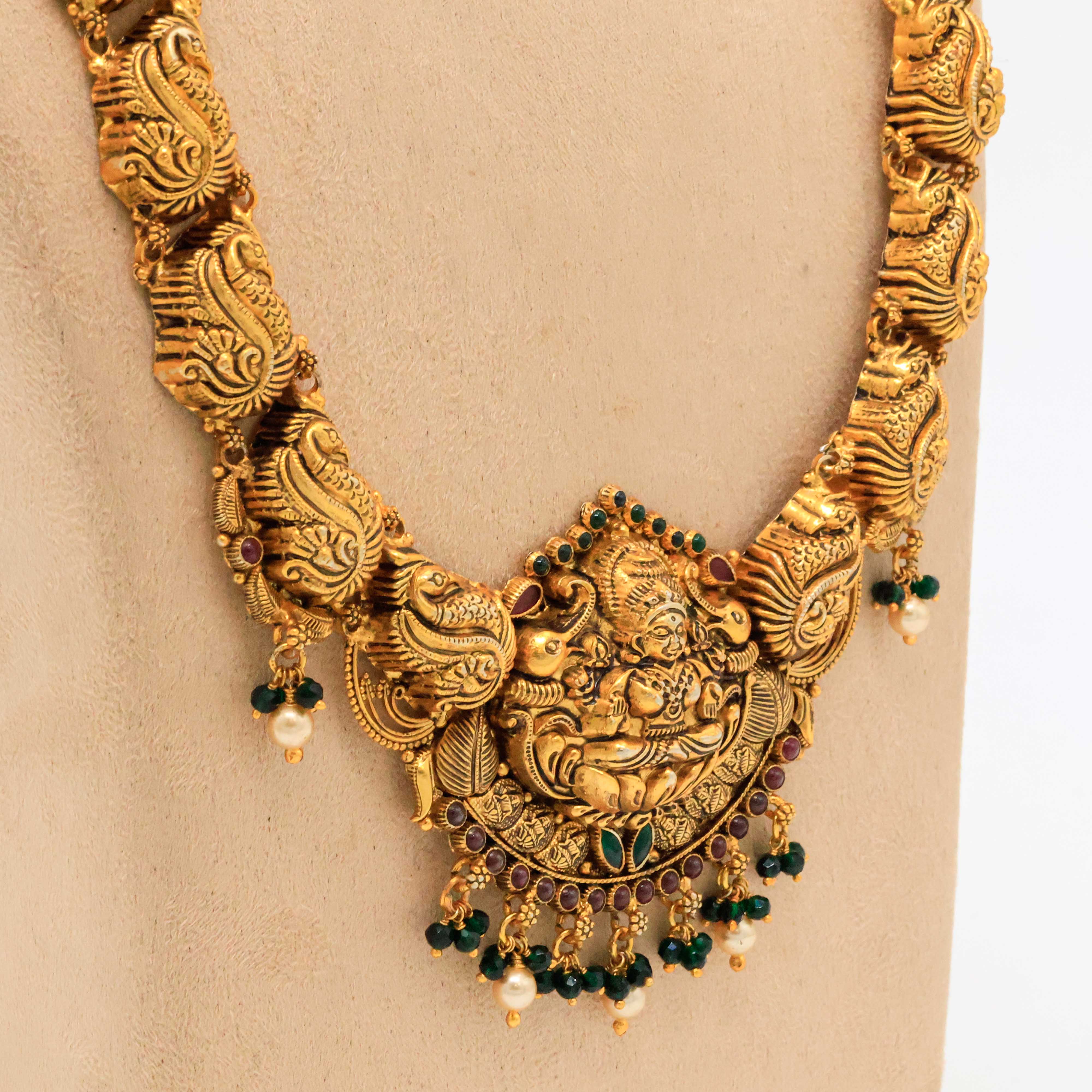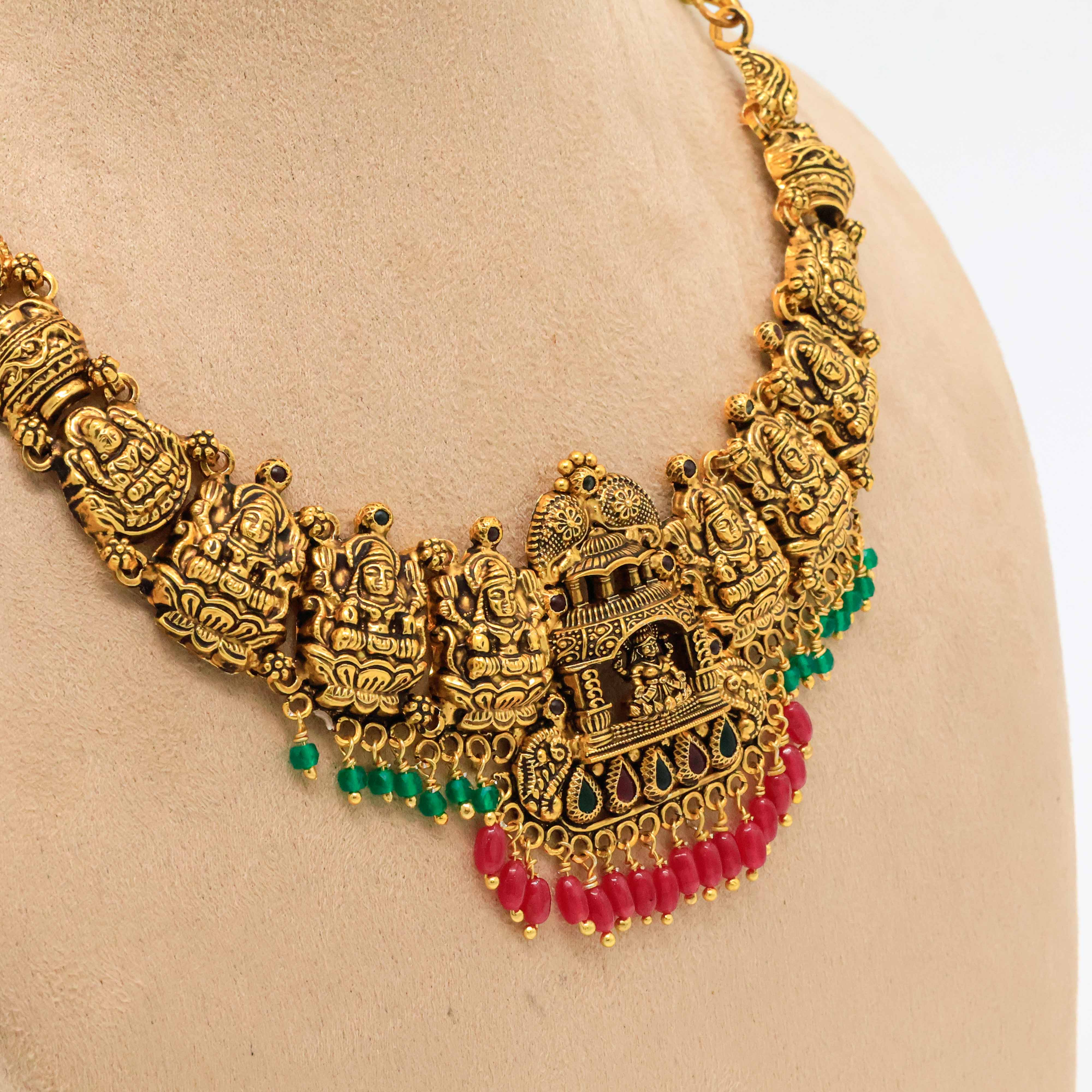 Antique gold temple necklace with goddess Lakshmi motifs. Perfect for traditional occasions. Buy gold temple necklace from Arham Jewellery in Hyderabad.