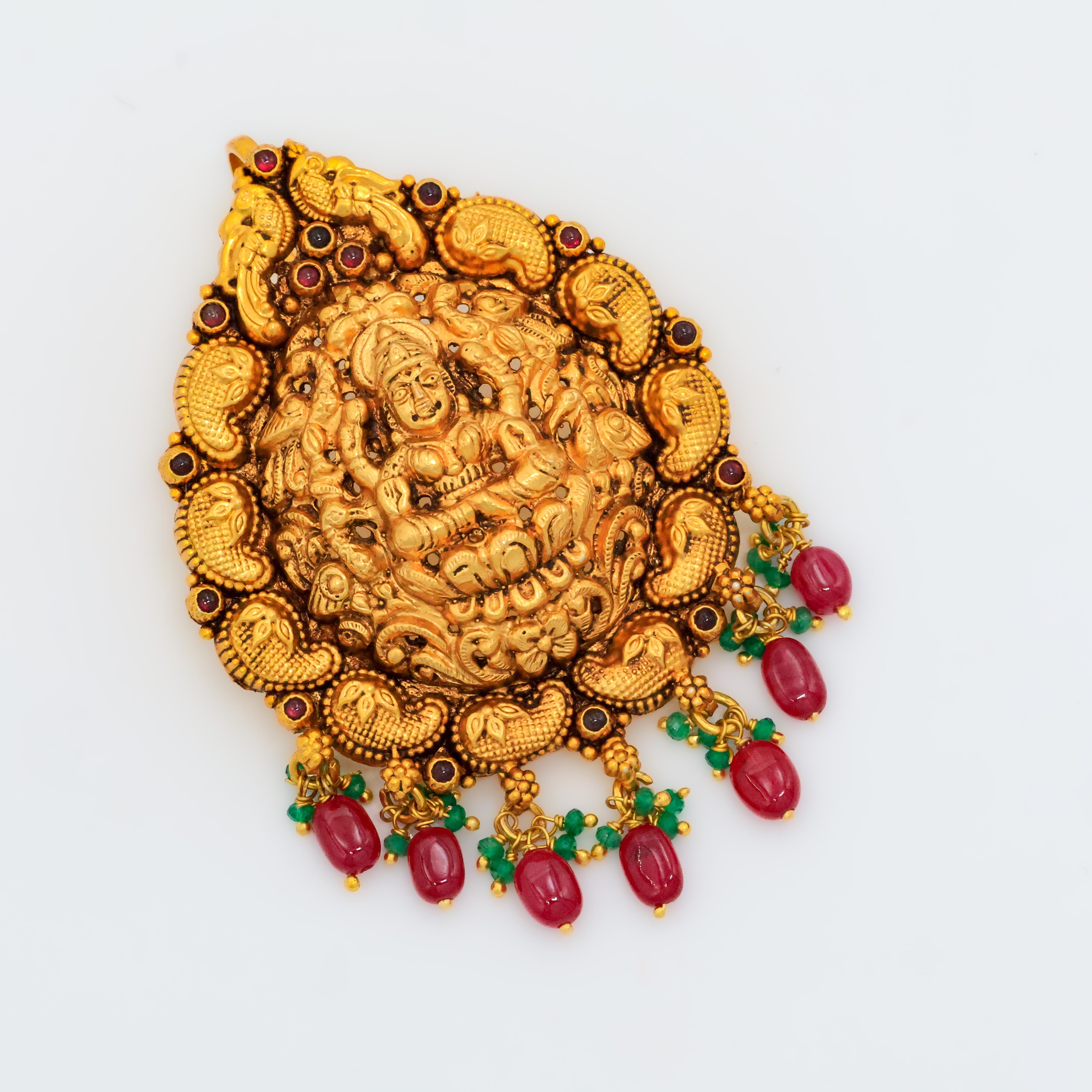 Ornate gold Lakshmi pendant with ruby and emerald accents. A traditional piece to elevate any outfit. Buy Gold Lakshmi Pendant from Arham Jewellery in Hyderabad.