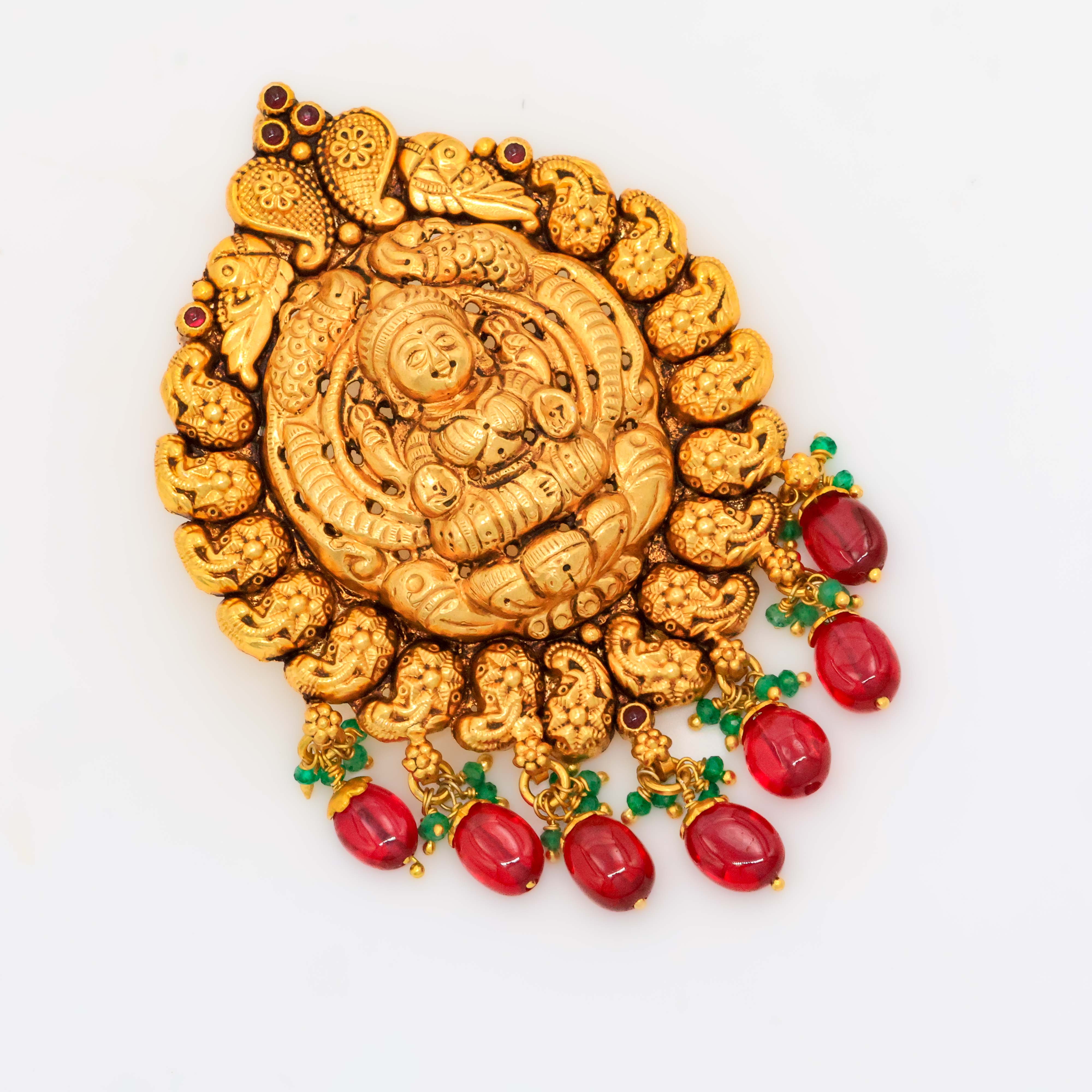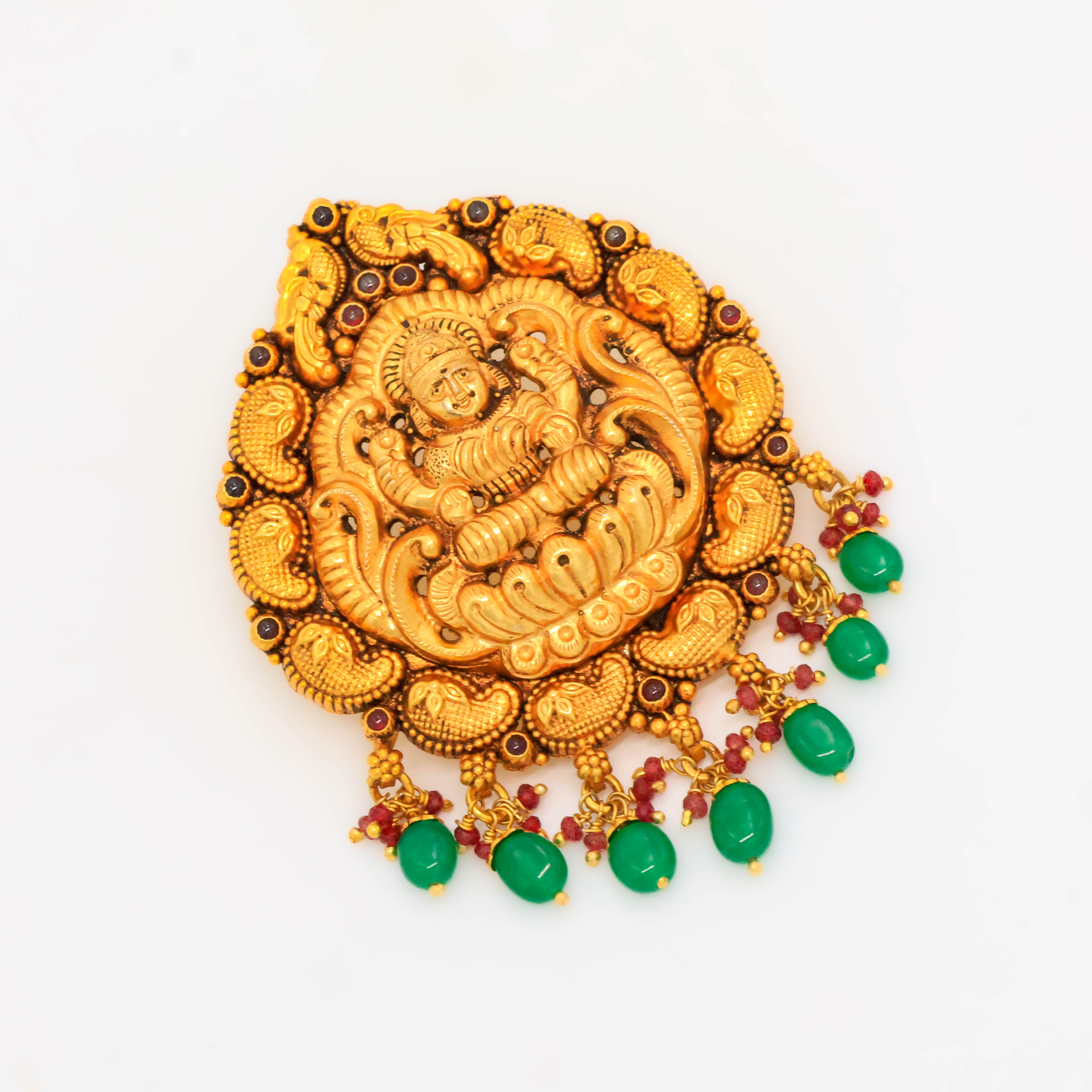 Ornate gold Lakshmi pendant featuring intricate detailing, perfect for religious occasions and traditional wear. Buy gold Lakshmi pendant from Arham Jewellery in Hyderabad.