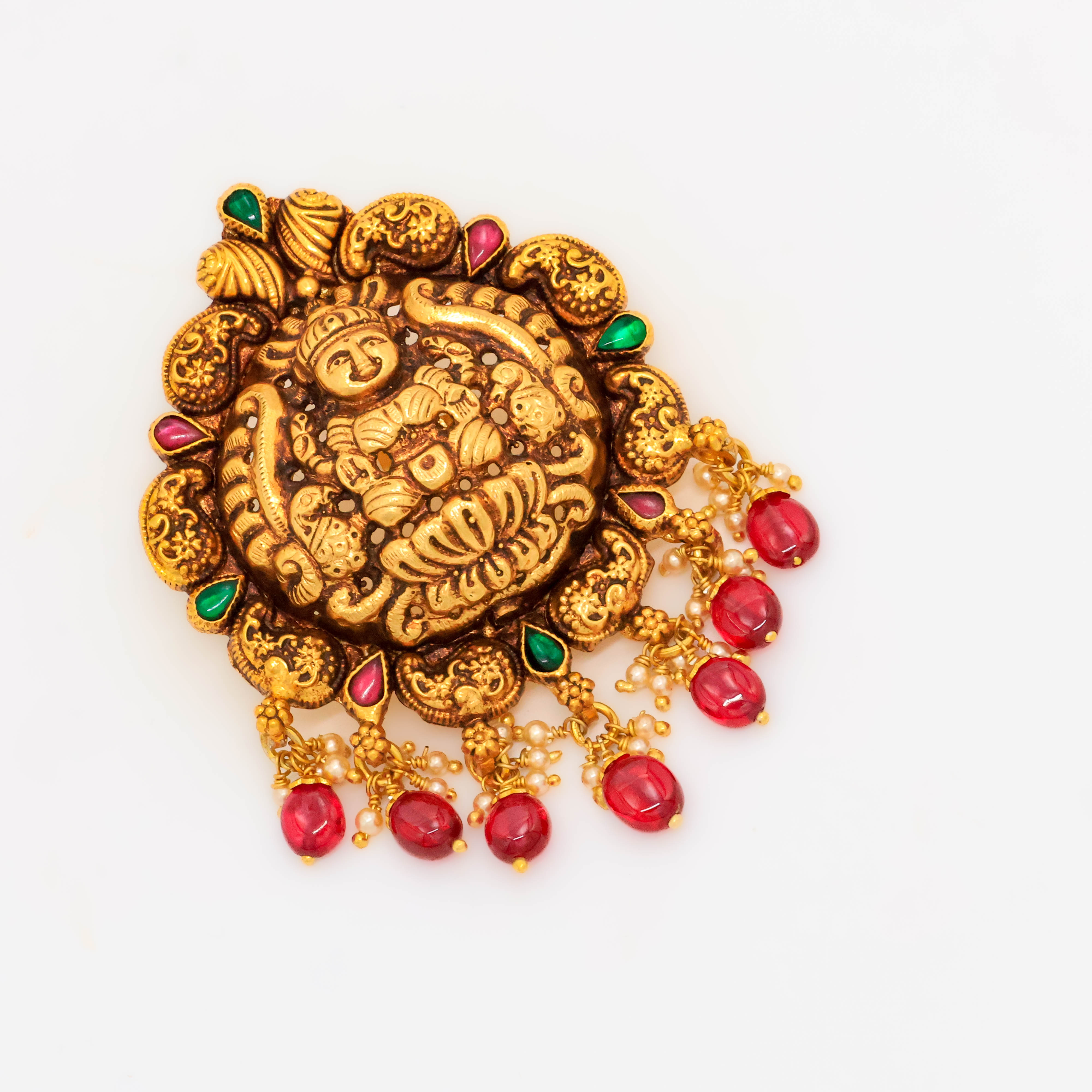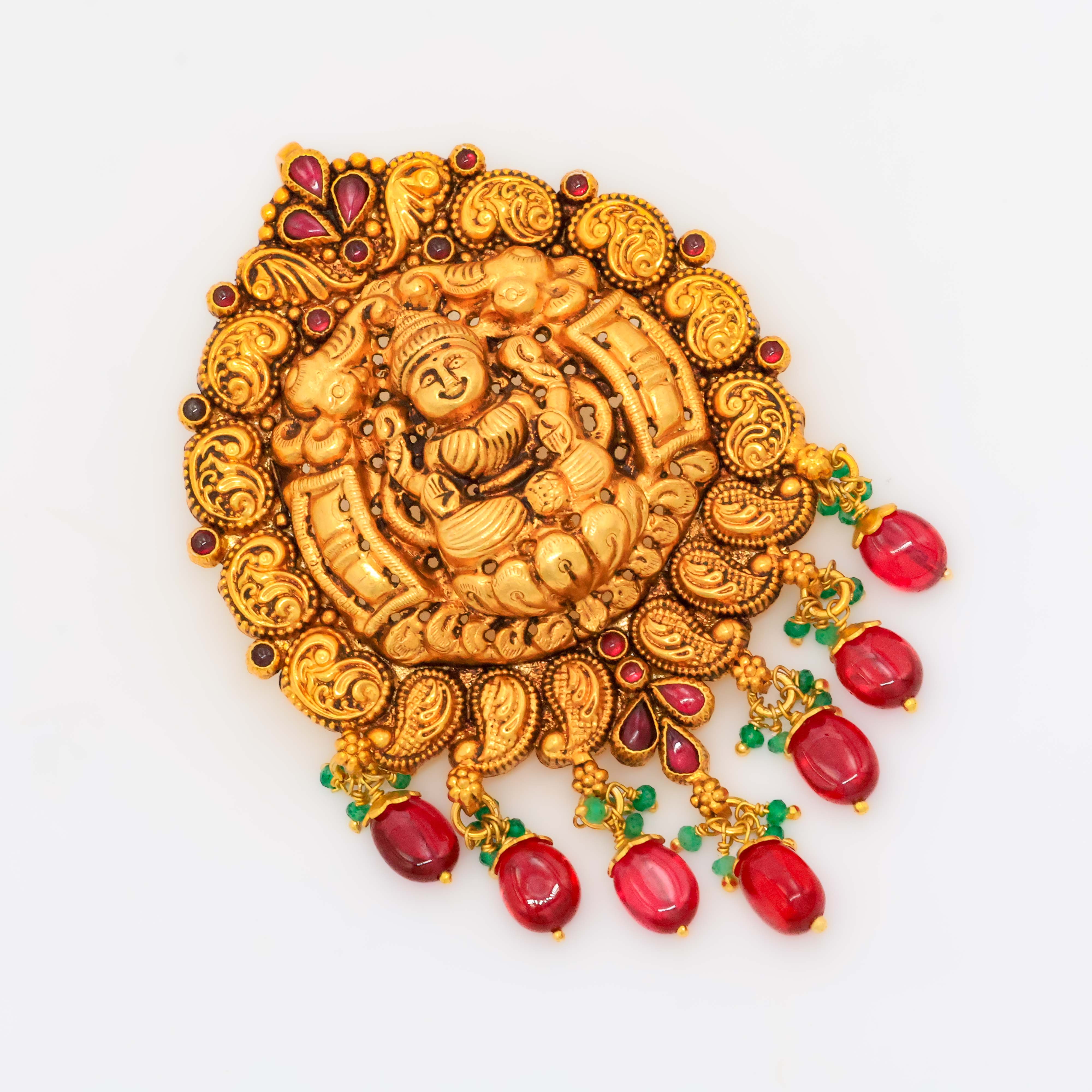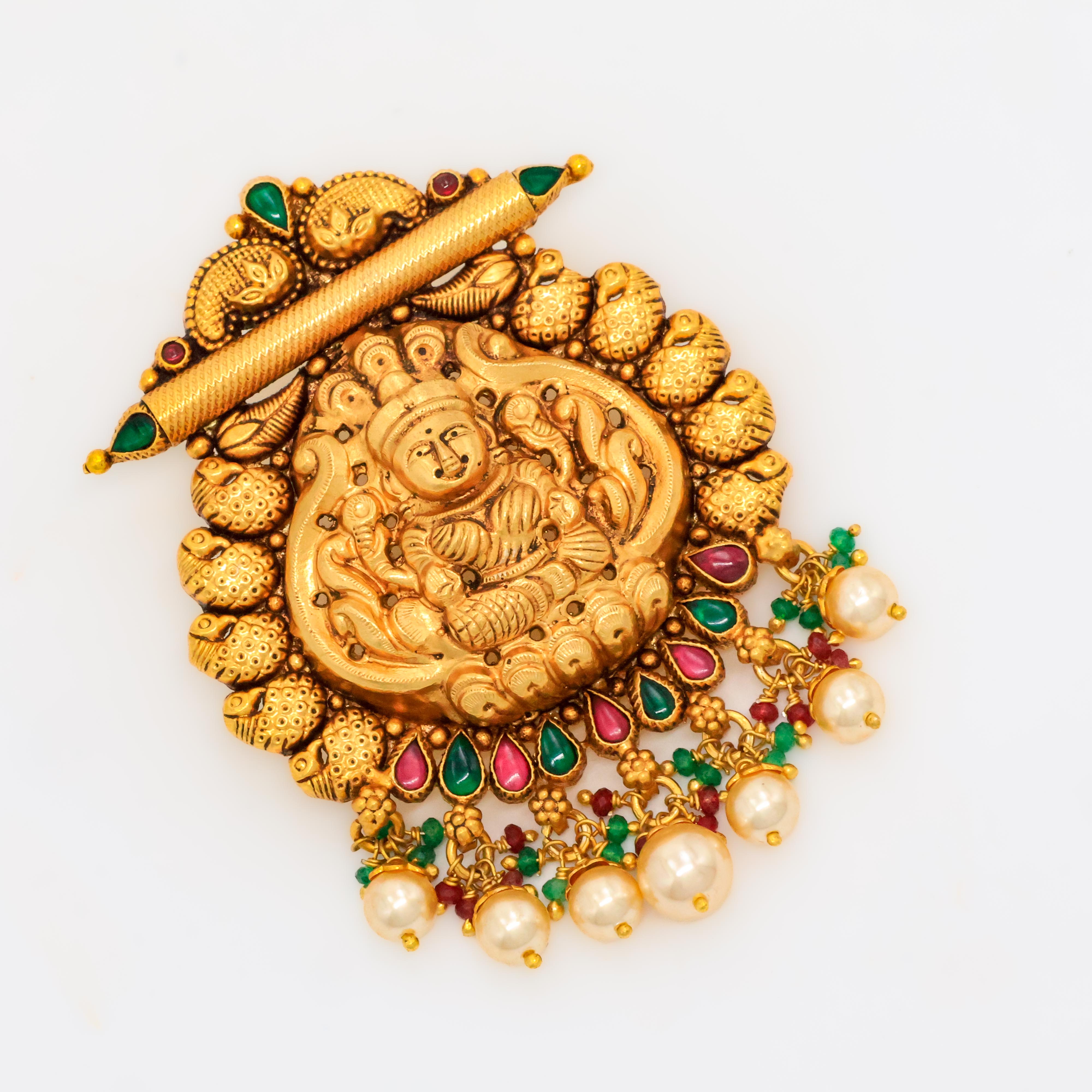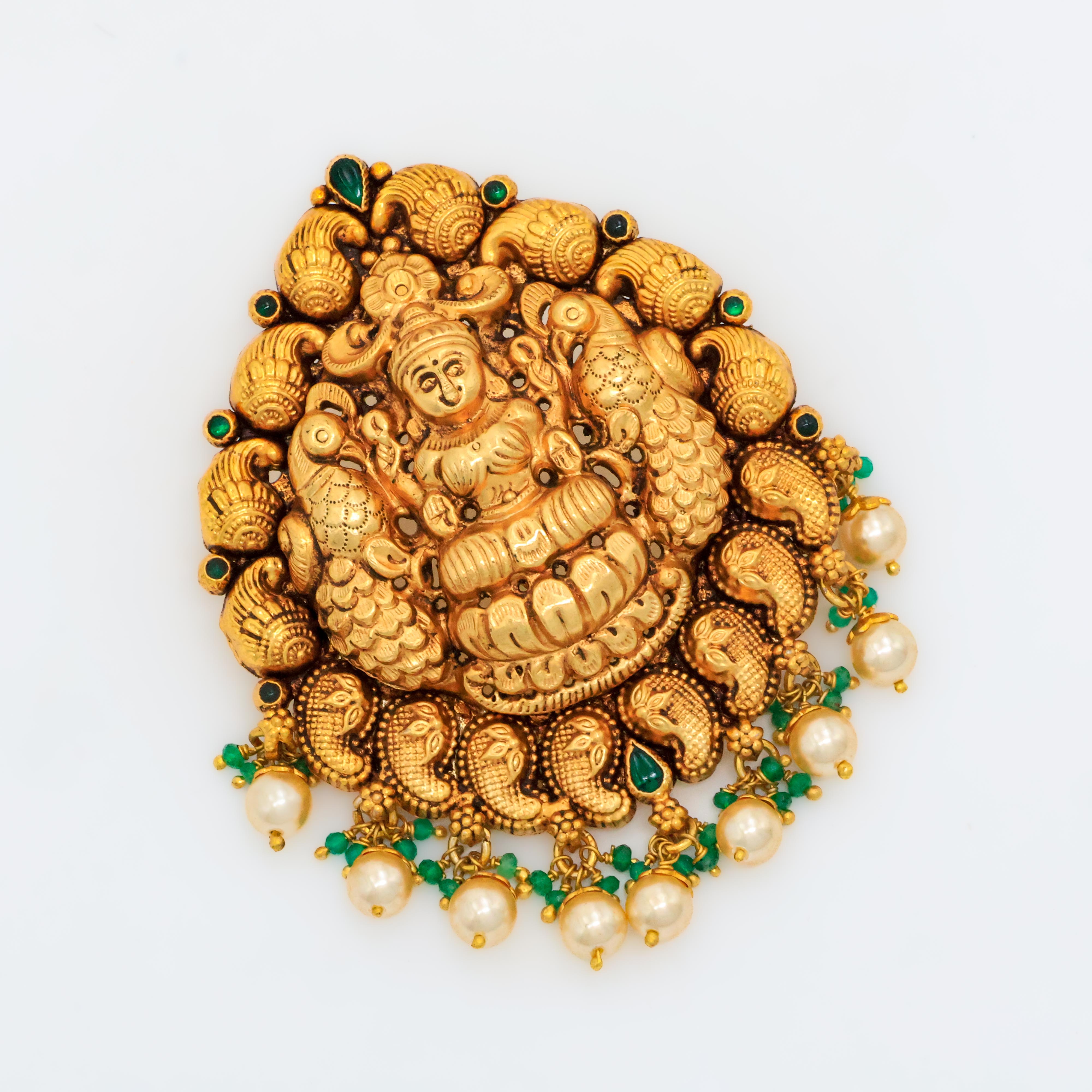 Ornate gold Lakshmi pendant with pearl drops, perfect for traditional occasions and festivals. Buy gold Lakshmi pendant from Arham Jewellery in Hyderabad.