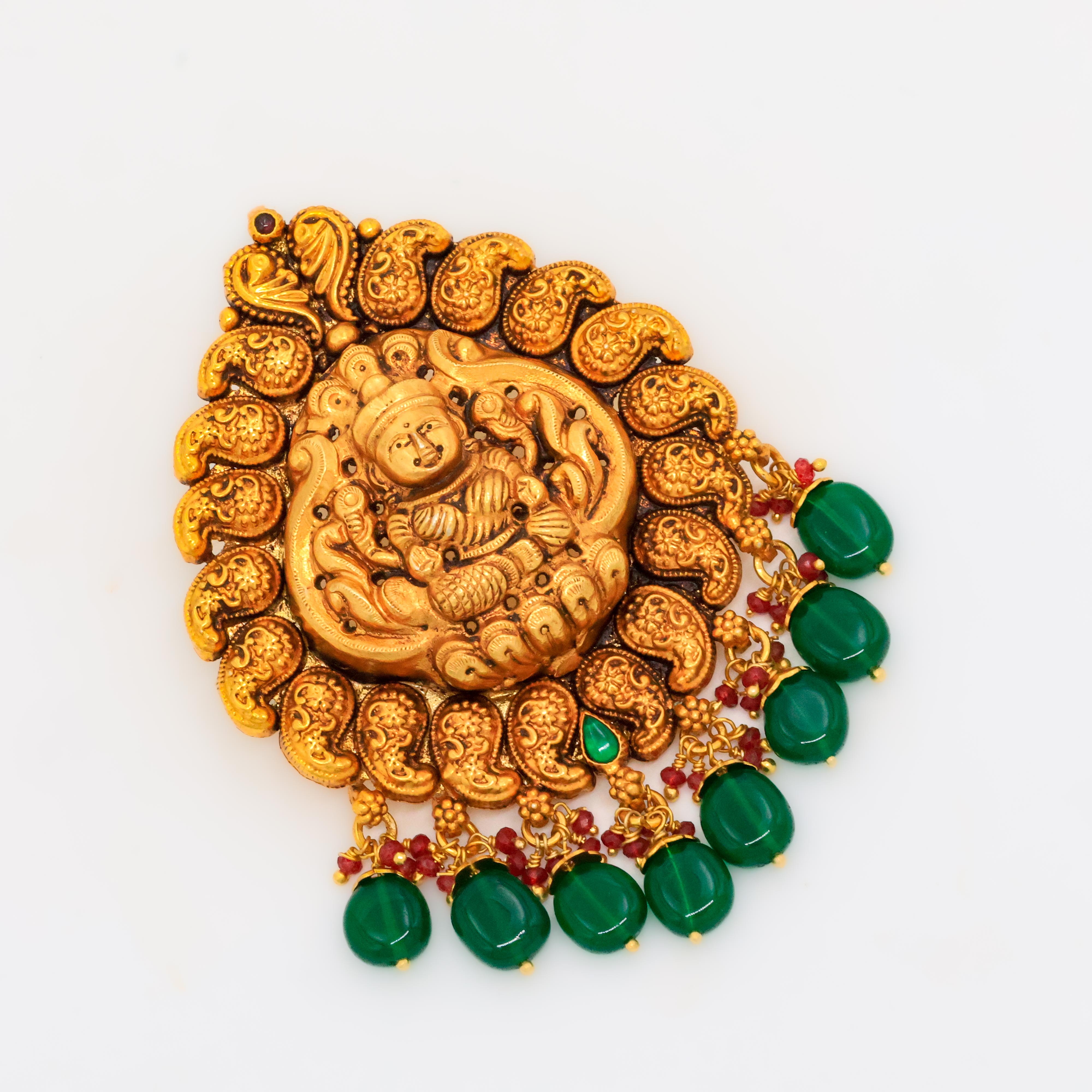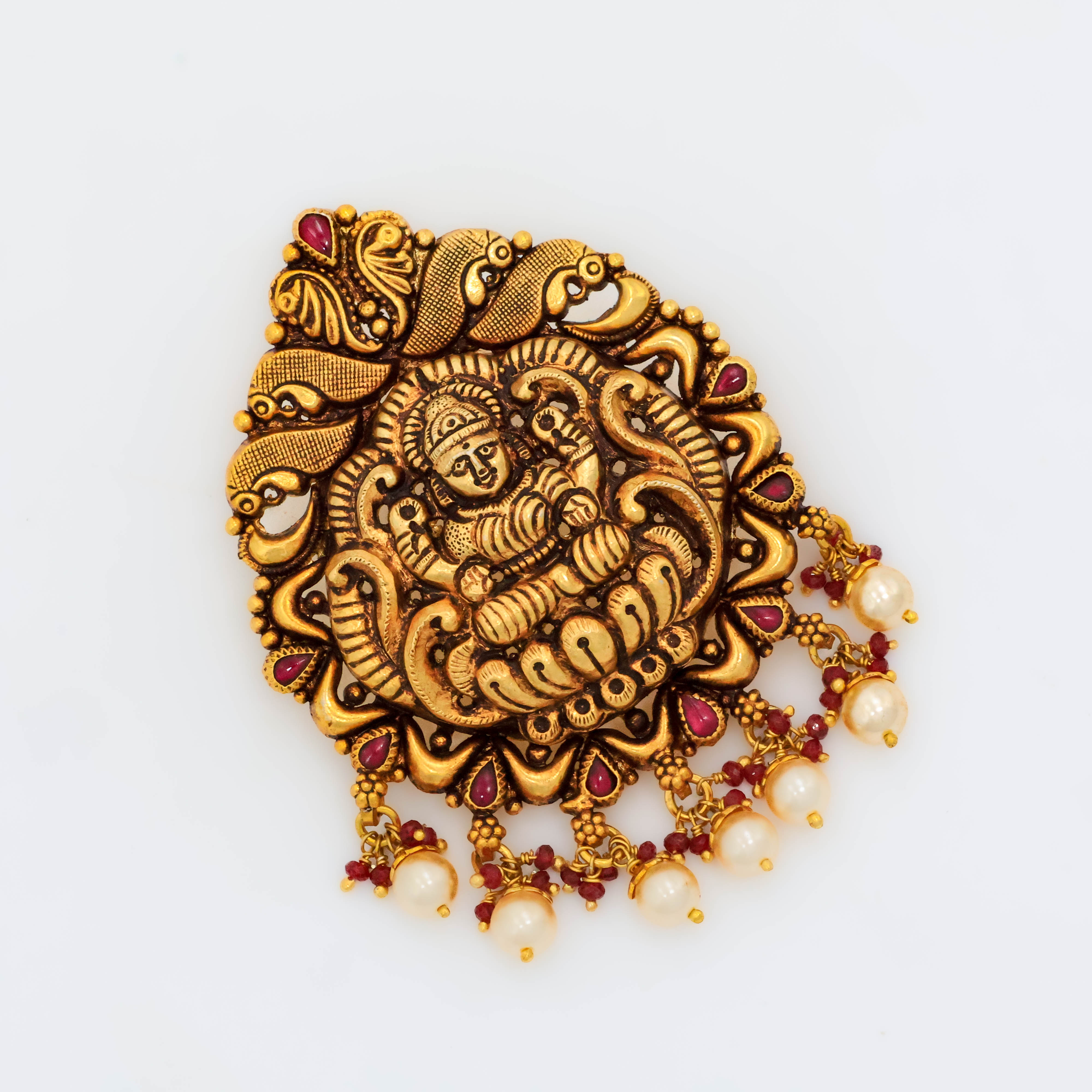 Elegant gold Lakshmi pendant featuring intricate details, perfect for traditional occasions. Buy gold Lakshmi pendant from Arham Jewellery in Hyderabad.