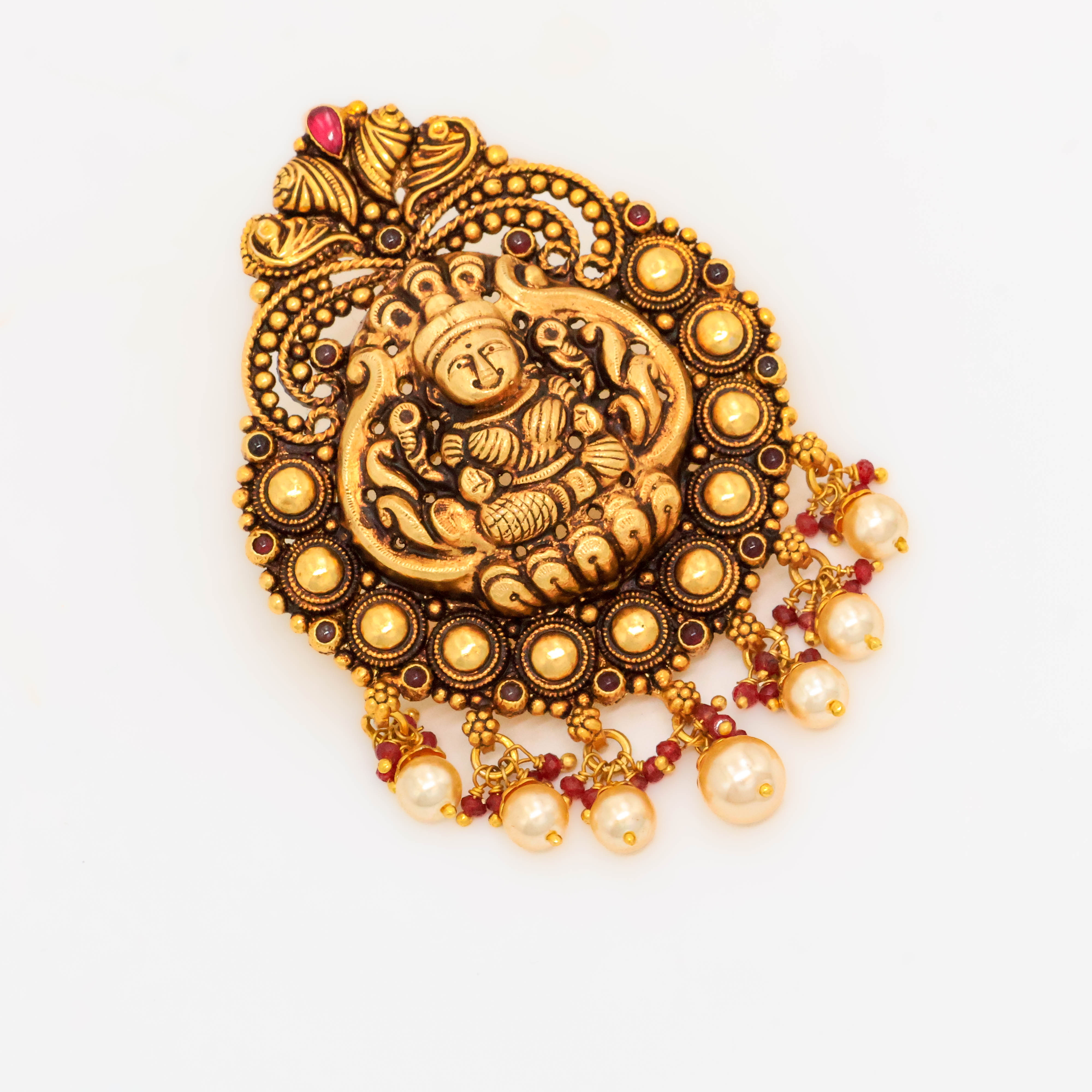 Elegant gold Lakshmi pendant featuring intricate detailing, perfect for traditional occasions. Buy gold Lakshmi pendant from Arham Jewellery in Hyderabad.