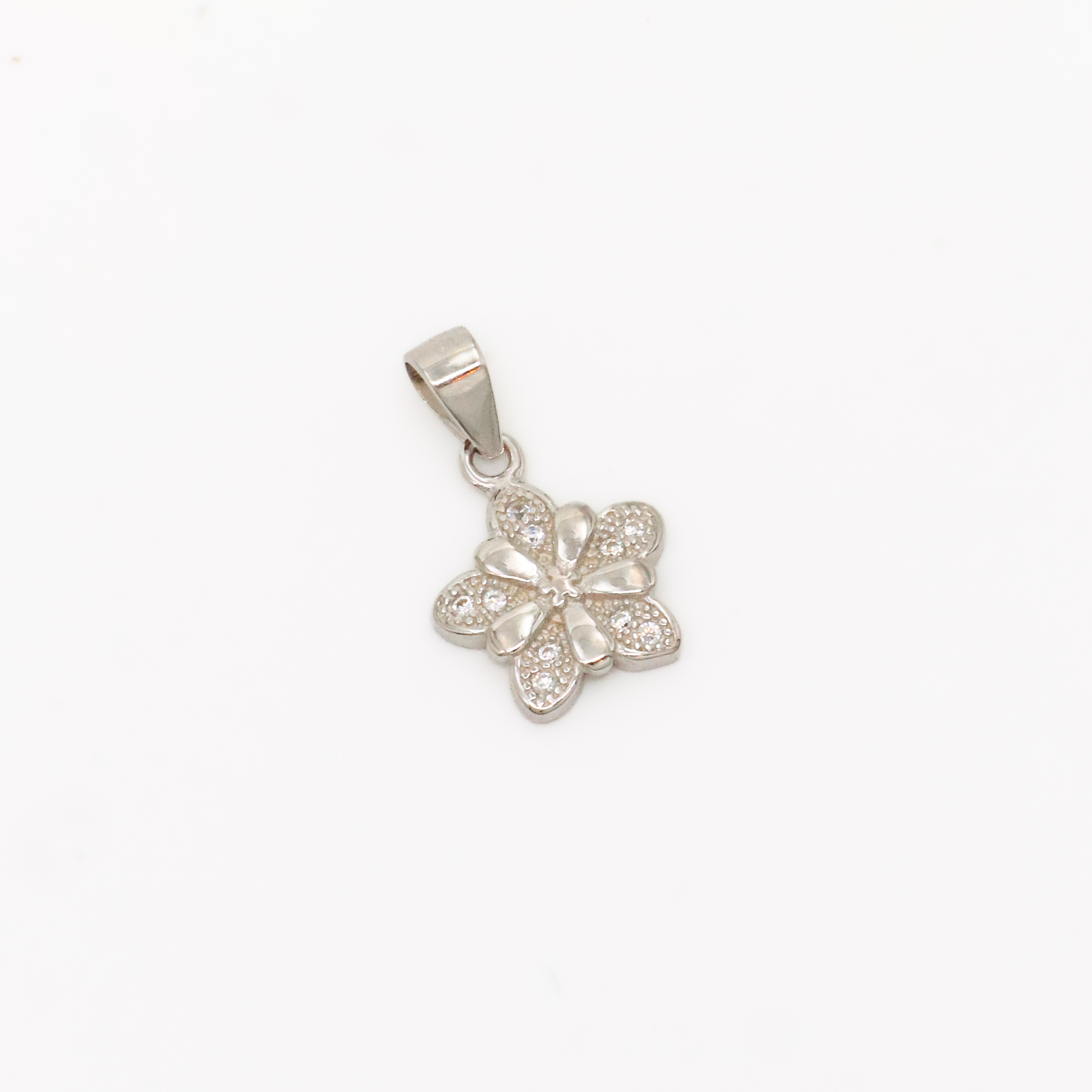 Elegant silver flower pendant with cubic zirconia stones, perfect for everyday wear and special occasions. Buy silver flower pendant from Arham Gold in Hyderabad.