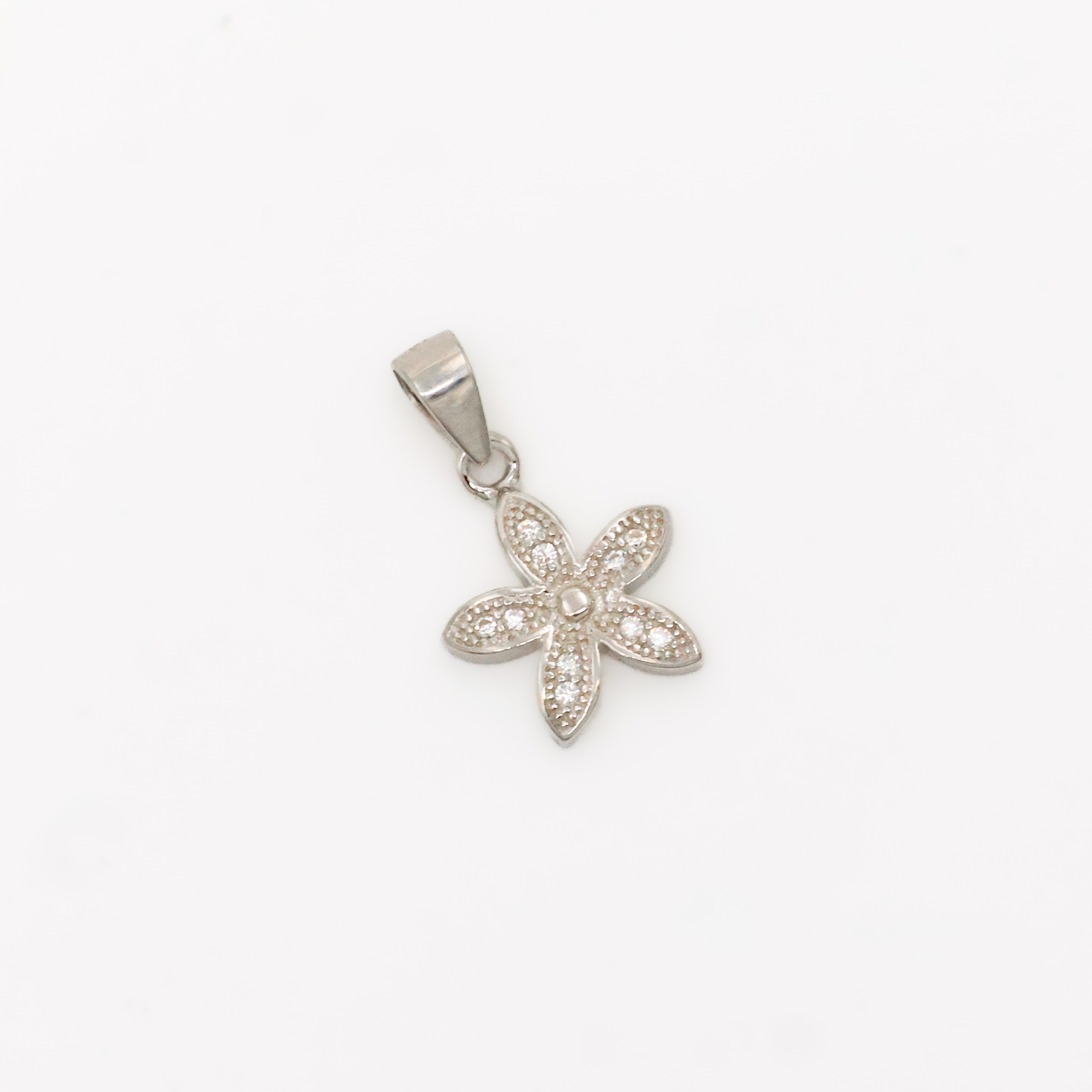 Elegant silver flower pendant with cubic zirconia stones, perfect for daily wear and special occasions. Buy silver flower pendant from Arham Gold in Hyderabad.