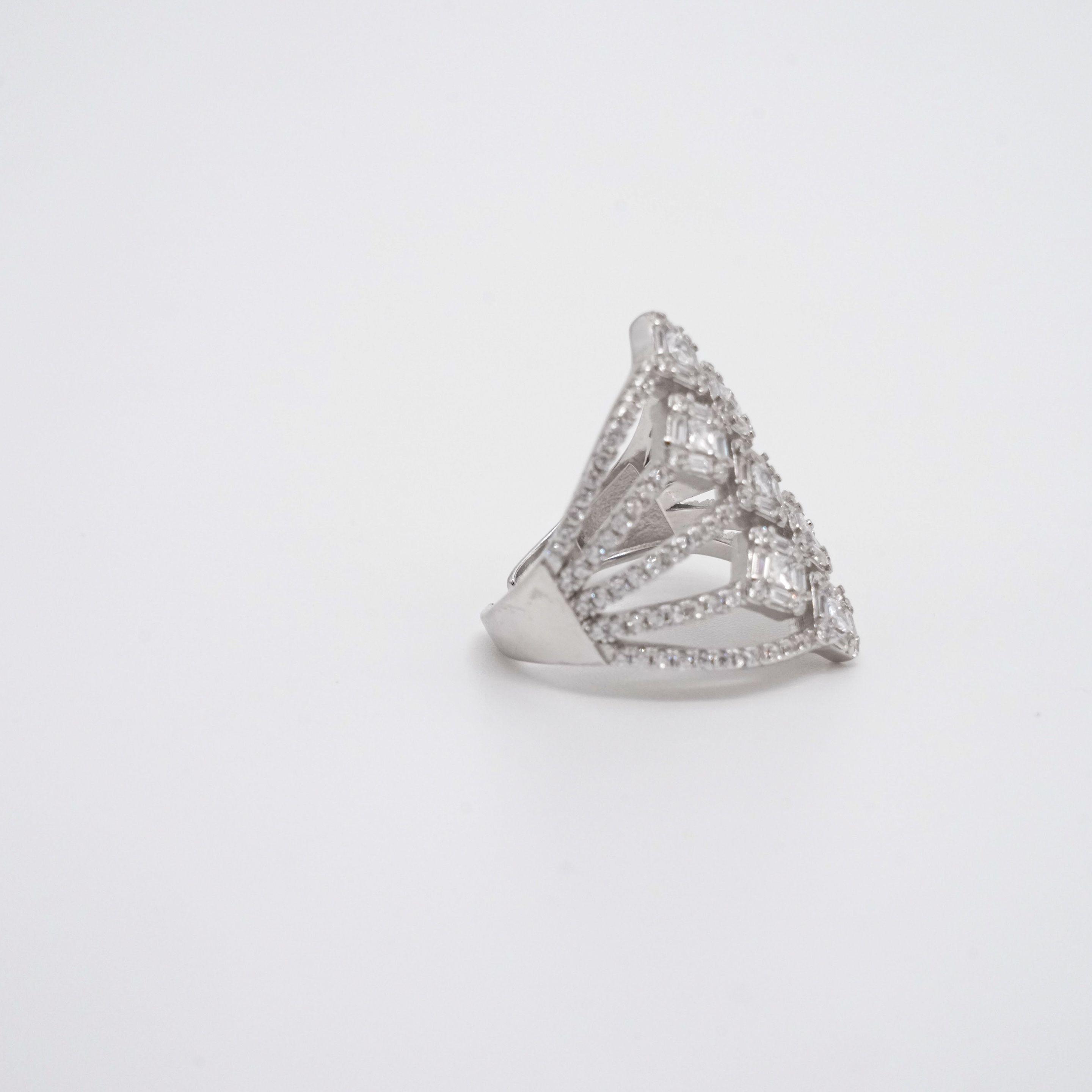 Statement silver fashion ring with baguette-cut cubic zirconia, perfect for parties and celebrations. Buy silver fashion ring from Arham Gold in Hyderabad.