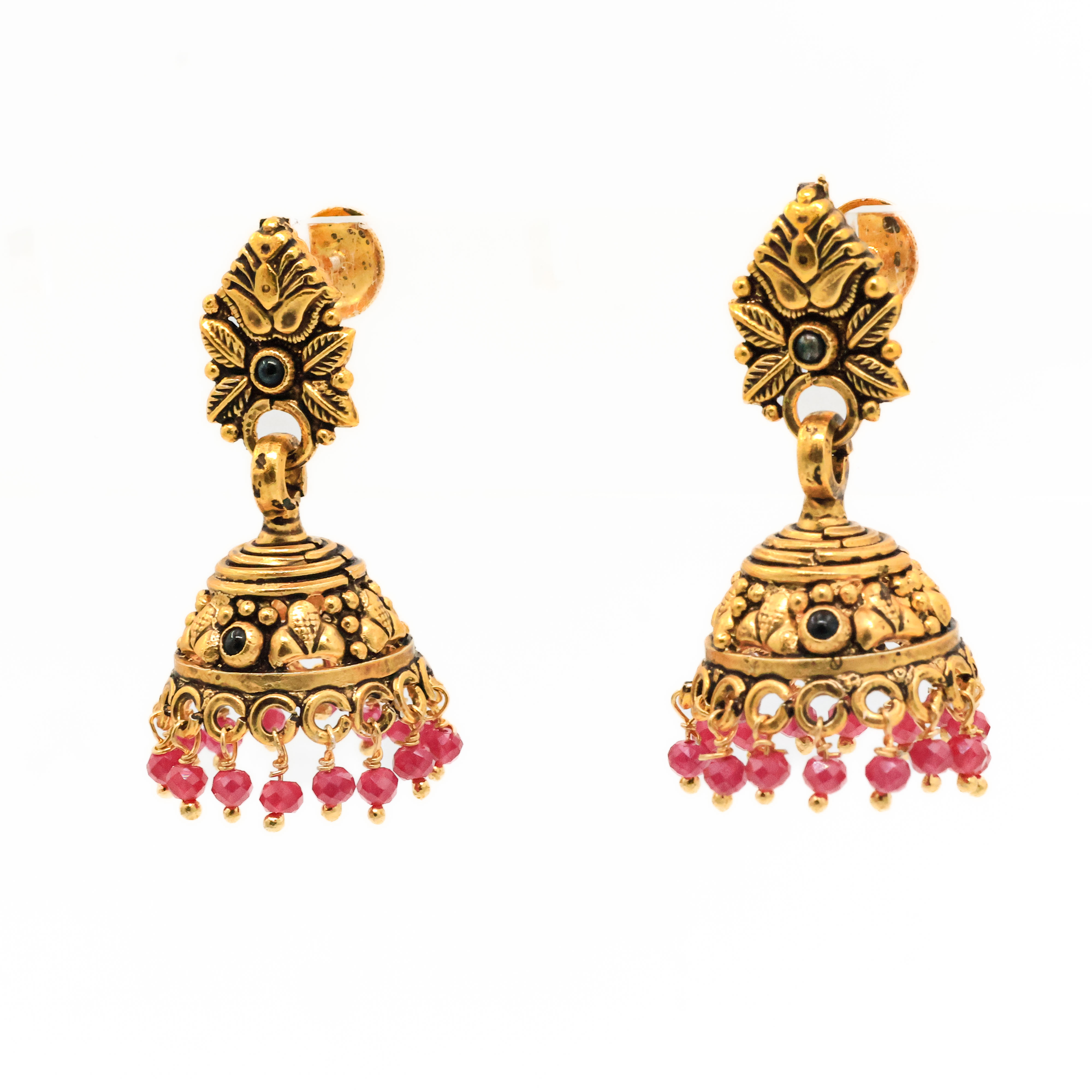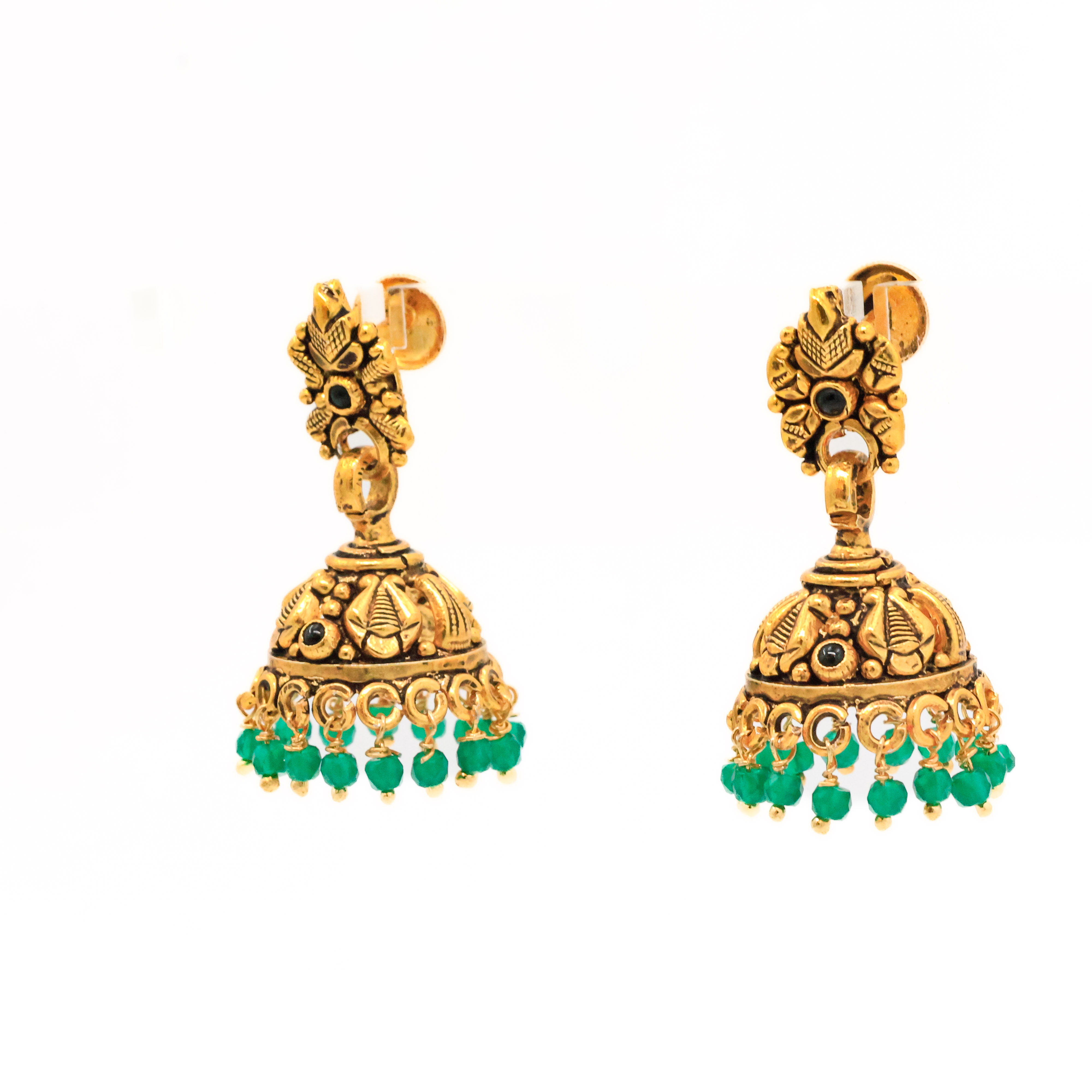 Antique gold jhumka earrings with green beads, perfect for traditional occasions and festive wear. Buy Gold Jhumka Earrings from Arham Jewellery in Hyderabad.