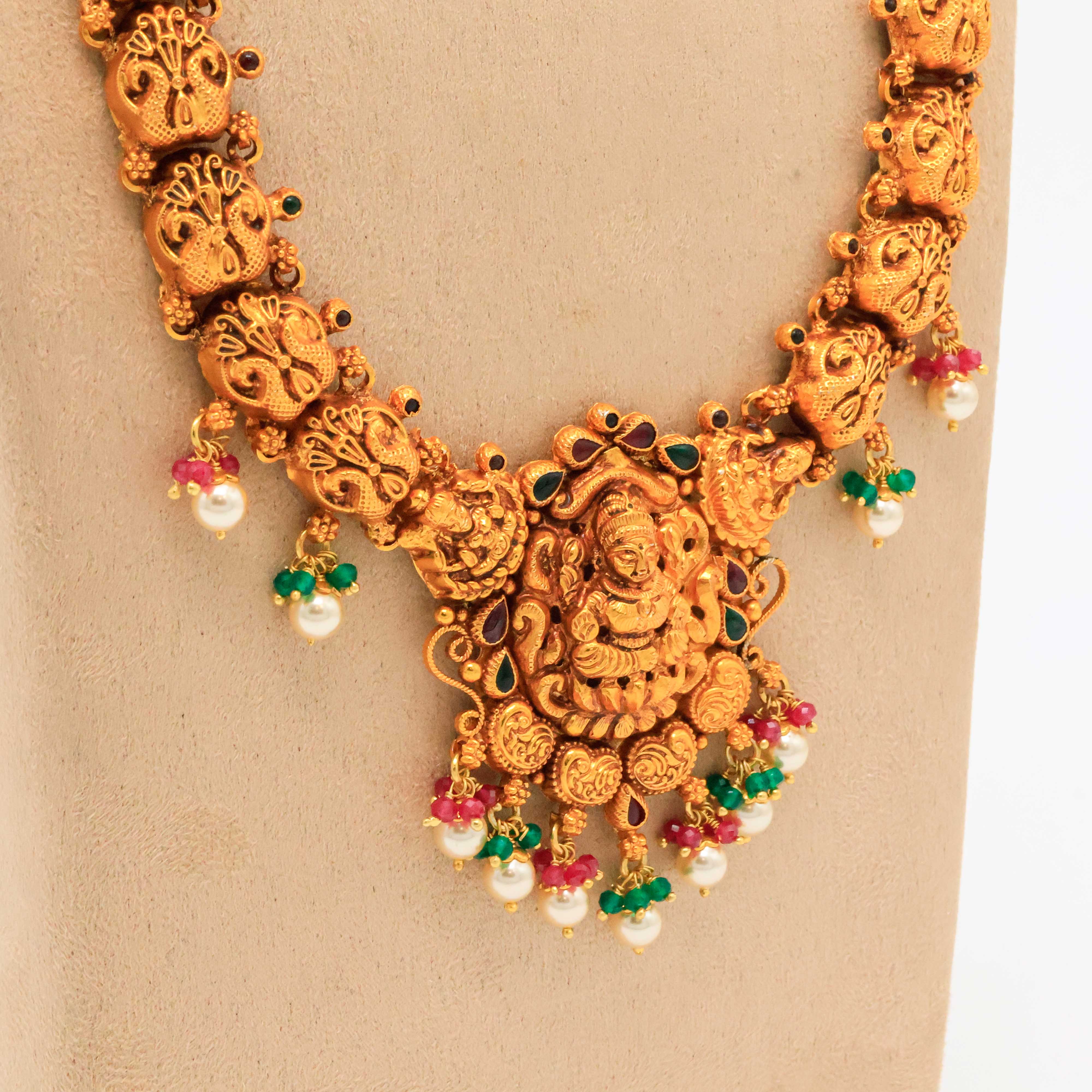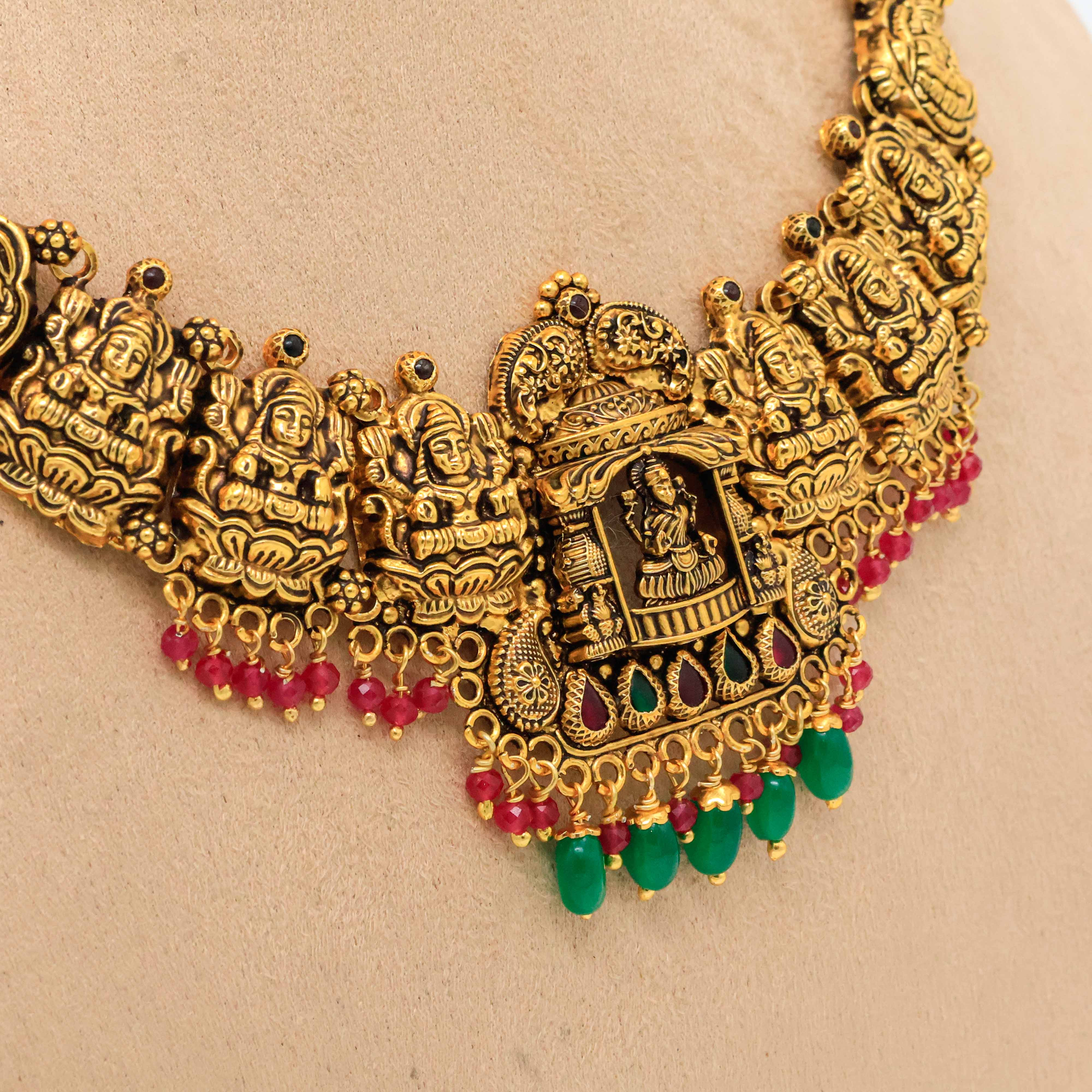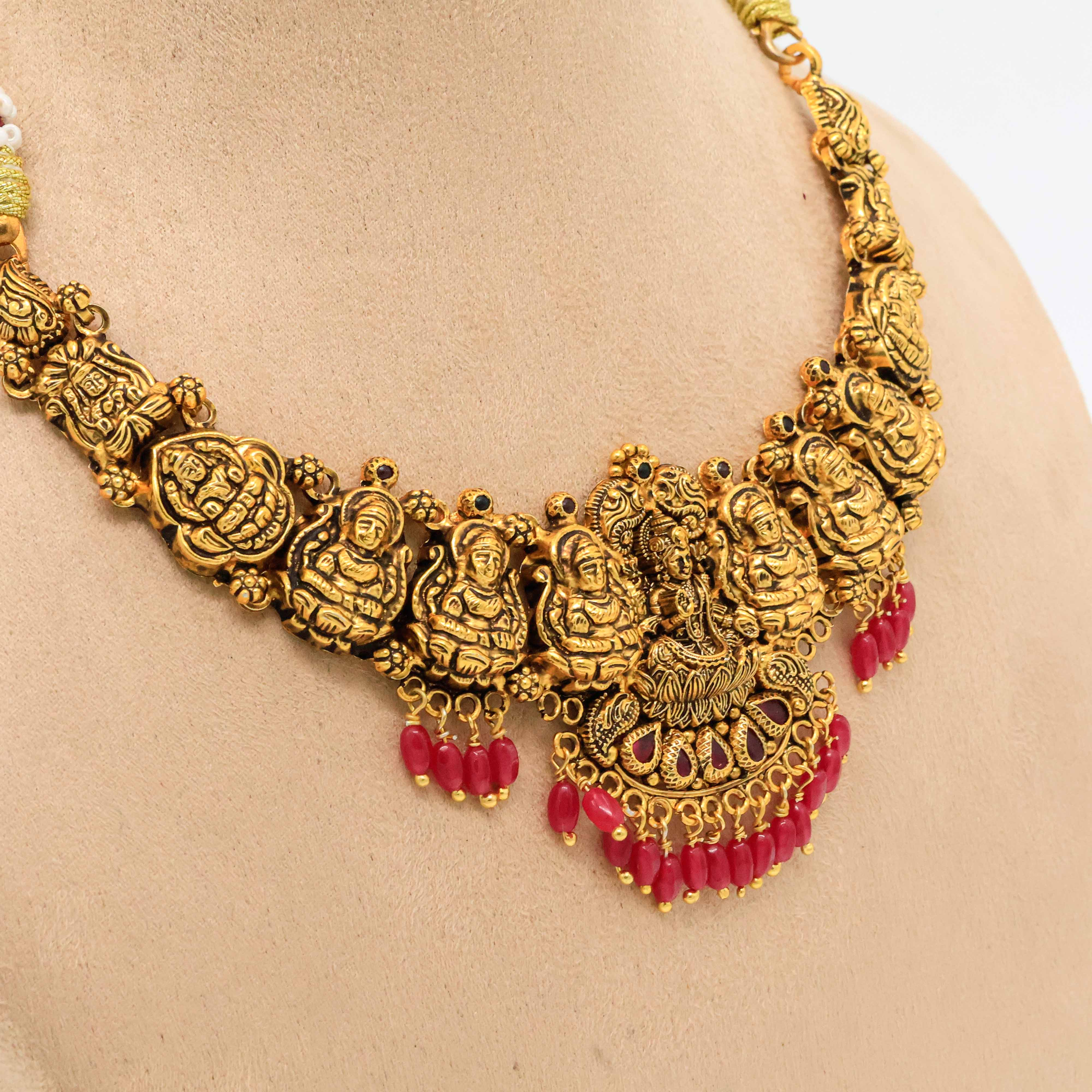 Traditional gold temple necklace featuring intricate deity carvings, perfect for weddings and festive occasions. Buy gold temple necklace from Arham Jewellery in Hyderabad.