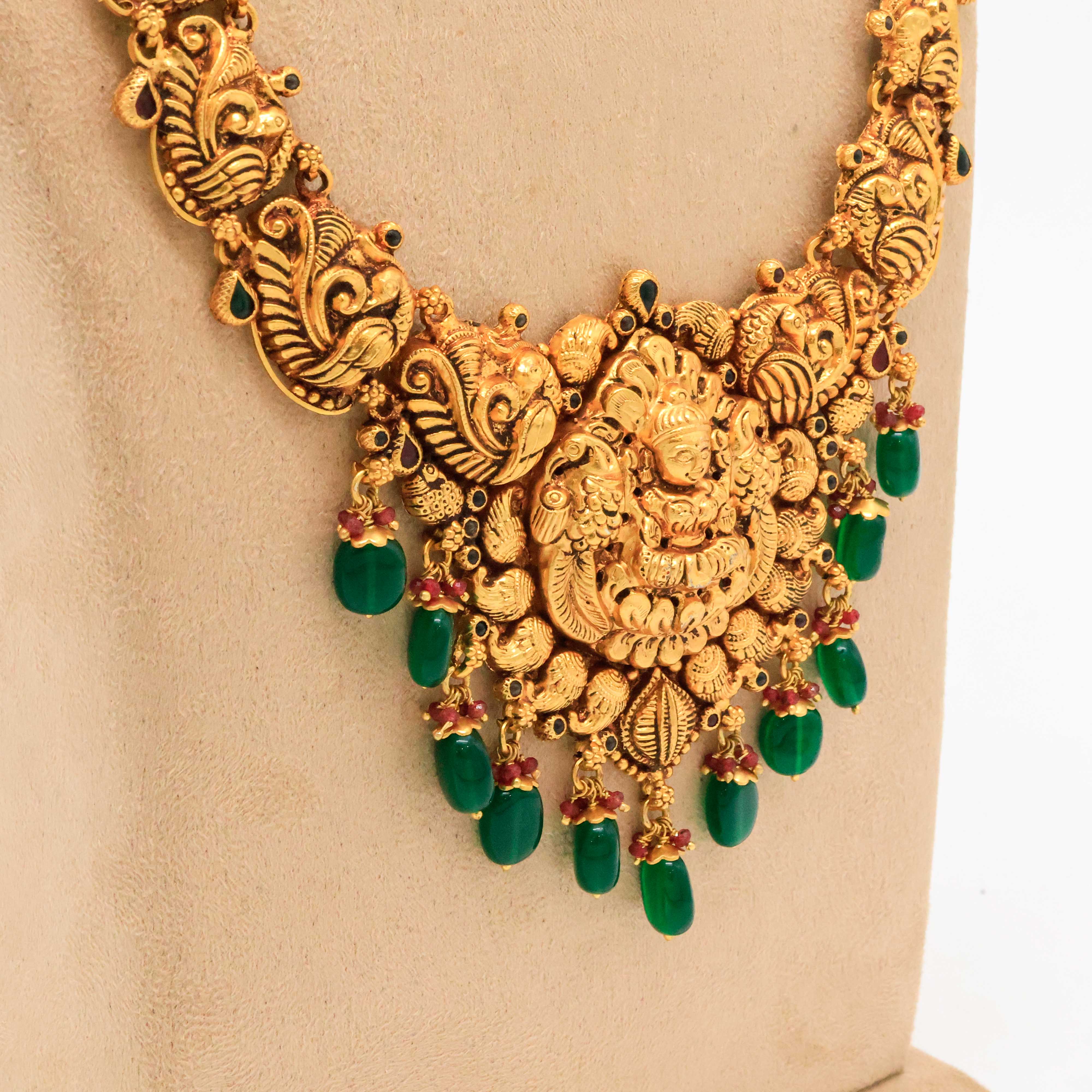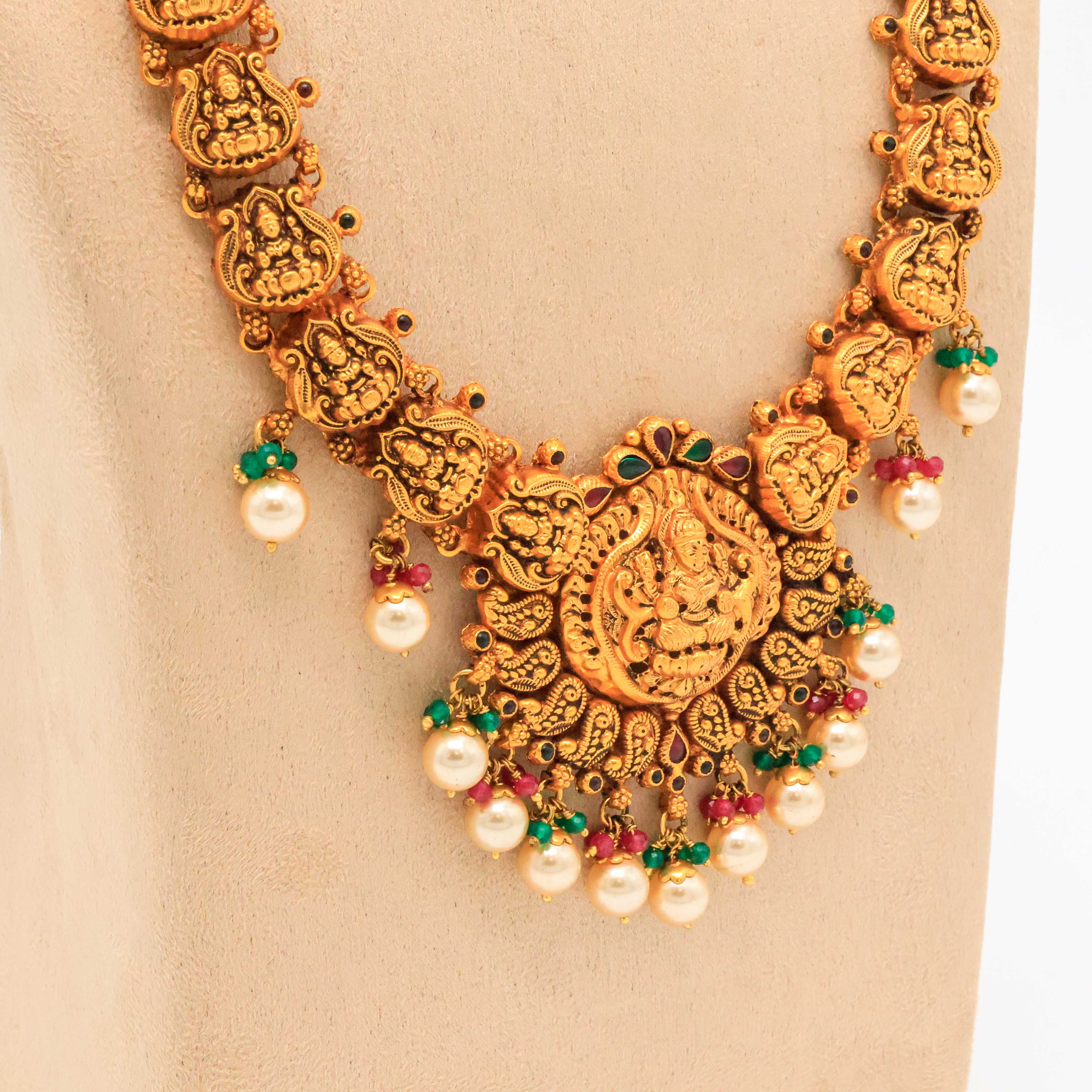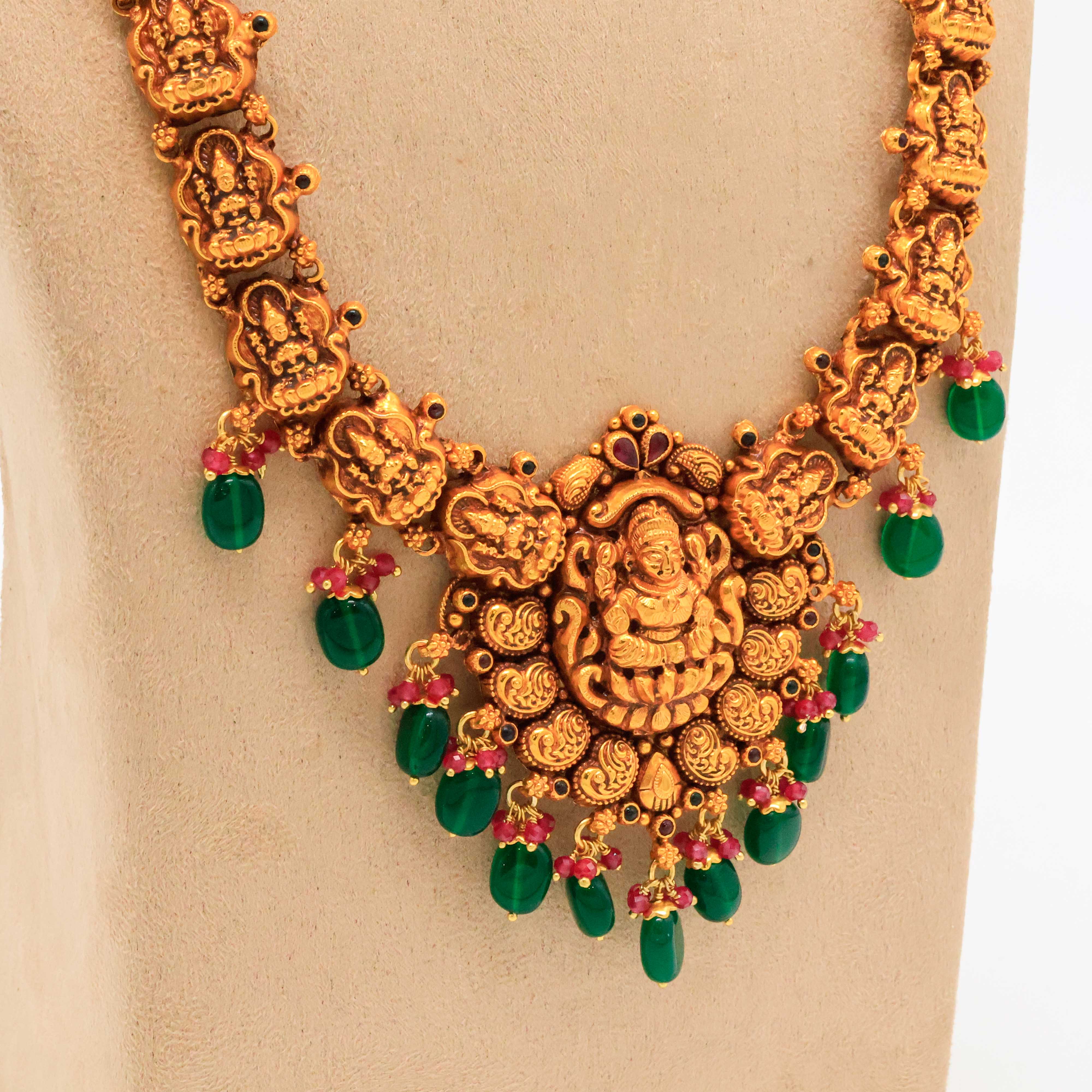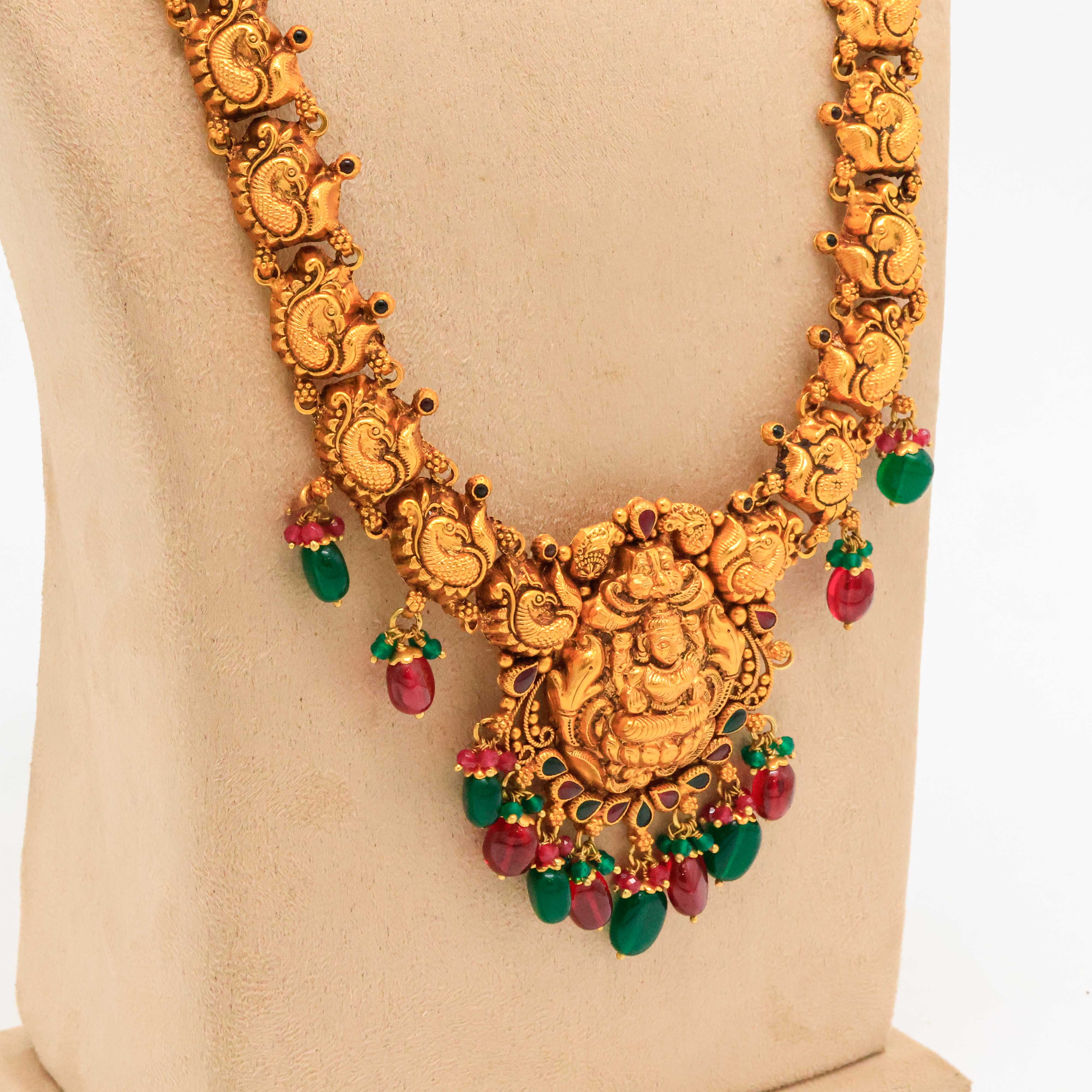 Traditional gold temple necklace featuring intricate deity carvings, perfect for weddings and festive occasions. Buy gold temple necklace from Arham Jewellery in Hyderabad.