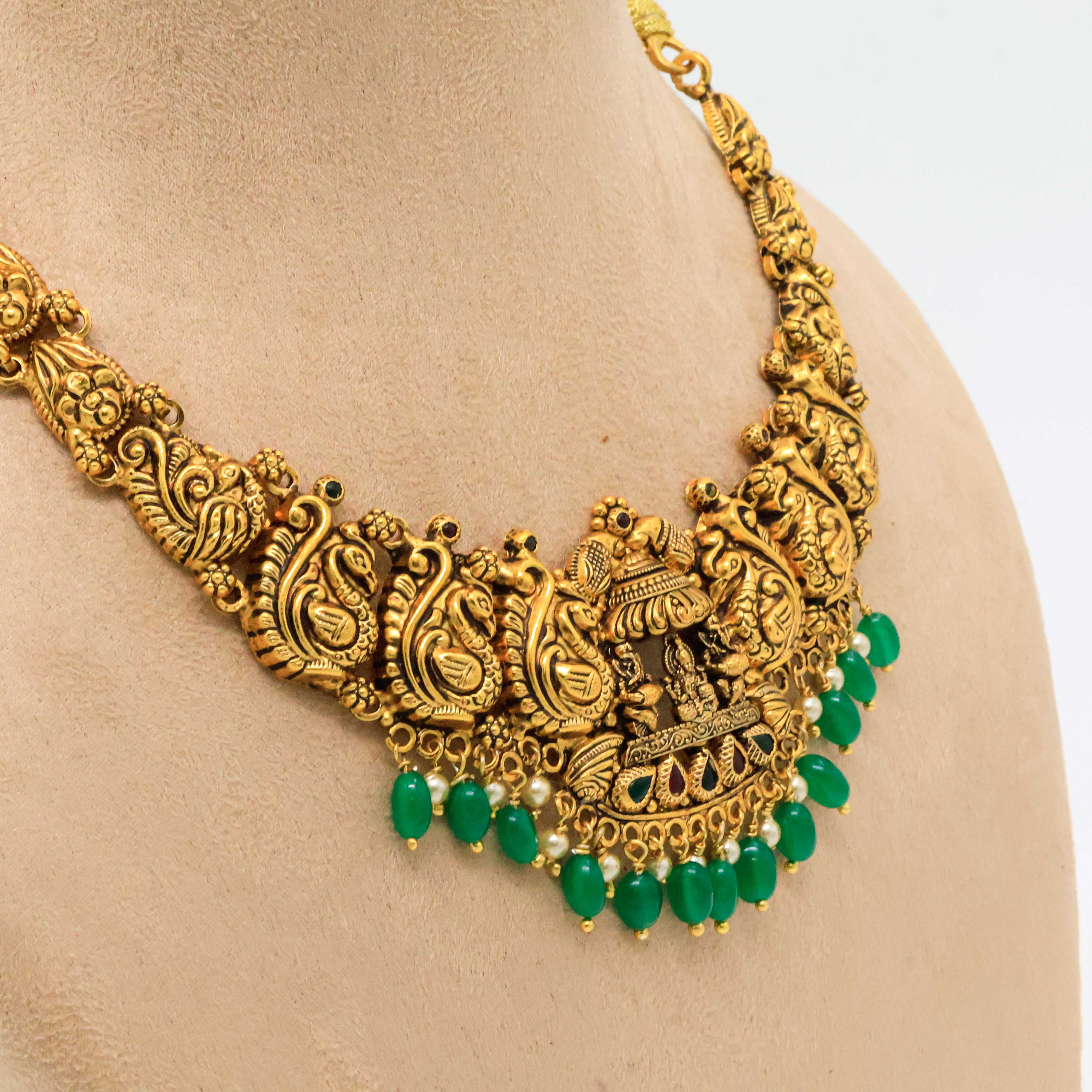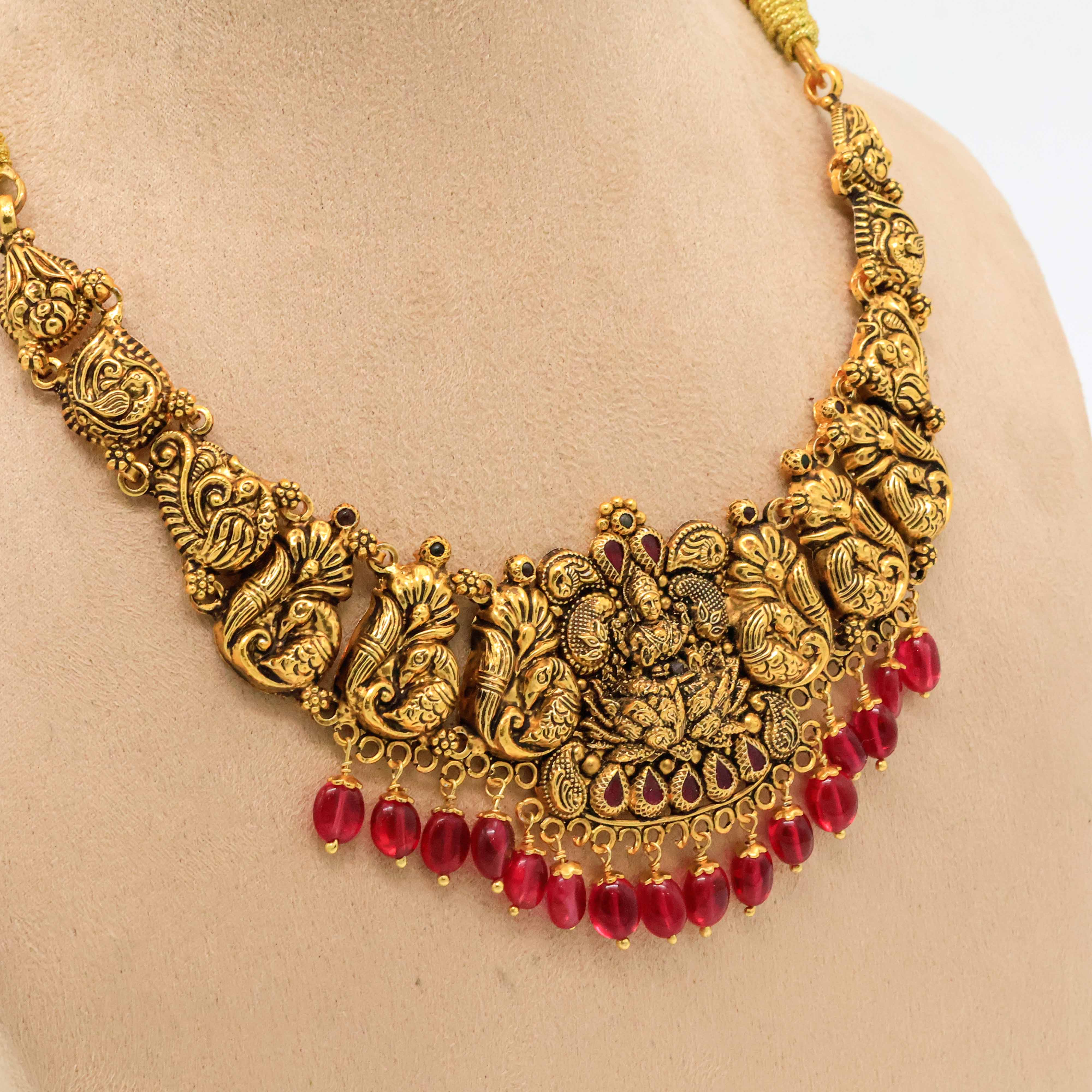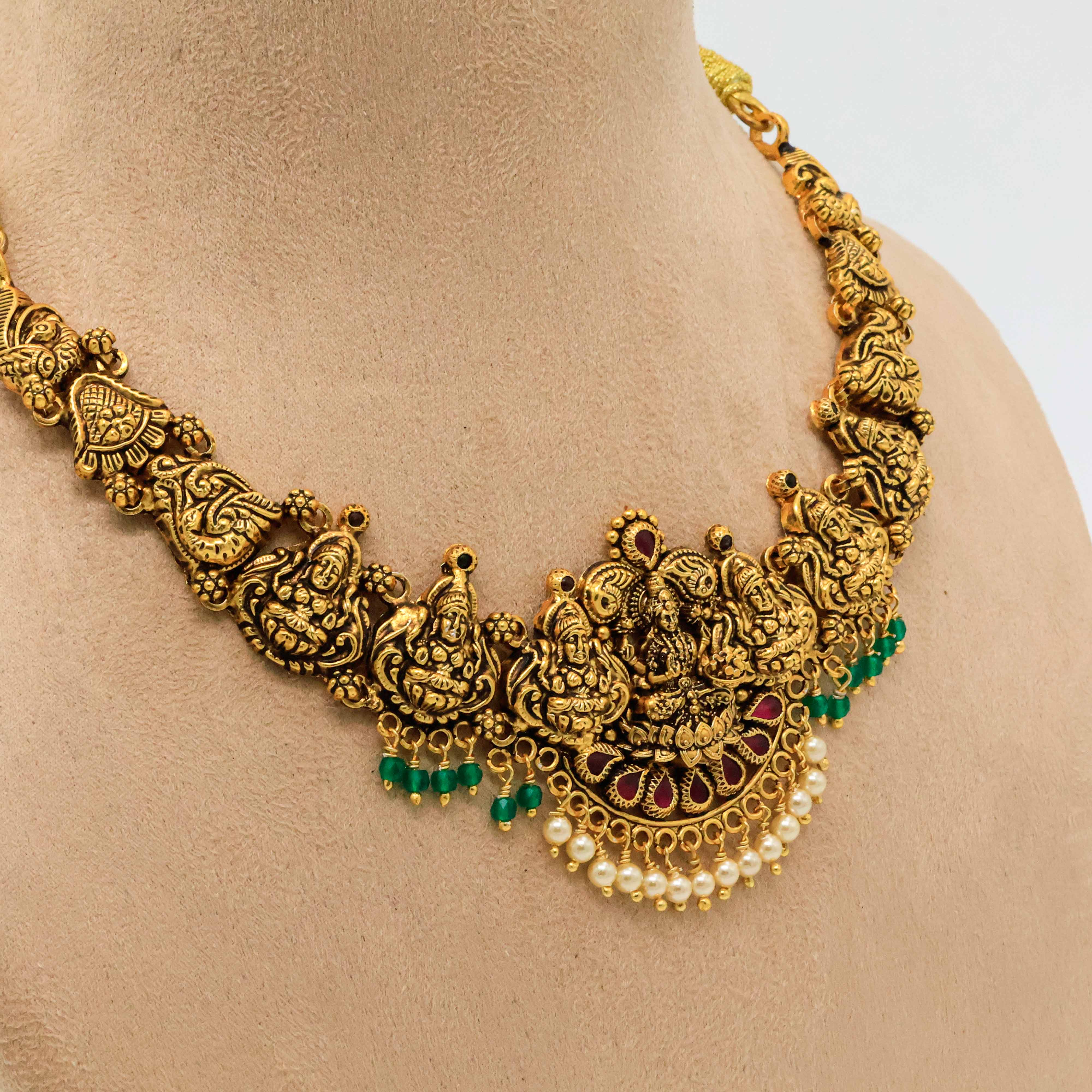 Elegant gold temple necklace with intricate detailing, perfect for weddings and traditional occasions. Buy gold temple necklace from Arham Jewellery in Hyderabad.