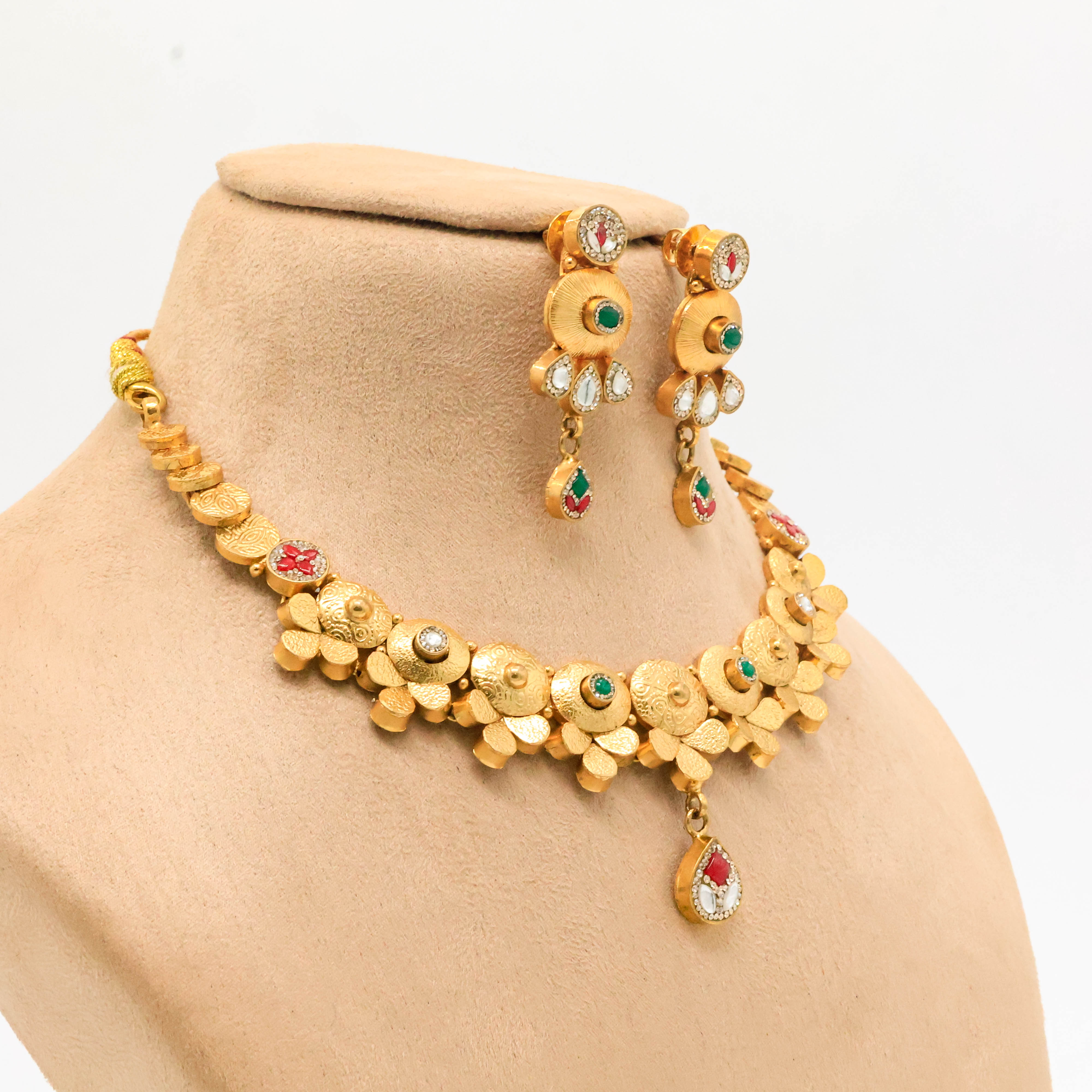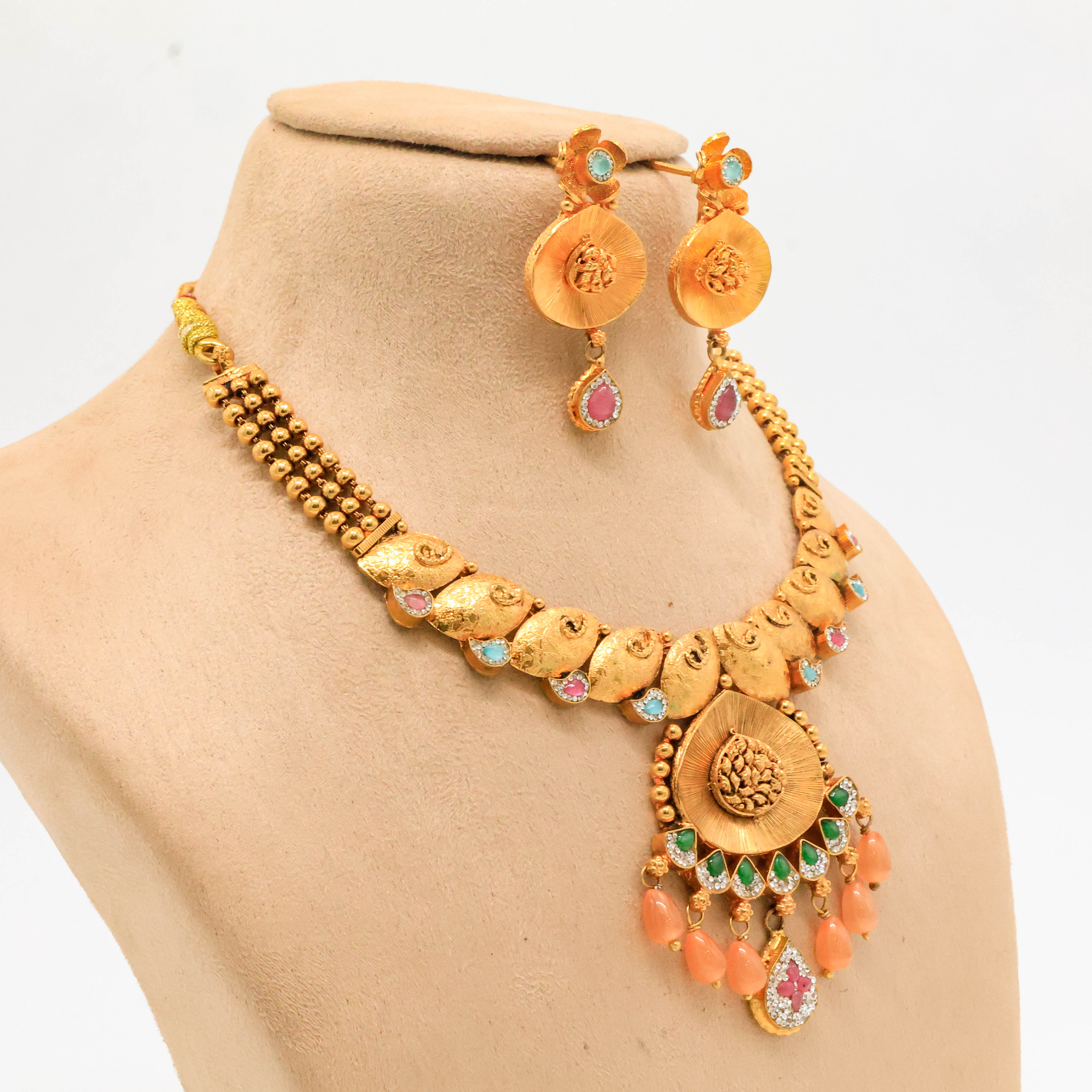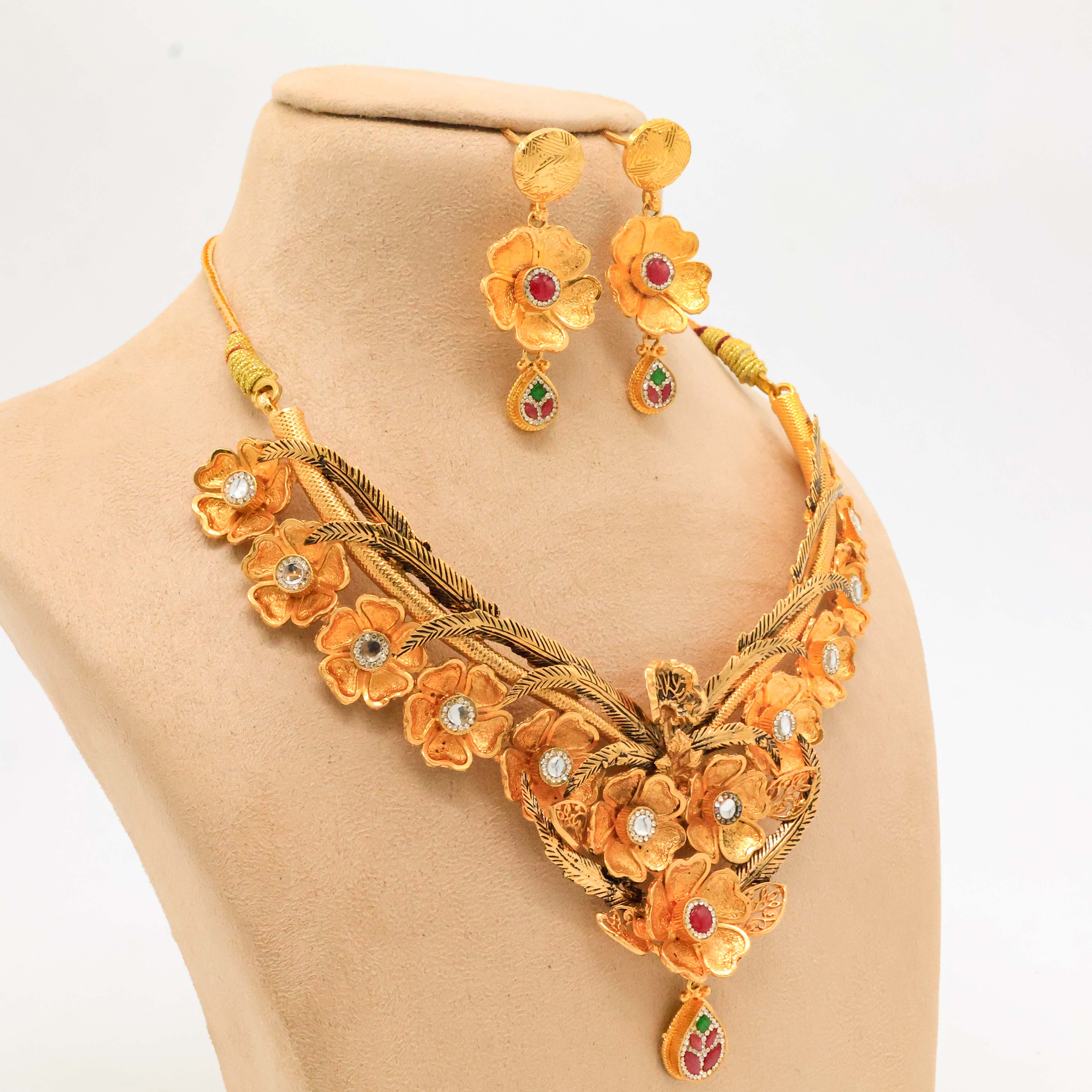 Elegant gold floral necklace with gemstone accents, perfect for weddings and special occasions. Buy gold floral necklace from Arham Jewellery in Hyderabad.