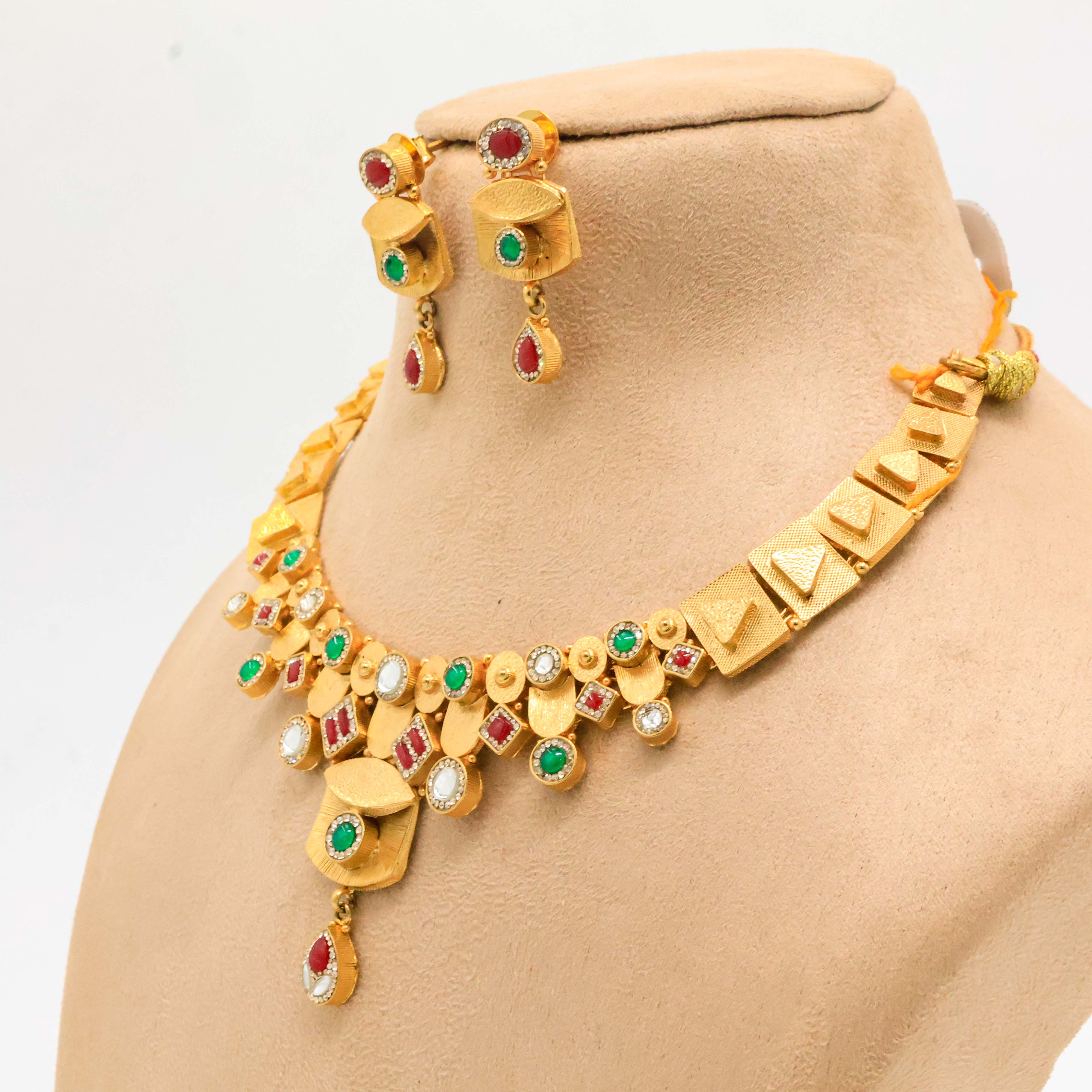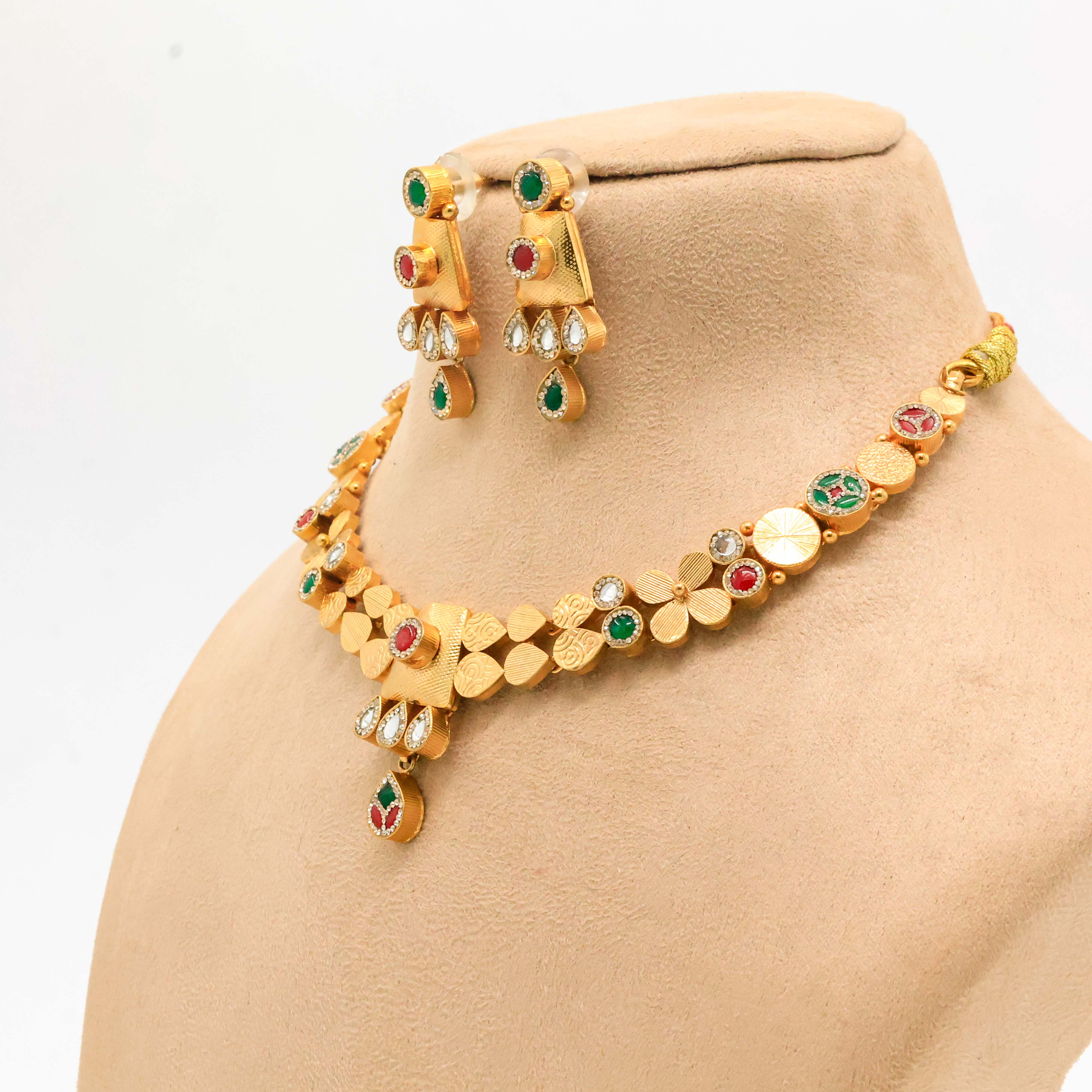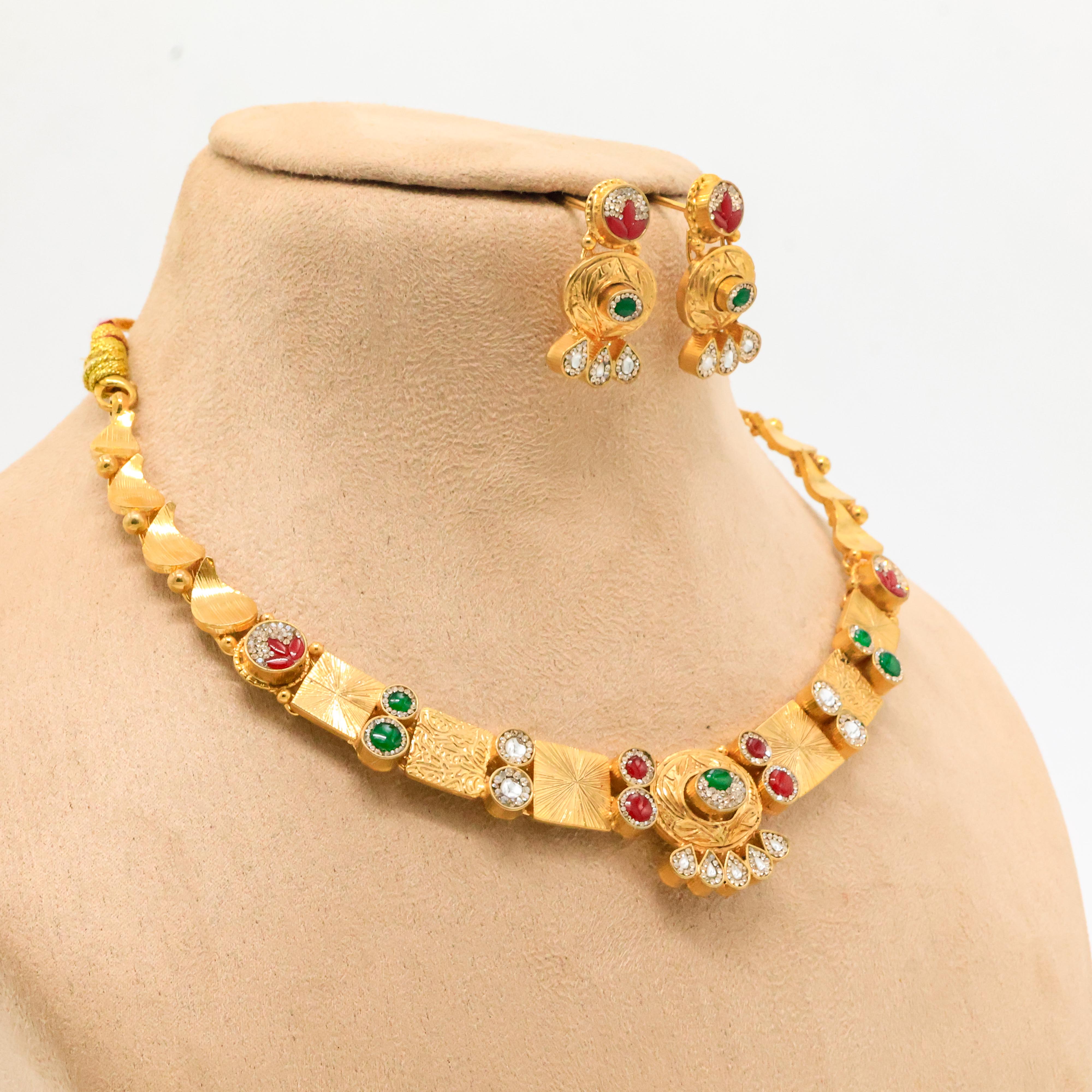 Elegant gold plated necklace with gemstone detailing, perfect for weddings and festive occasions. Buy Gold Plated Necklace from Arham Jewellery in Hyderabad.
