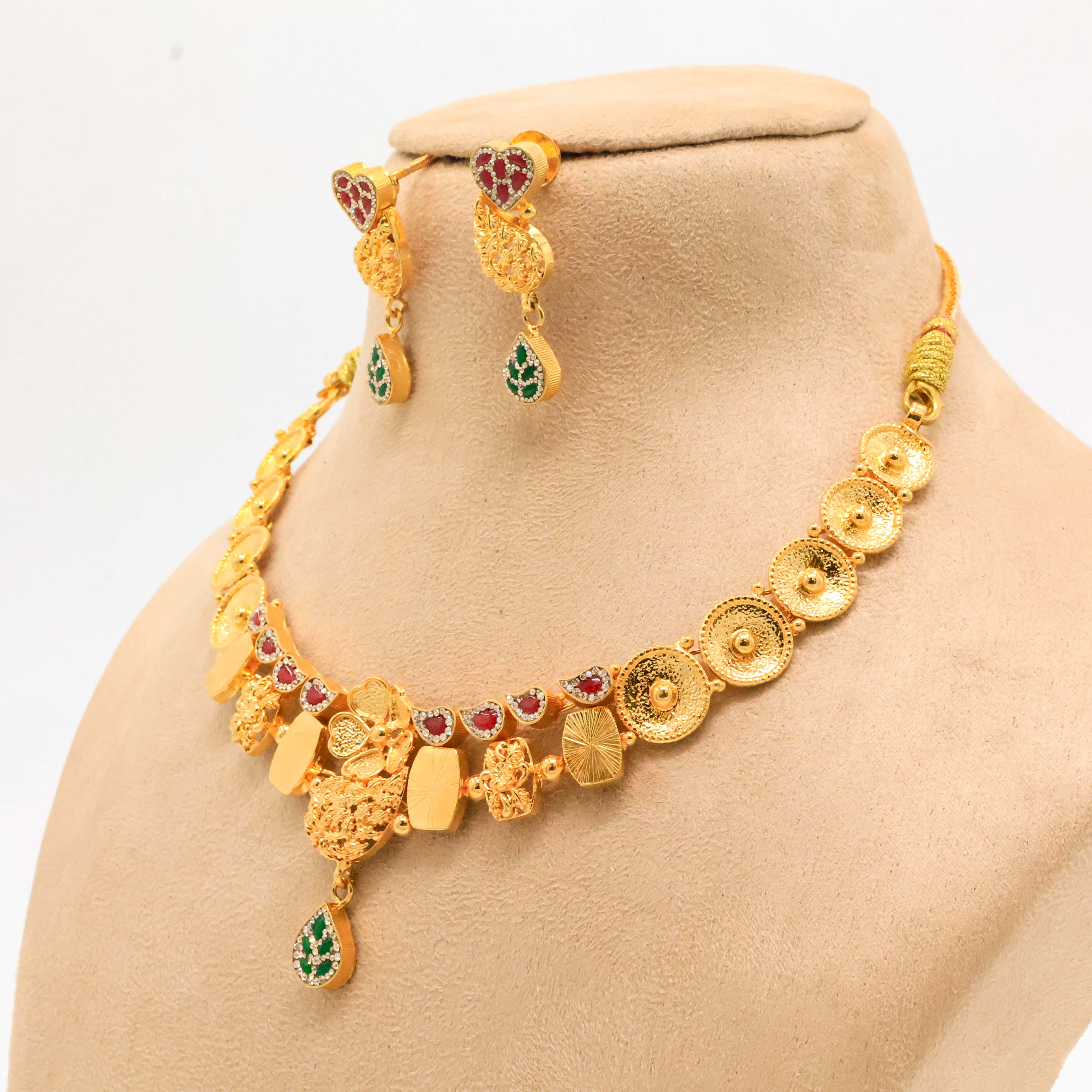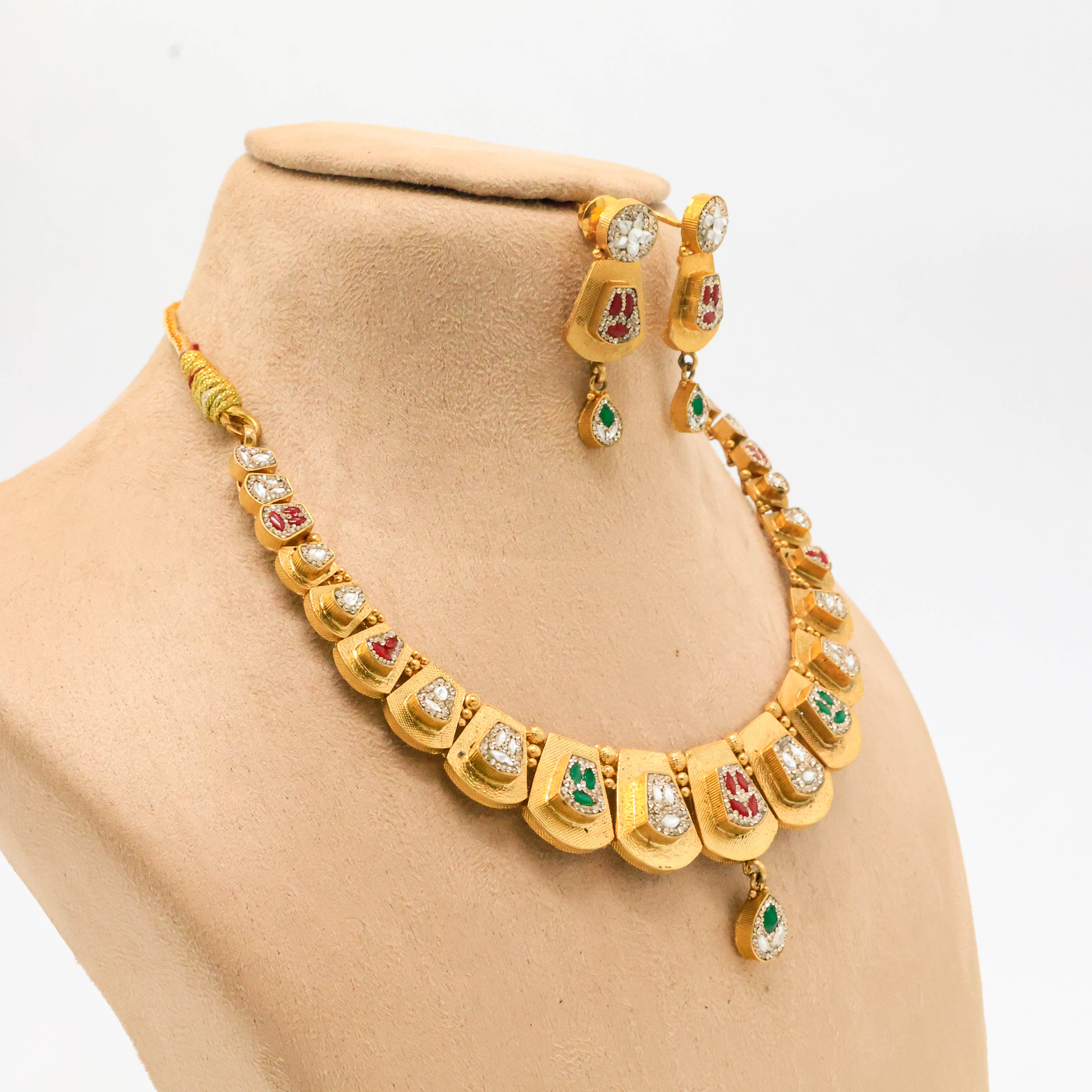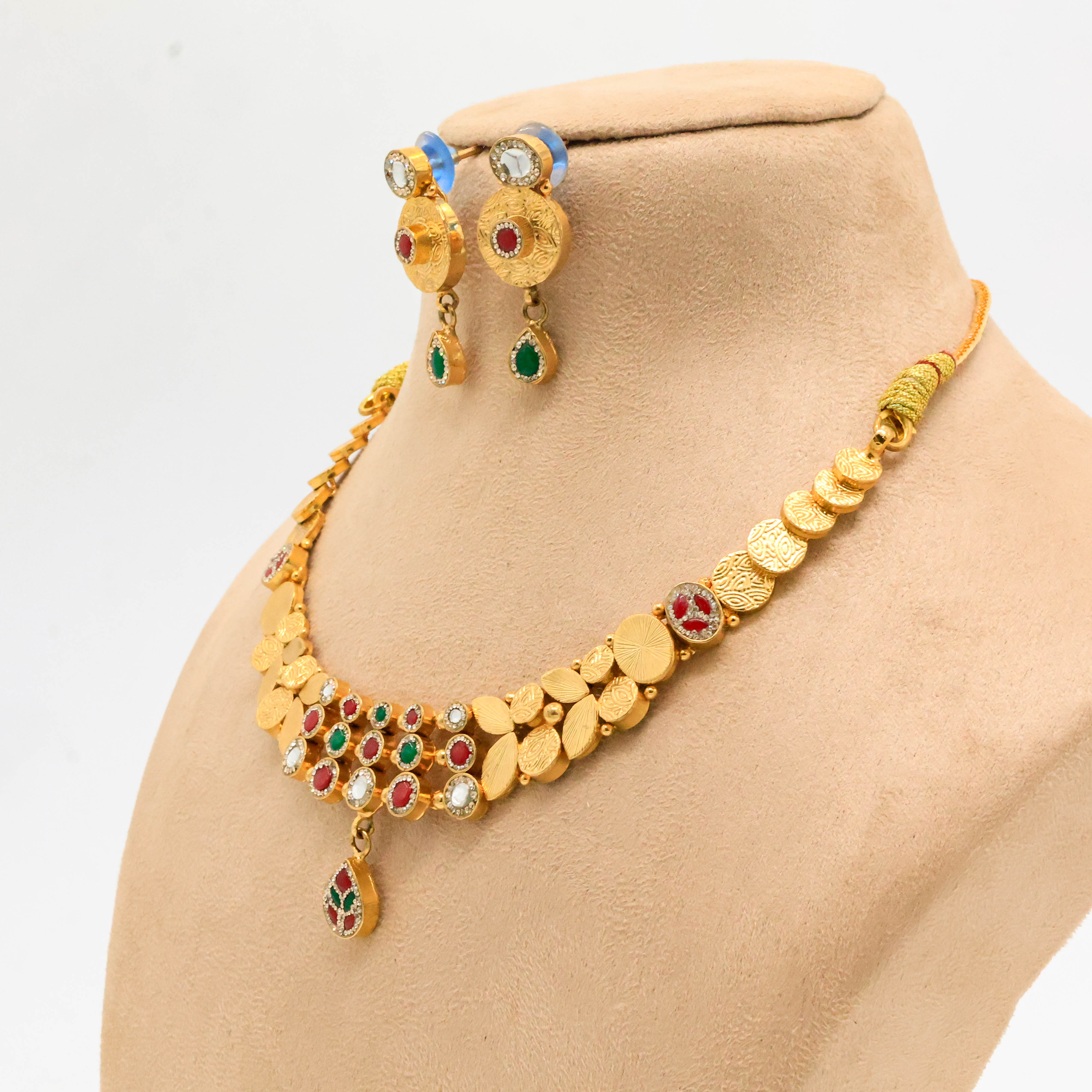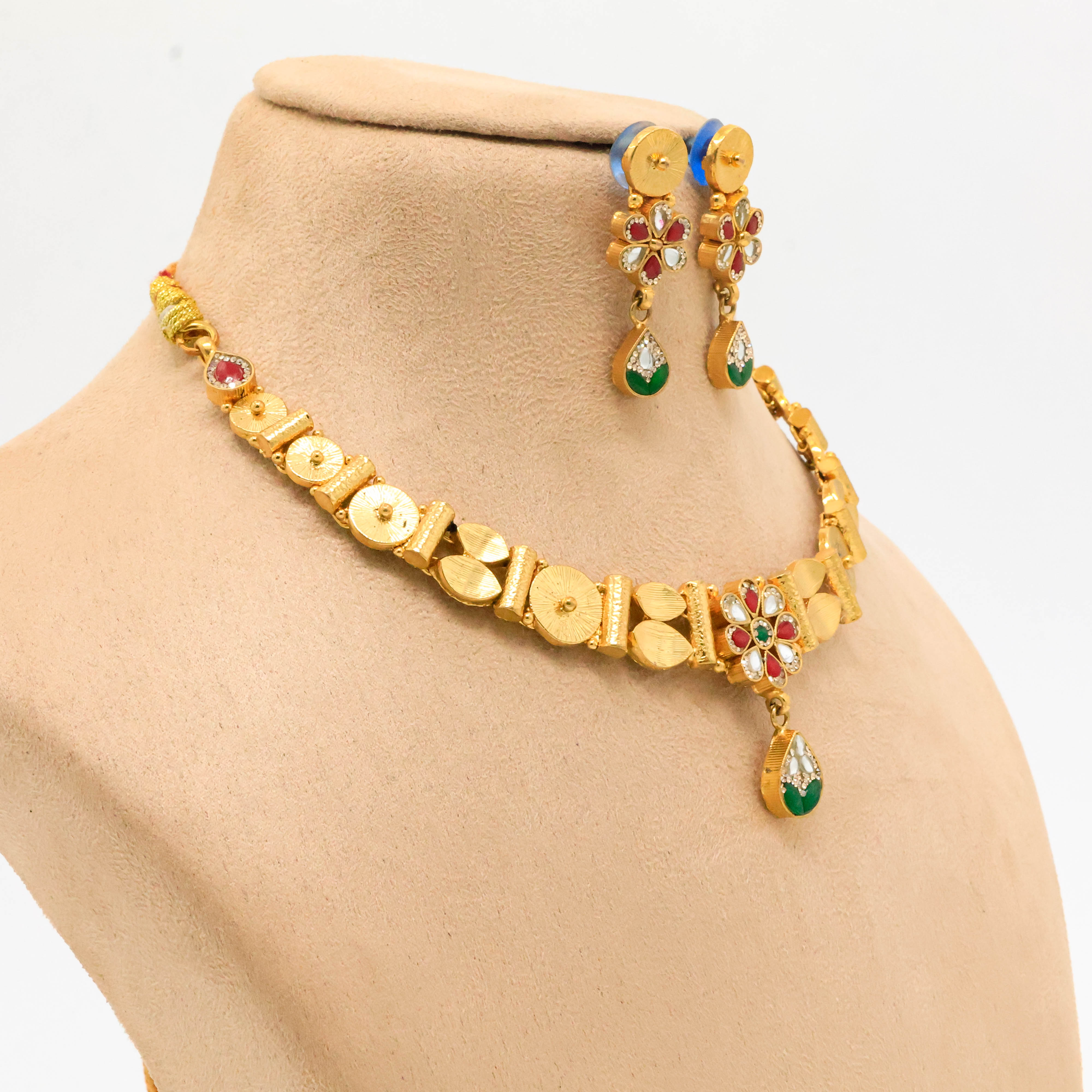 Elegant gold plated necklace with gemstone detailing, perfect for weddings and festive occasions. Buy Gold Plated Necklace from Arham Jewellery in Hyderabad.