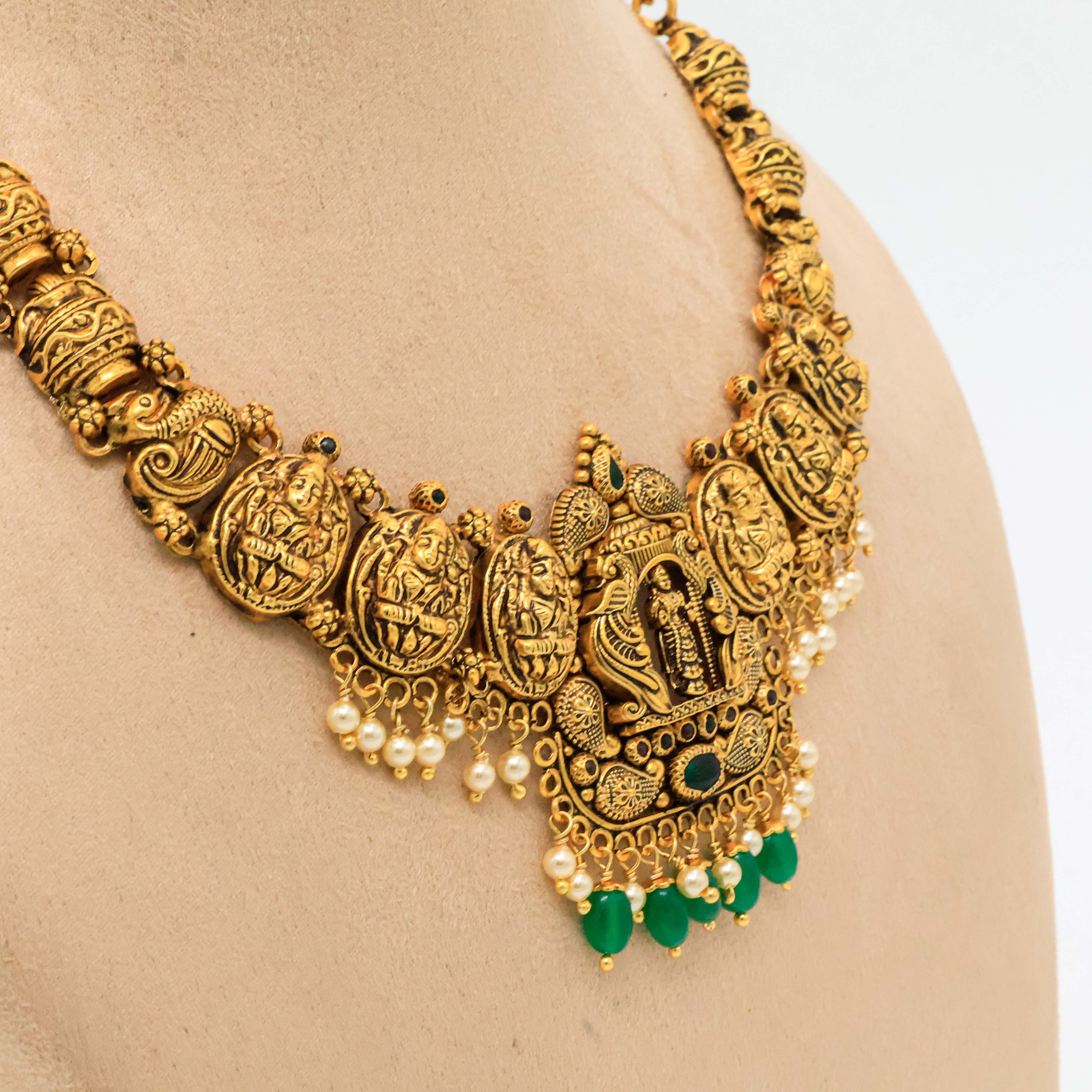 Elegant gold temple necklace featuring intricate detailing, perfect for traditional occasions. Buy Gold Temple Necklace from Arham Jewellery in Hyderabad.