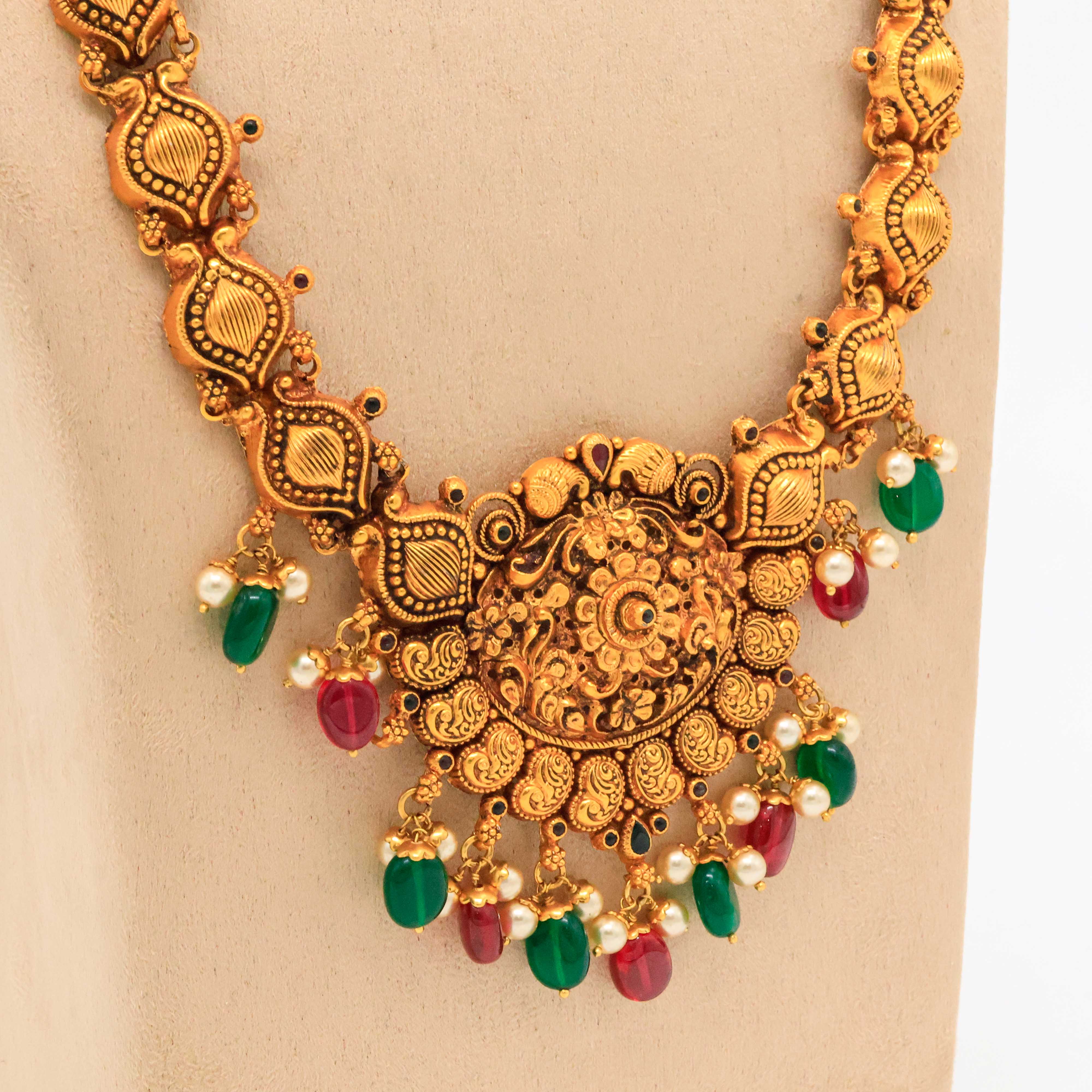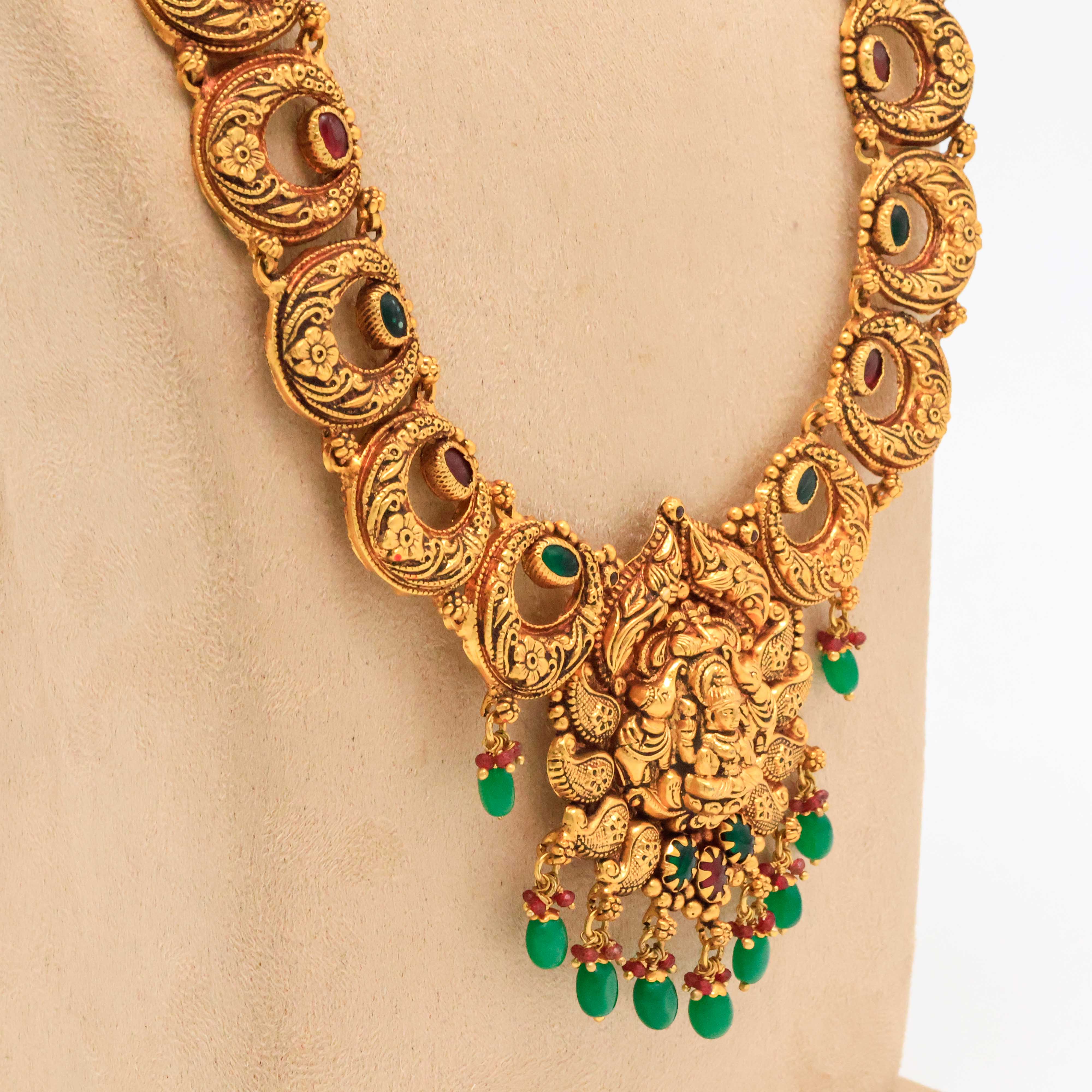 Elegant gold temple necklace with intricate detailing, perfect for weddings and traditional occasions. Buy gold temple necklace from Arham Jewellery in Hyderabad.