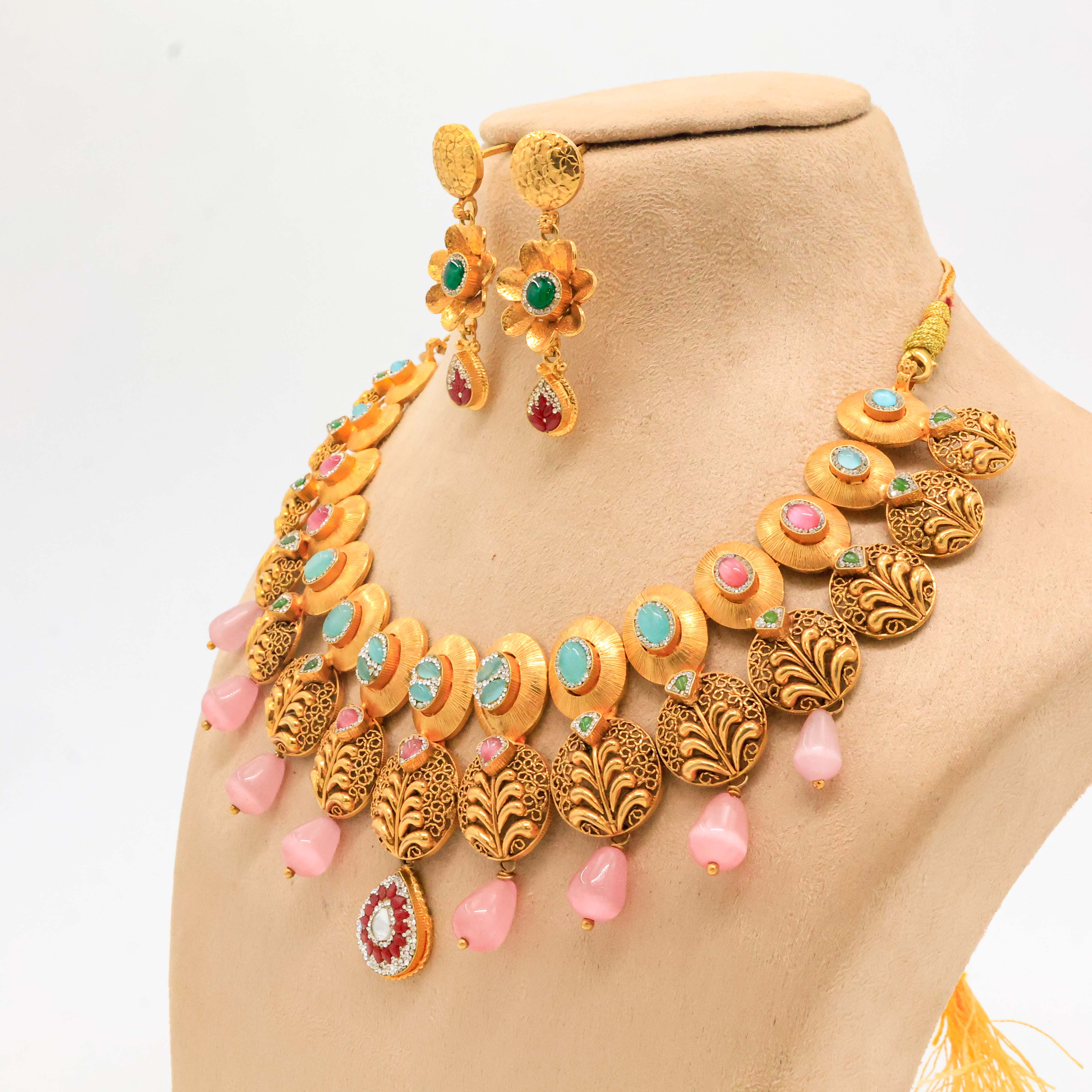 Elegant gold plated necklace set with intricate design, perfect for weddings and special occasions. Buy gold plated necklace from Arham Jewellery in Hyderabad.