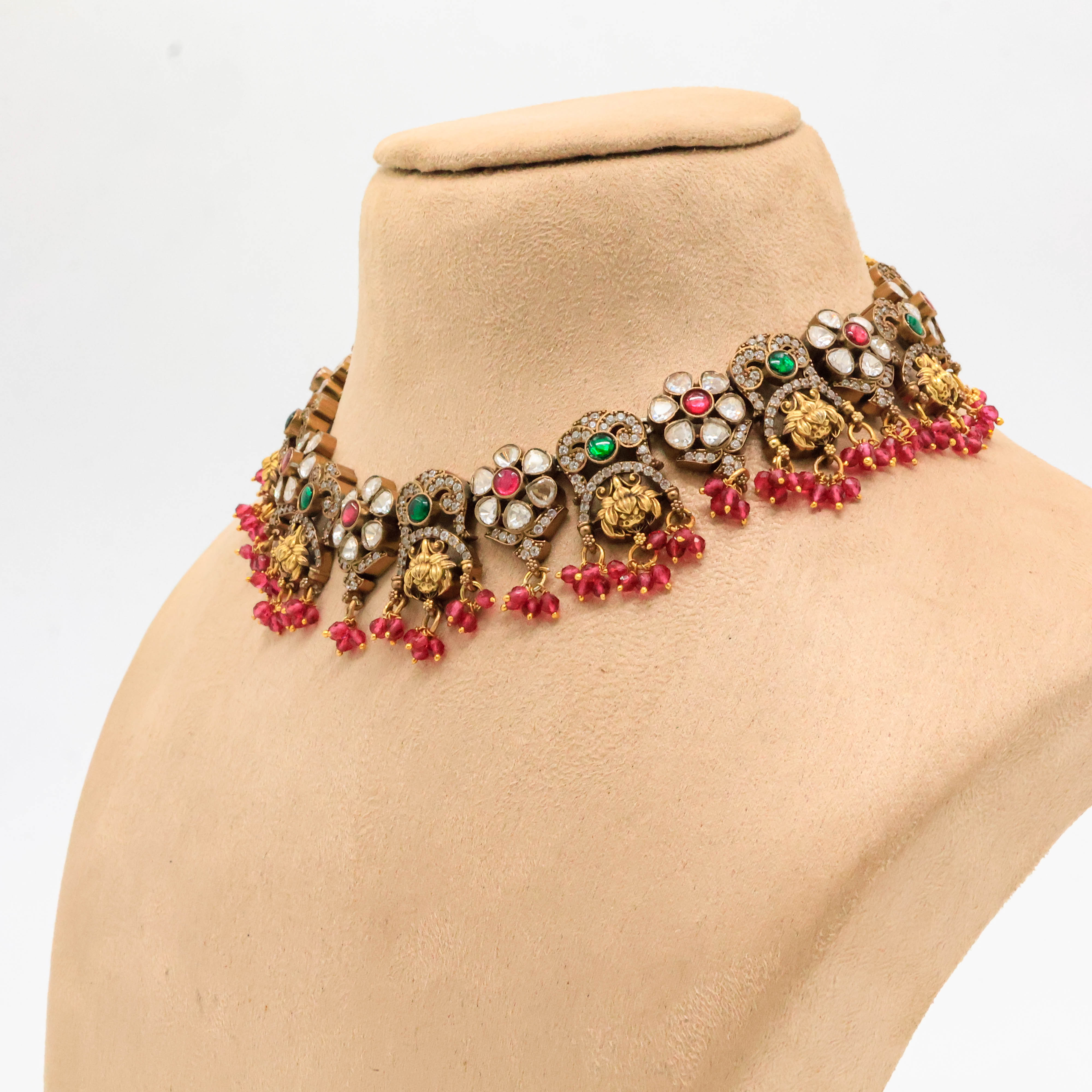 Elegant gold necklace set with red and green stones, perfect for weddings and festive occasions. Buy gold necklace set from Arham Jewellery in Hyderabad.