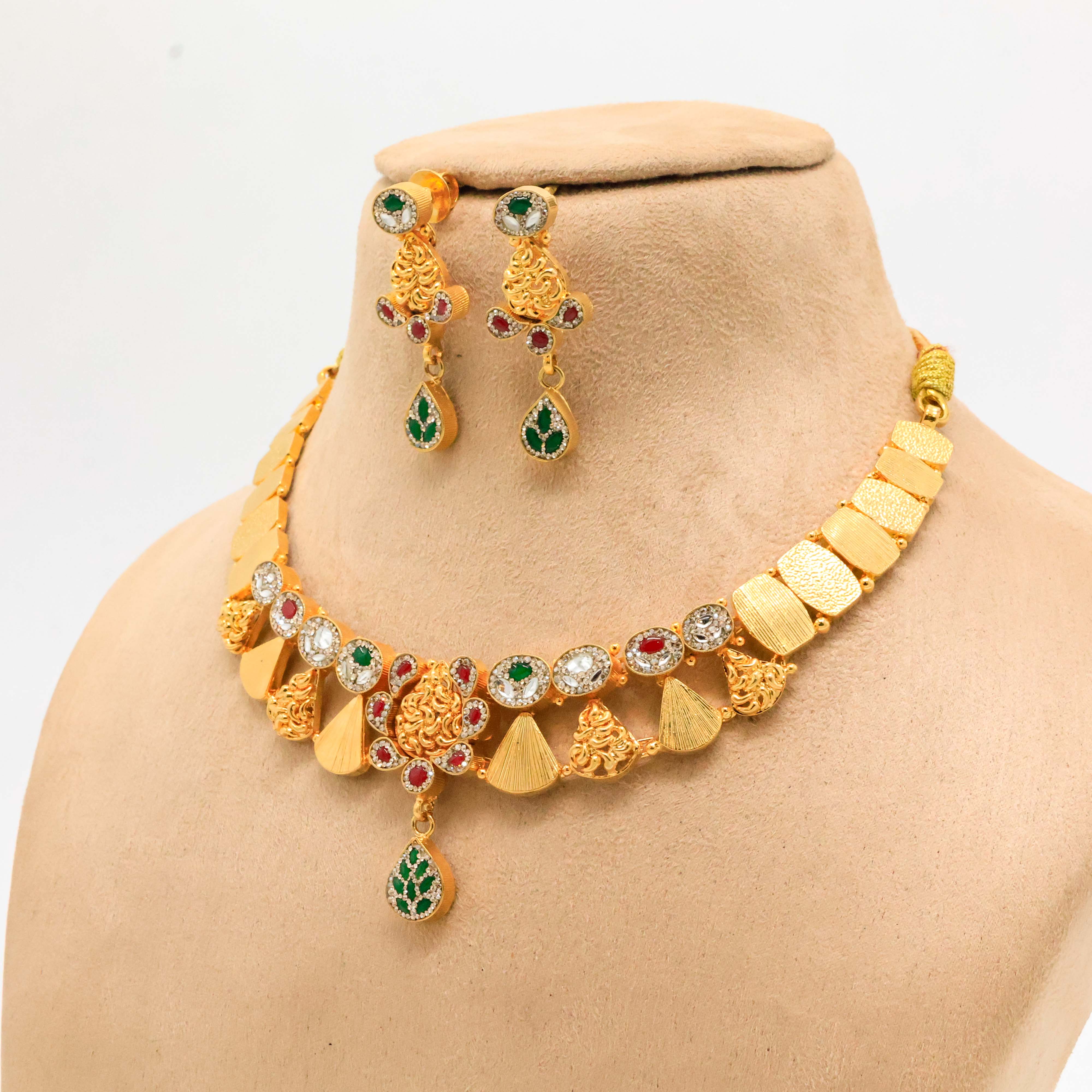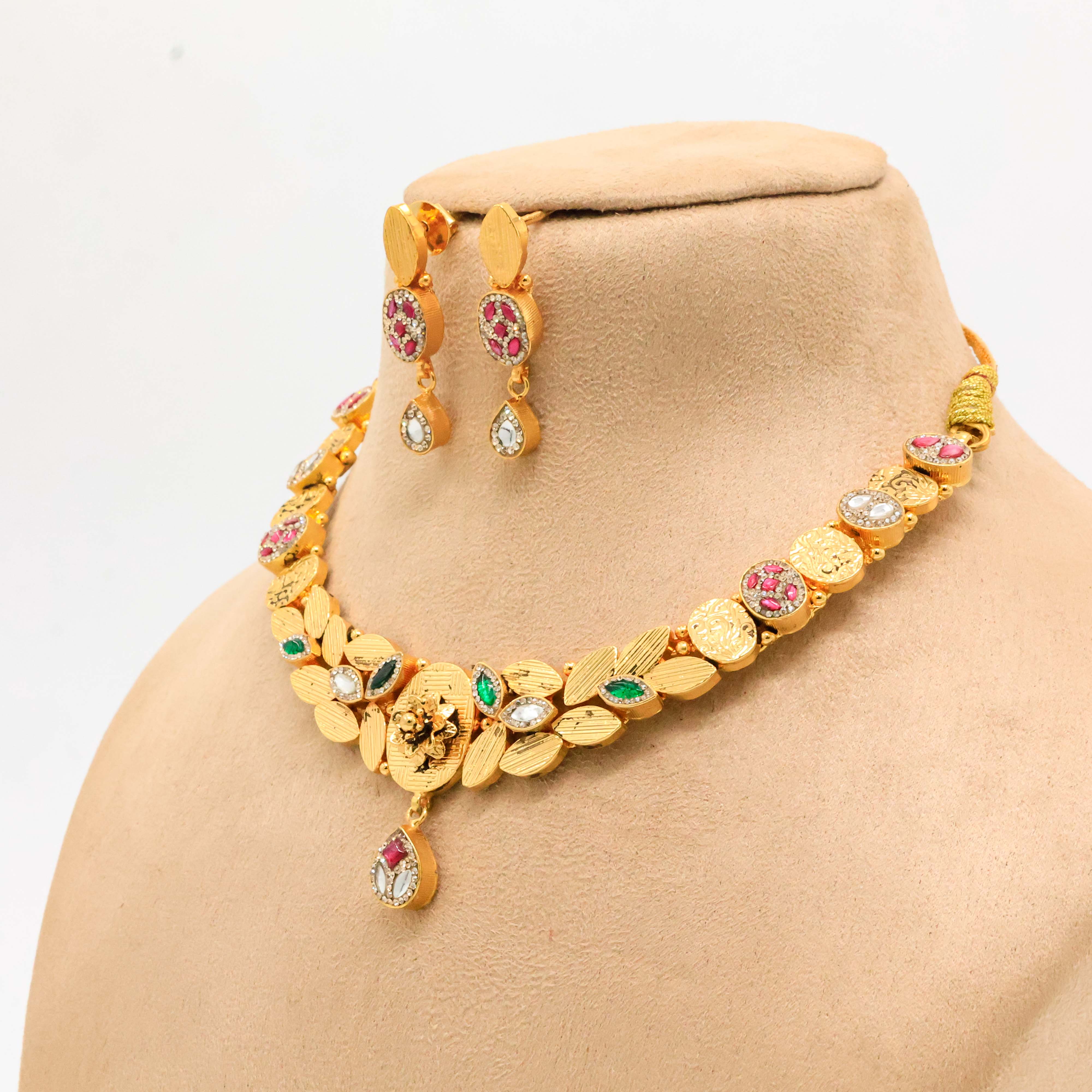 Elegant gold plated necklace with stone accents, perfect for weddings and special occasions. Buy Gold Plated Necklace from Arham Jewellery in Hyderabad.