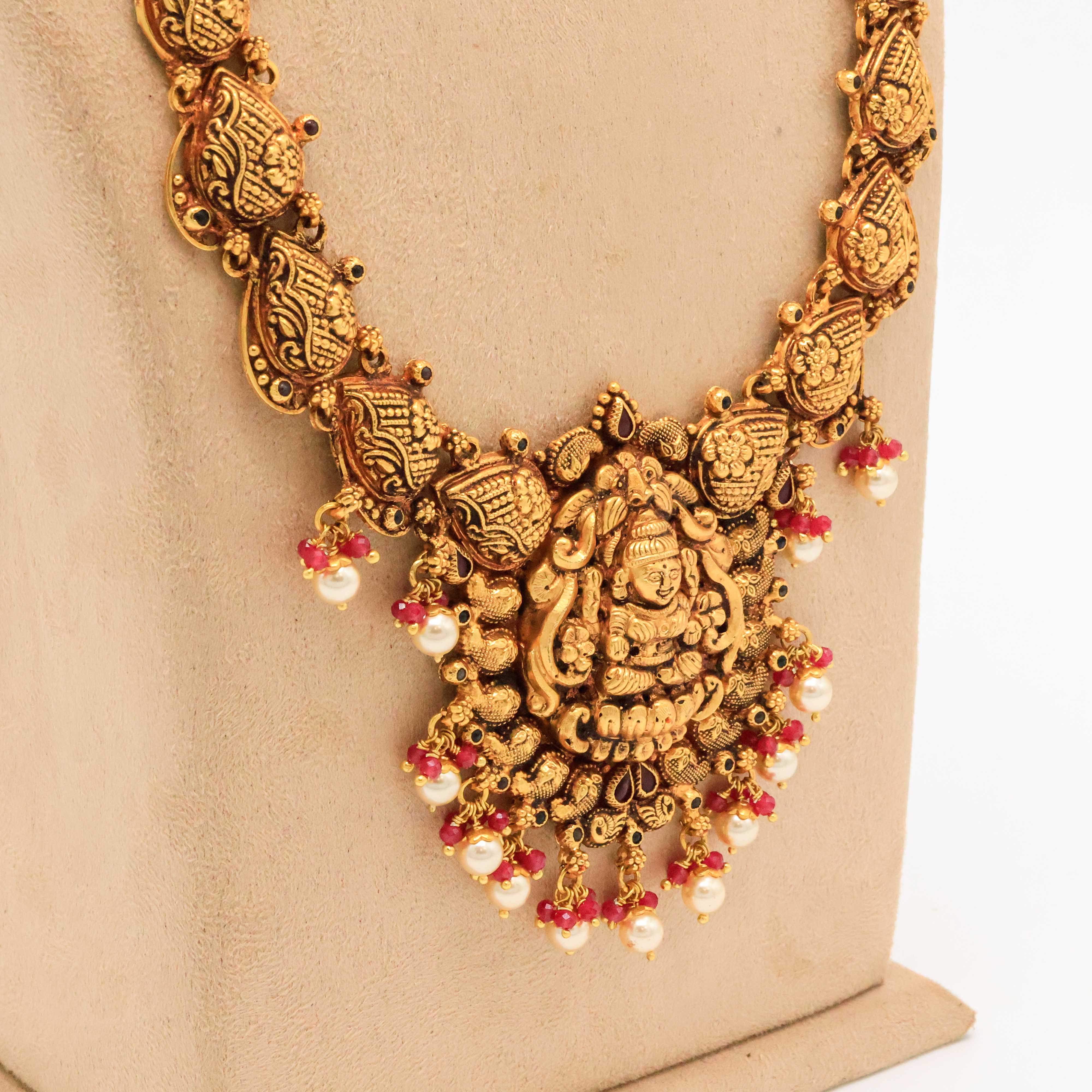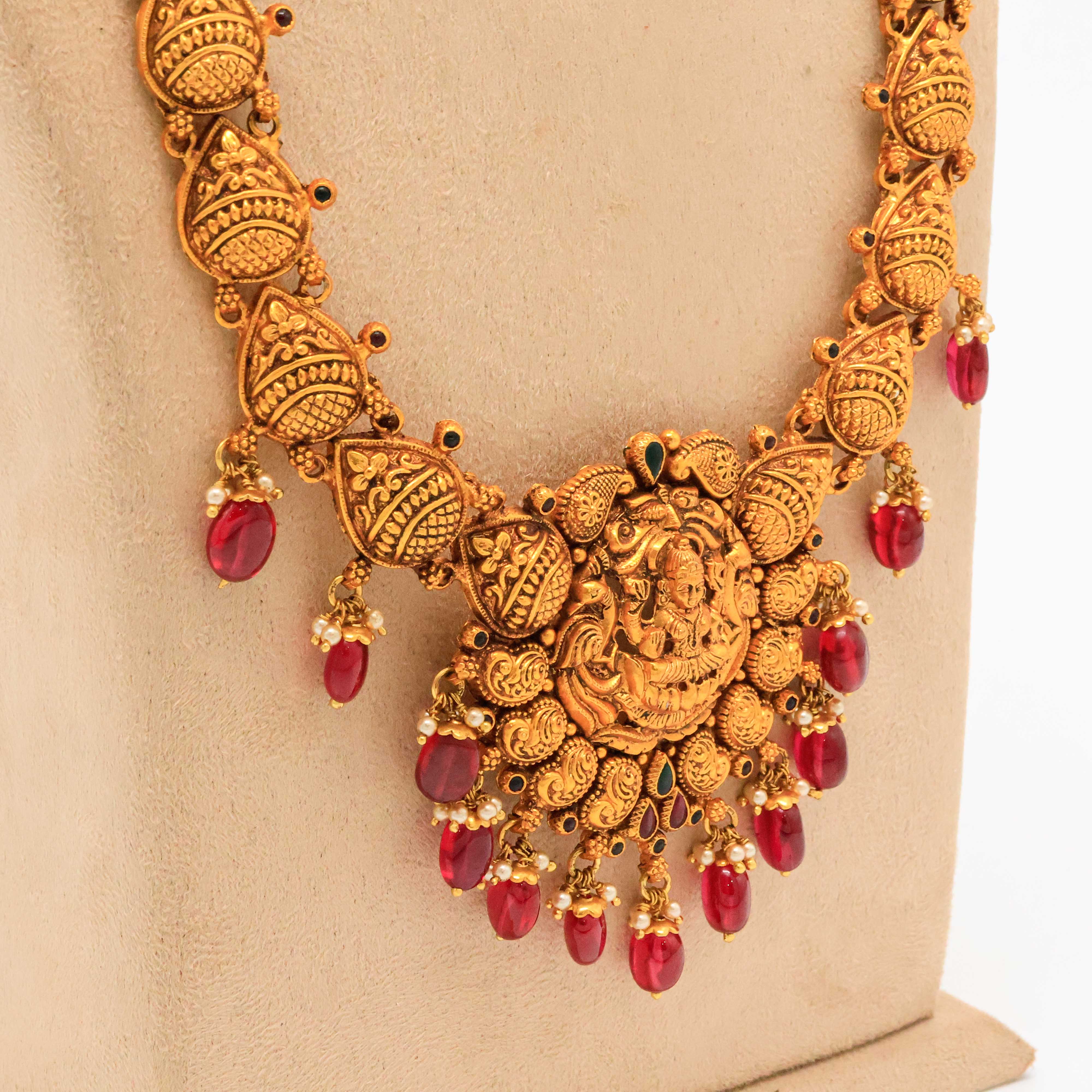 Traditional gold temple necklace with Lakshmi pendant, perfect for weddings and special occasions. Buy gold temple necklace from Arham Jewellery in Hyderabad.