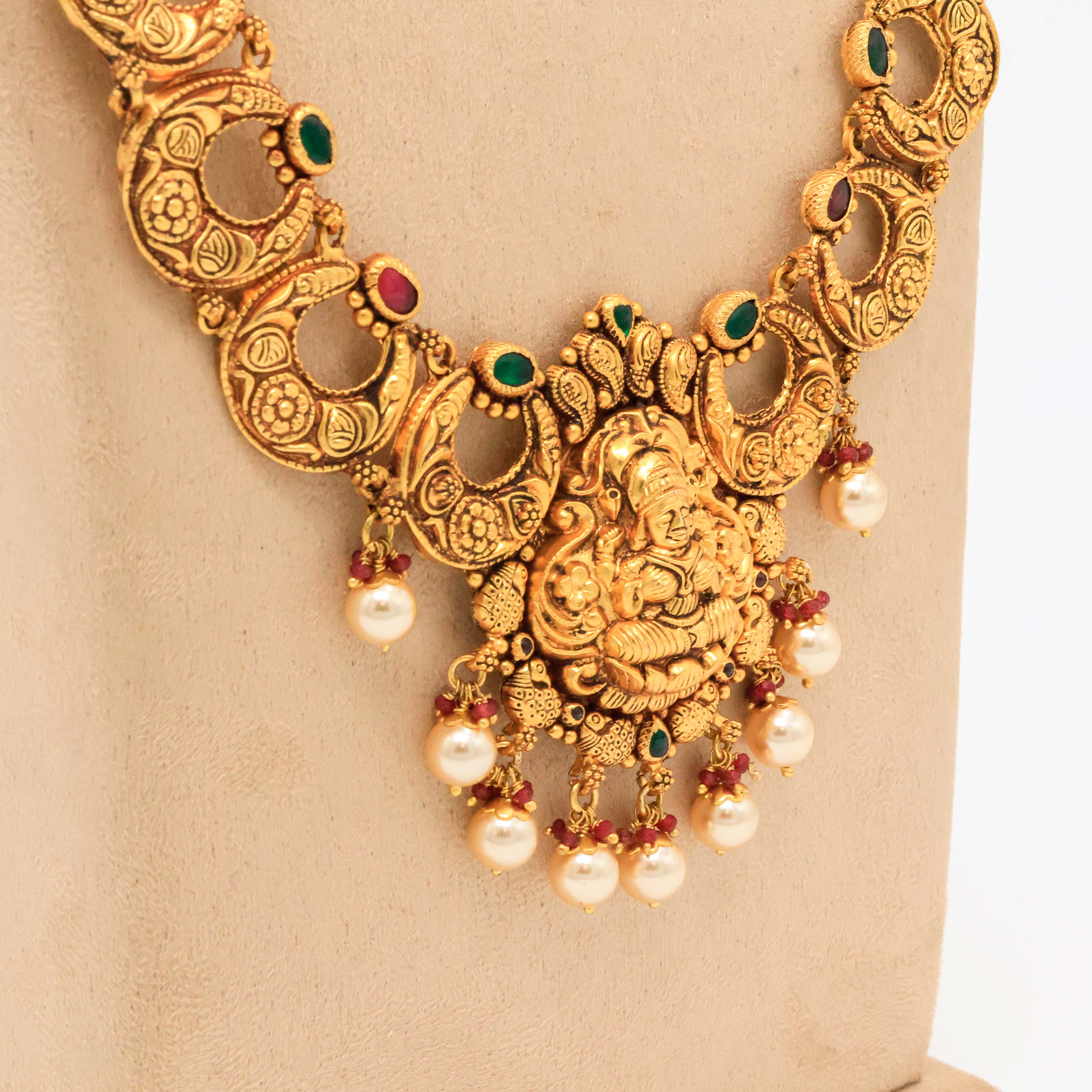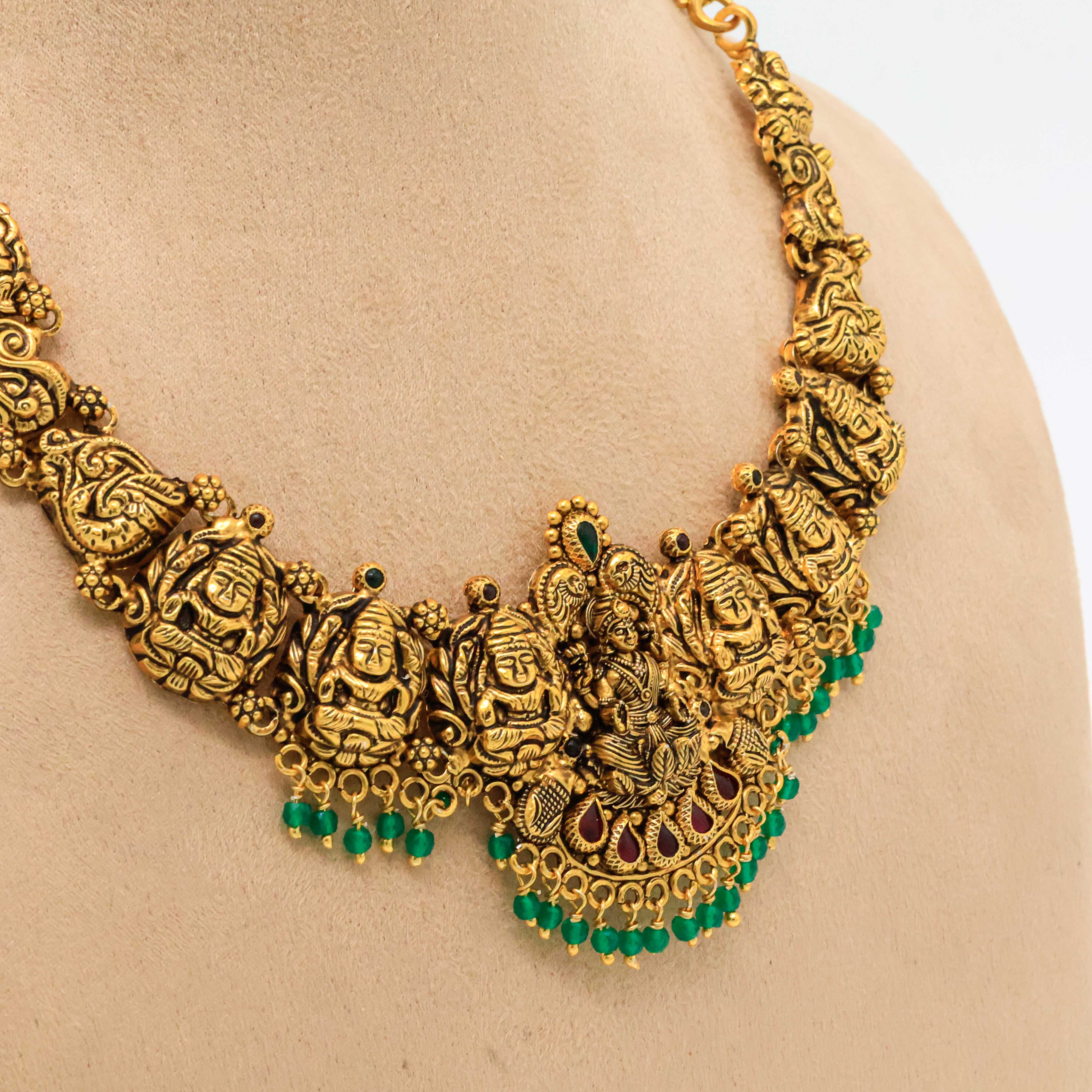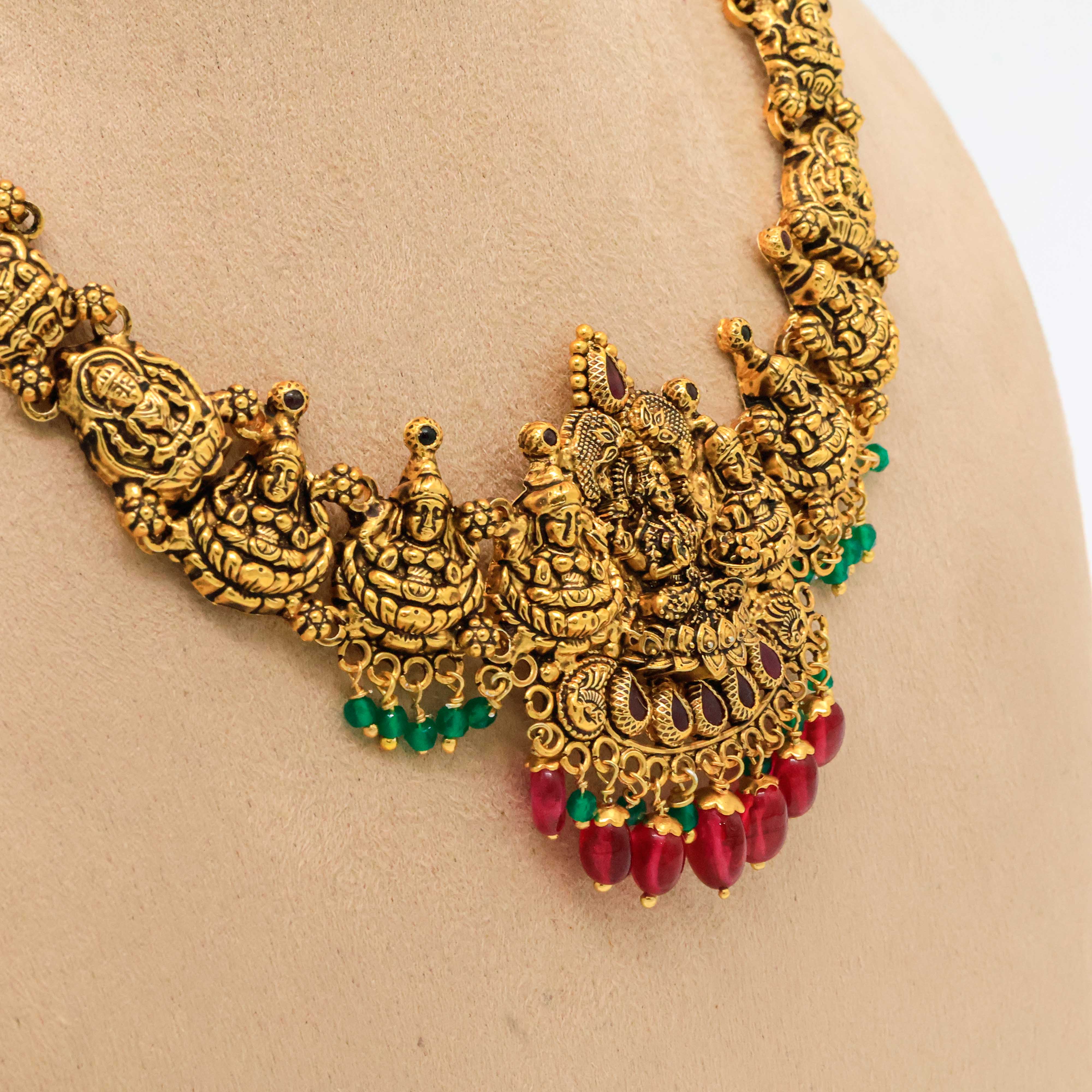 Antique gold temple necklace with goddess Lakshmi motifs. Perfect for traditional occasions. Buy gold temple necklace from Arham Jewellery in Hyderabad.