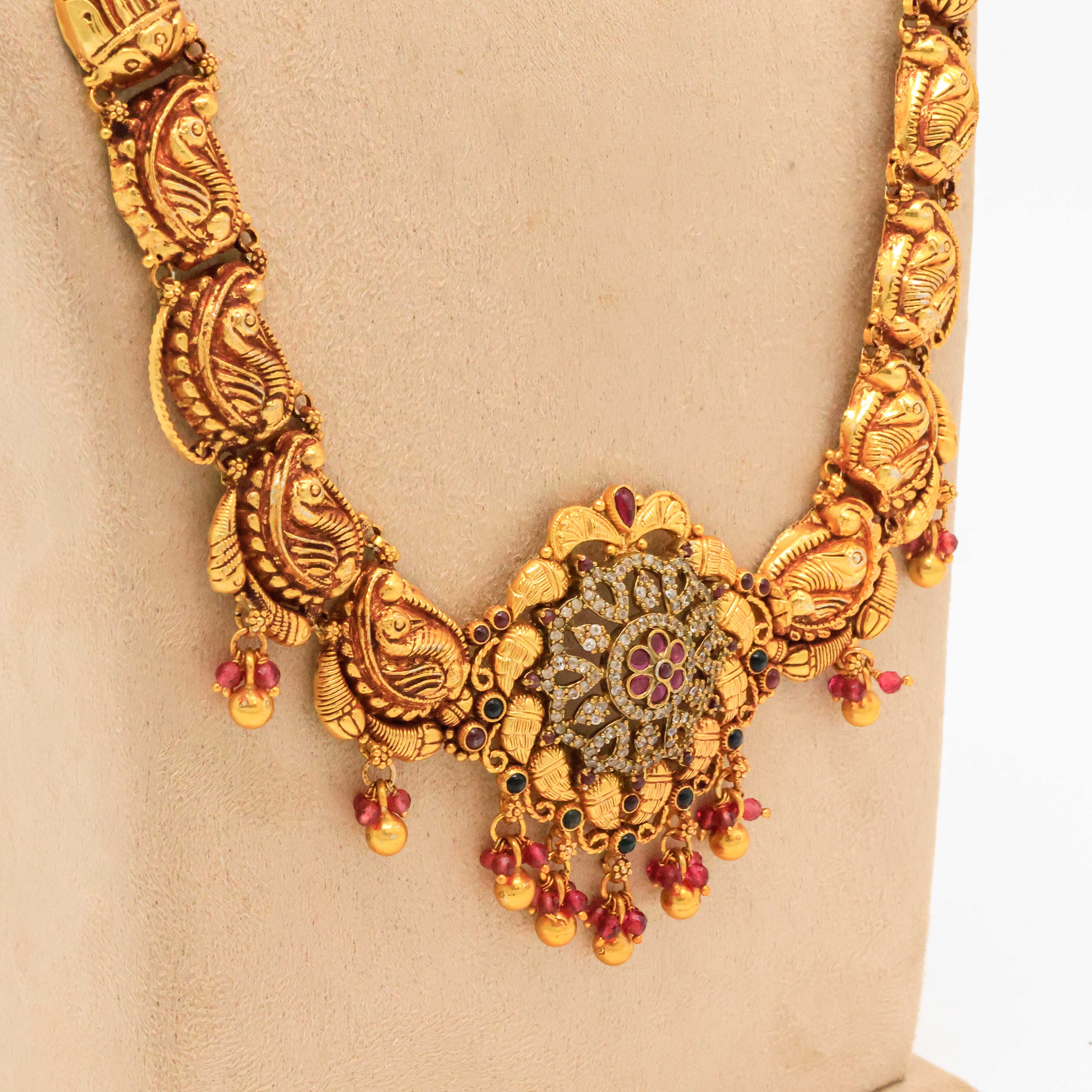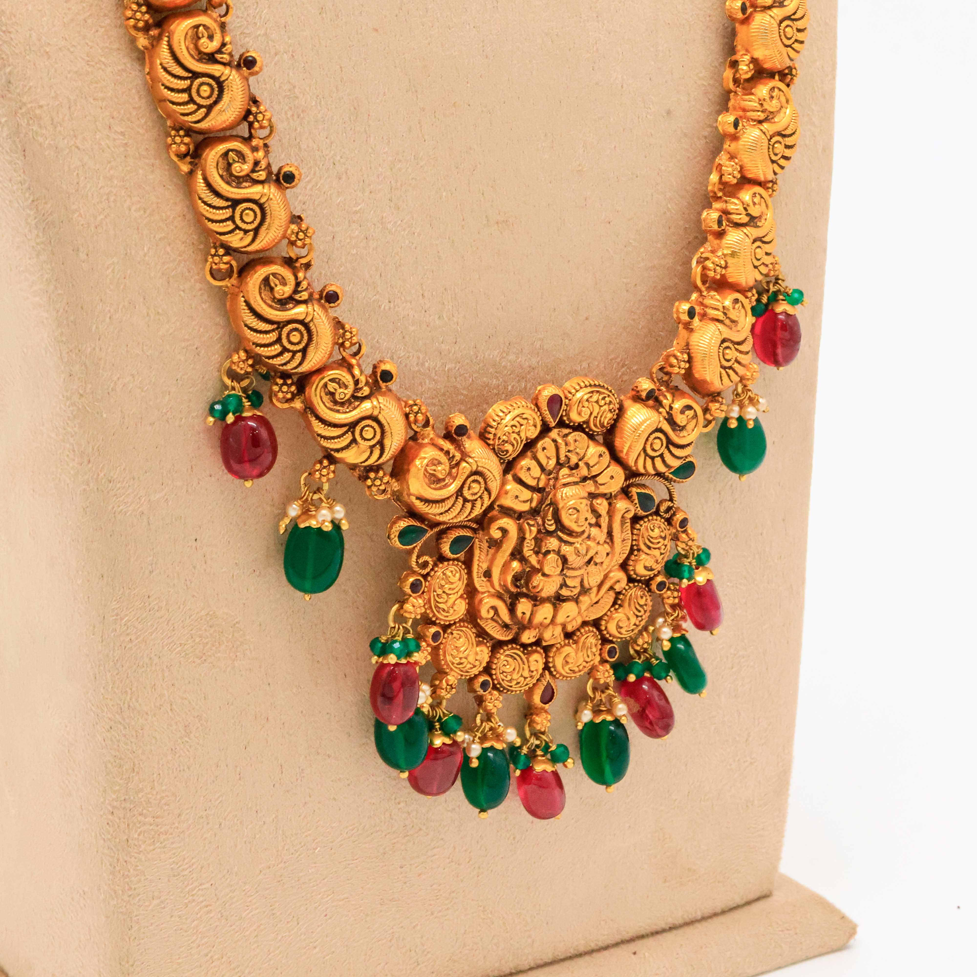 Antique gold temple necklace featuring traditional Indian design, perfect for weddings and cultural events. Buy Gold Temple Necklace from Arham Jewellery in Hyderabad.
