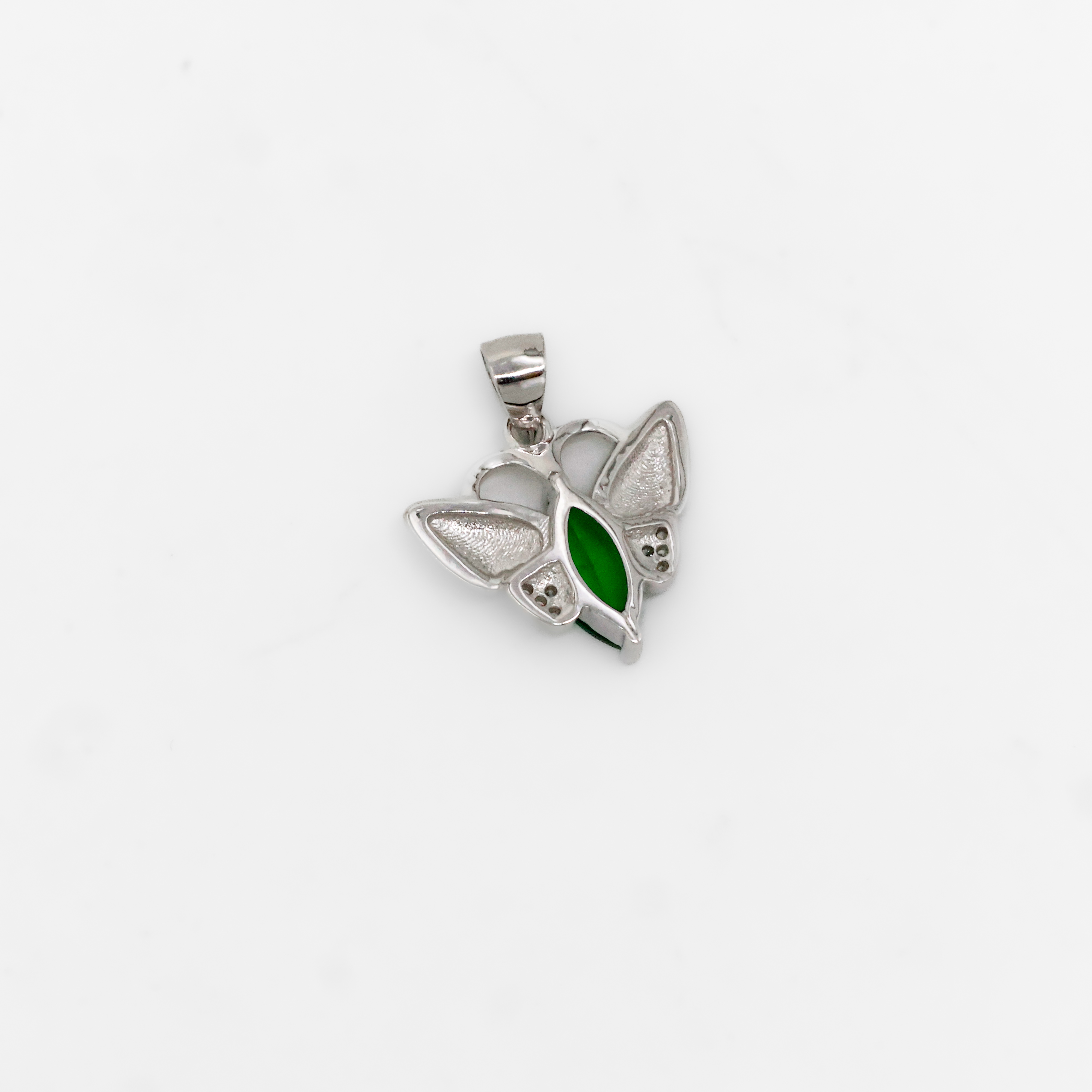 Elegant silver butterfly pendant with green stone, perfect for daily wear or special occasions. Buy silver butterfly pendant from Arham Silver Palace in Hyderabad.