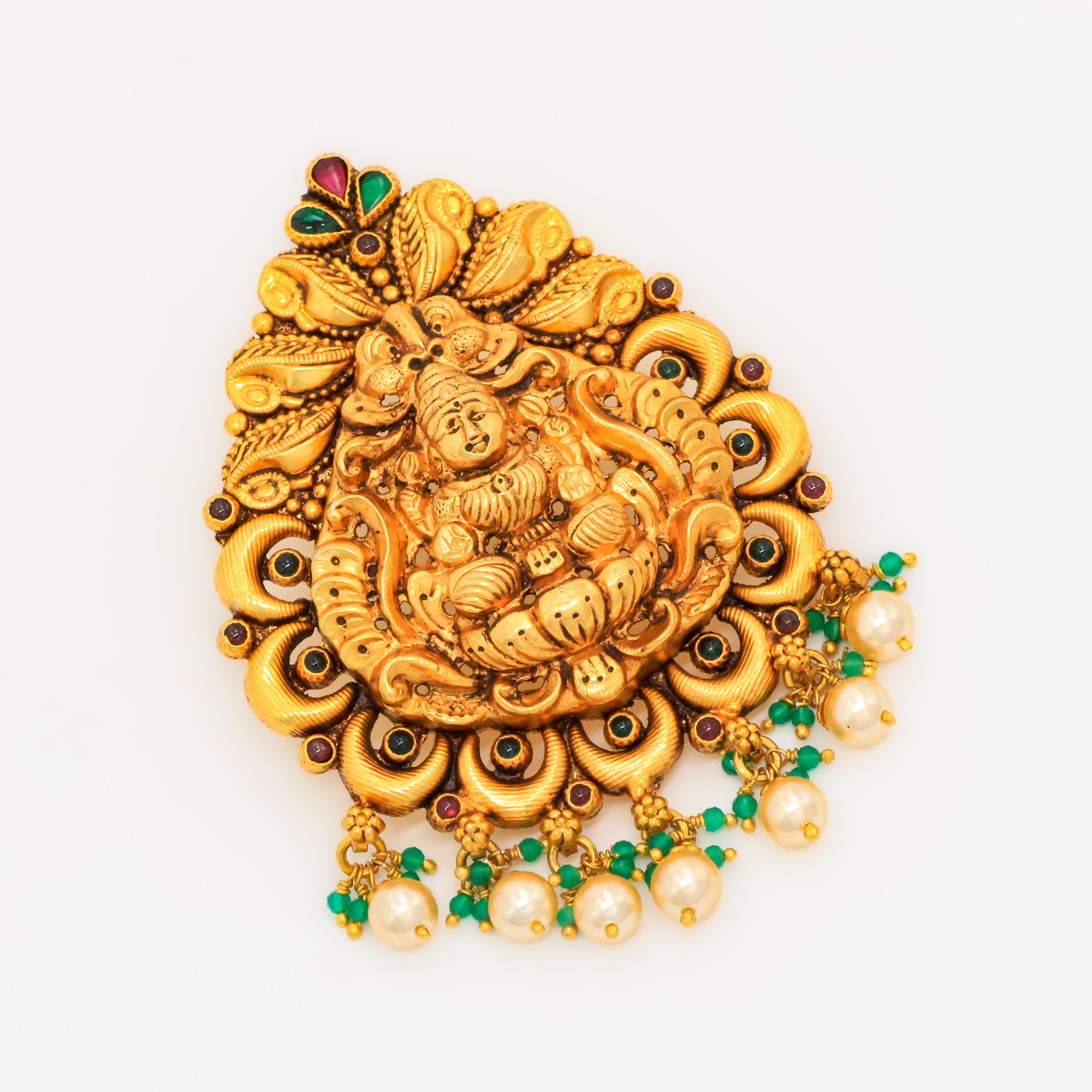 Ornate gold Lakshmi pendant with intricate details, perfect for traditional occasions and festivals. Buy gold Lakshmi pendant from Arham Jewellery in Hyderabad.