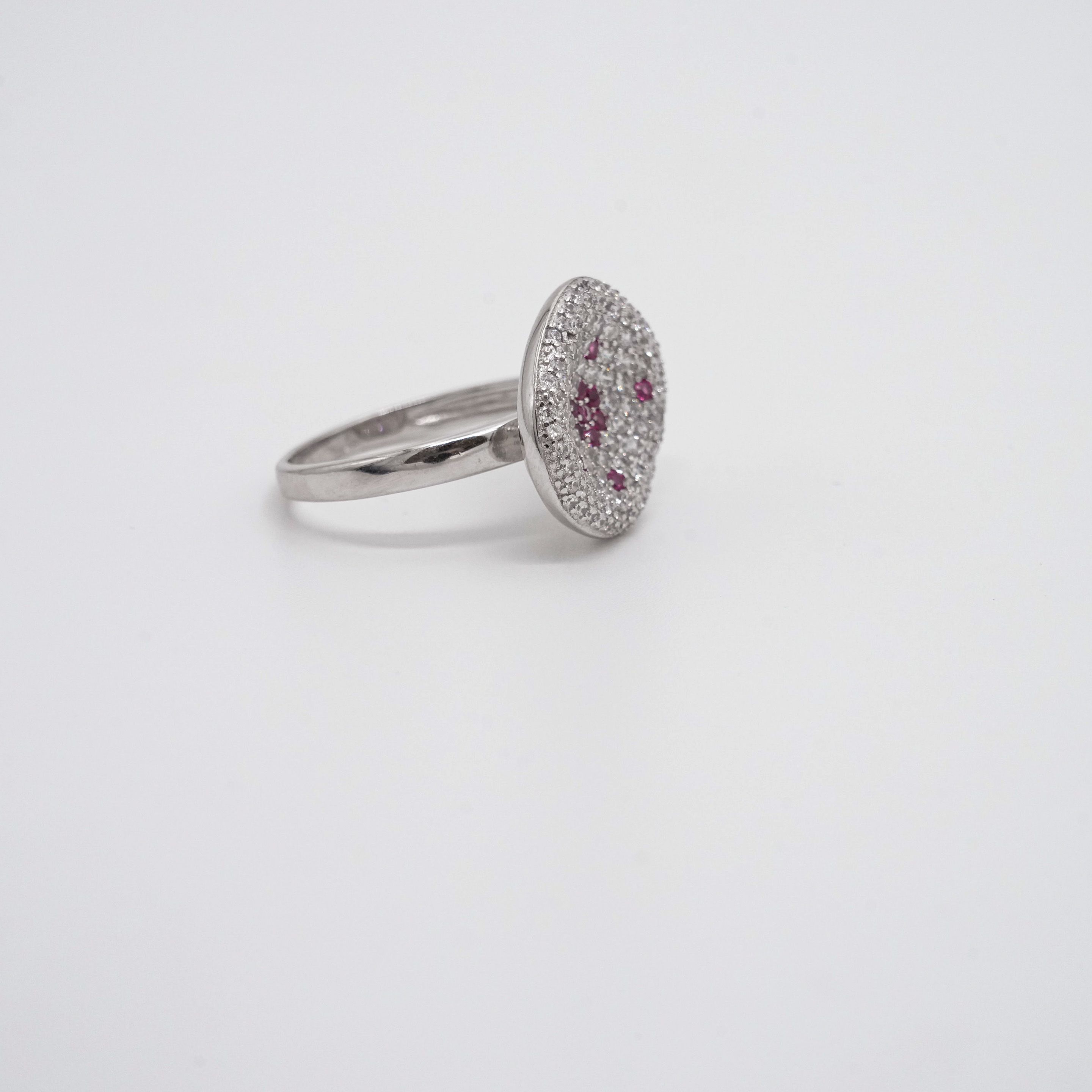 Sterling silver halo ring with round cut cubic zirconia stones, perfect for weddings and engagements. Buy silver halo ring from Arham Gold in Hyderabad.