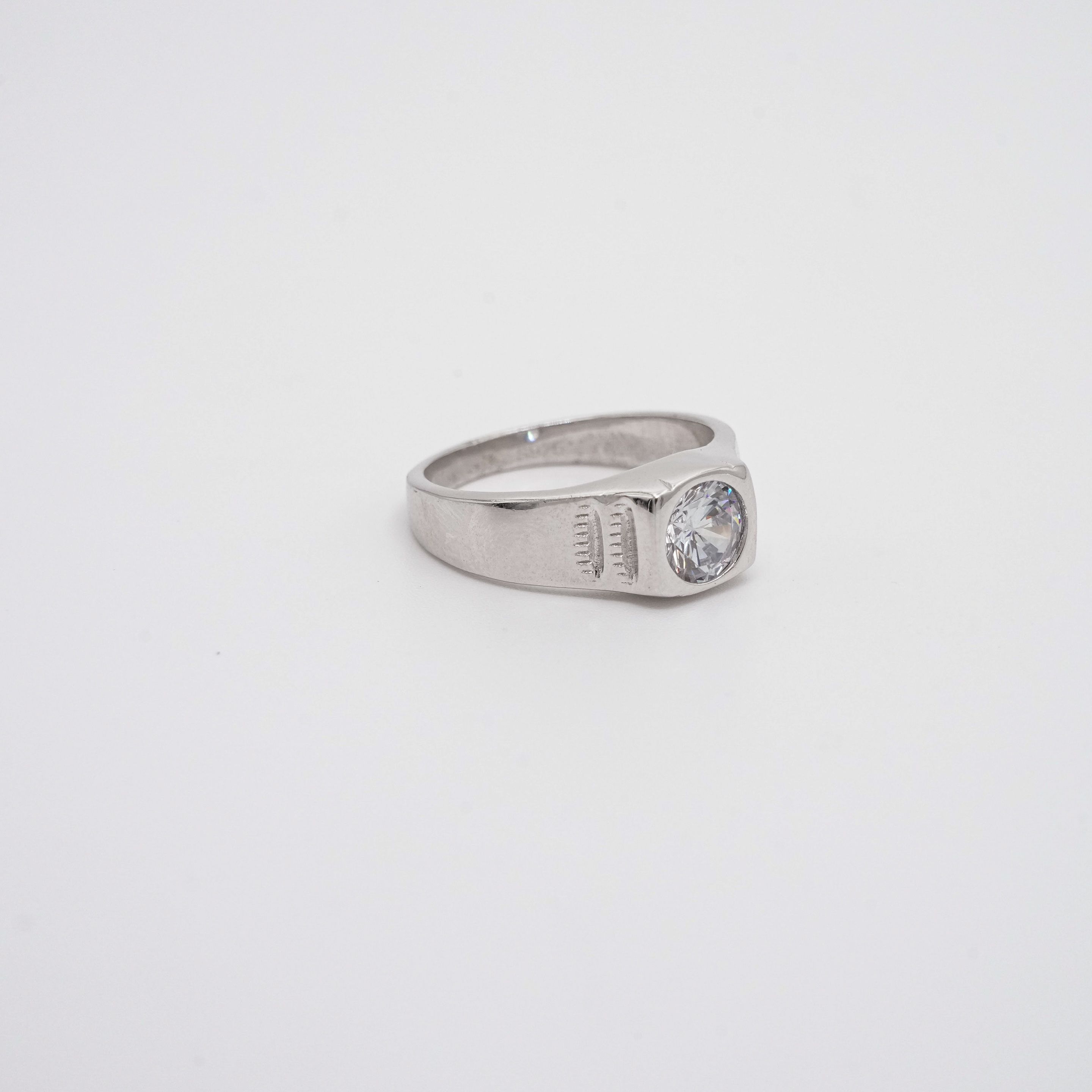 Sterling silver ring with rectangle cut stone and intricate band design. Ideal for everyday wear. Buy silver fashion ring from Arham Gold in Hyderabad.