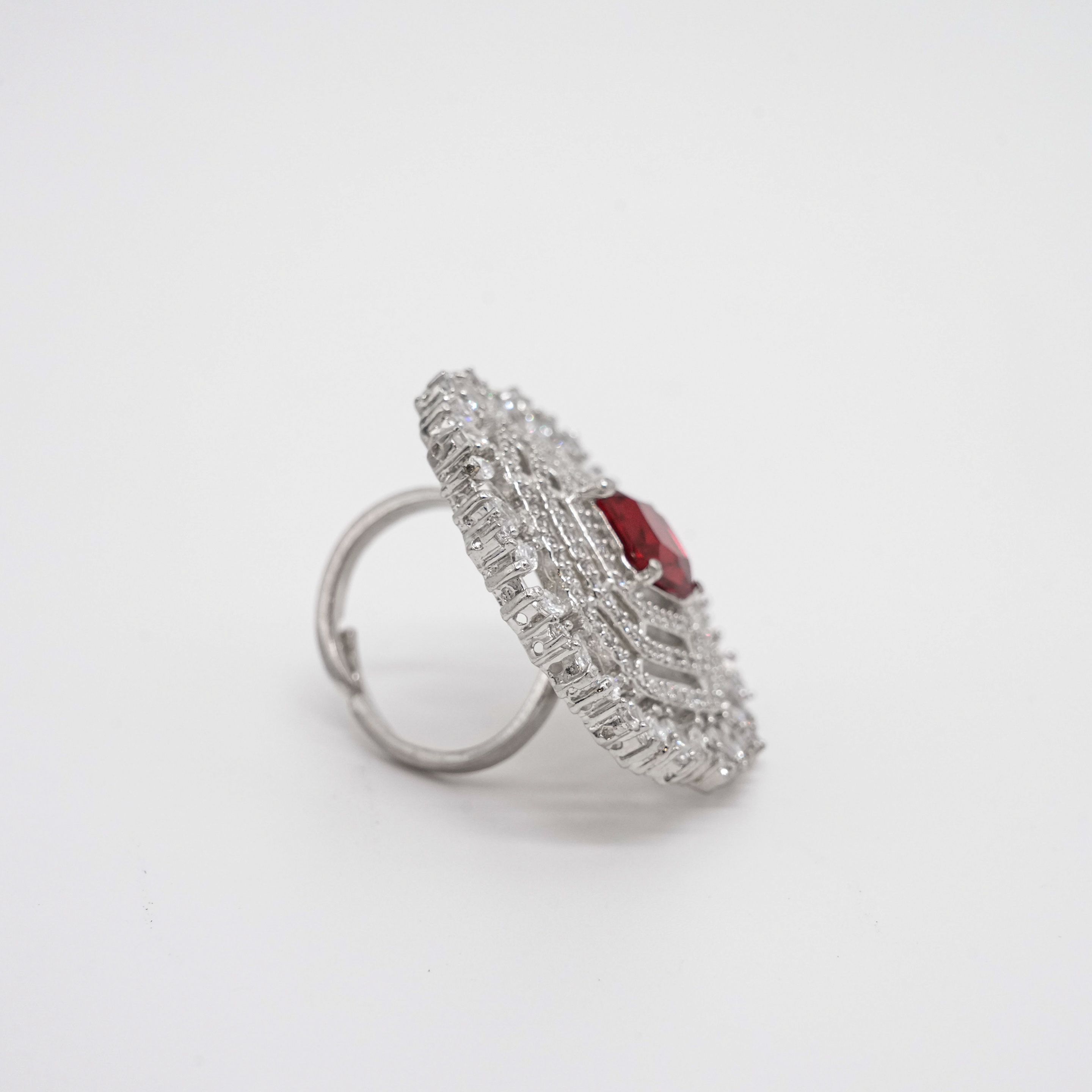 Elegant silver fashion ring with red stone and intricate design, perfect for parties and weddings. Buy silver fashion ring from Arham Gold in Hyderabad.