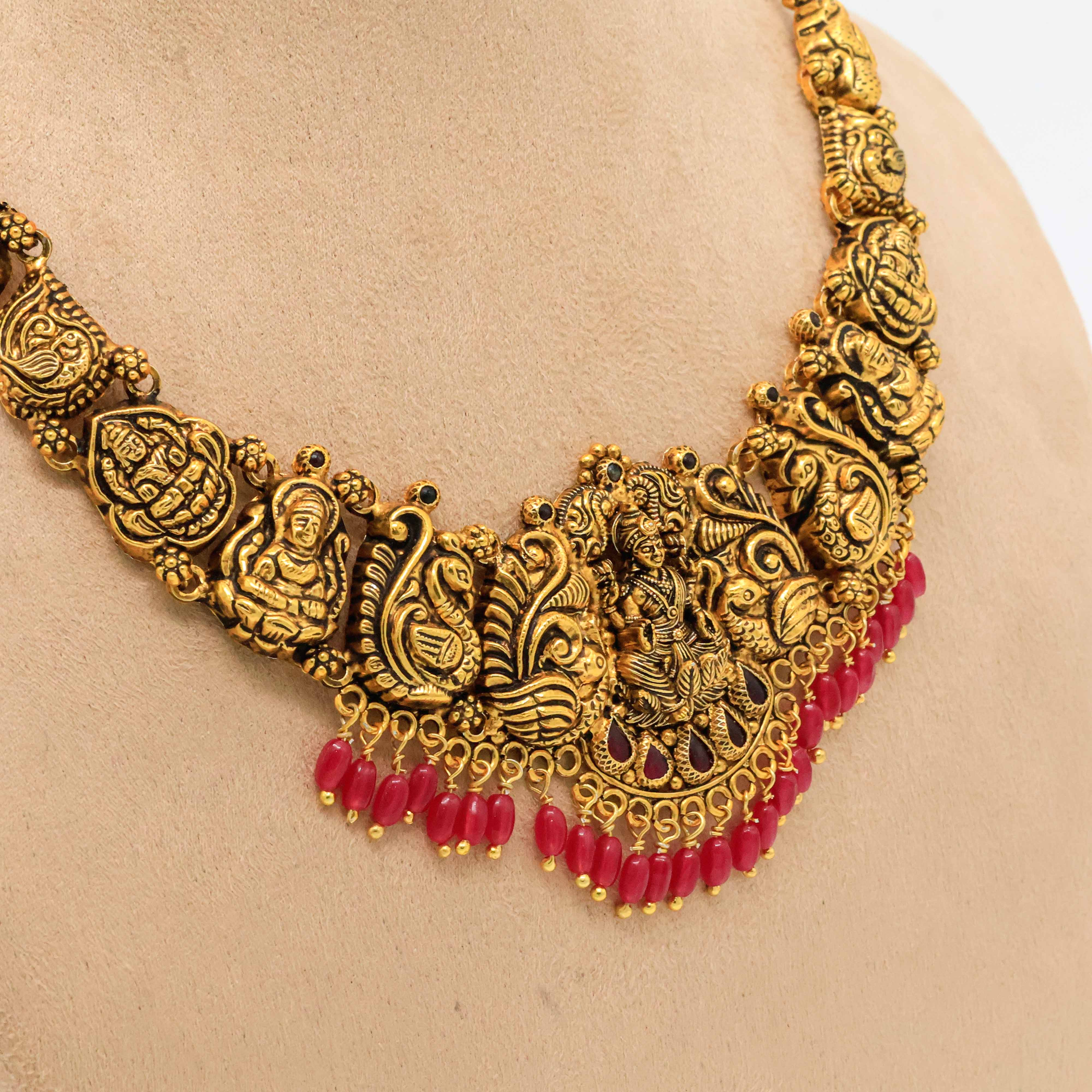 Antique gold plated necklace with Lakshmi pendant and ruby beads, perfect for traditional occasions. Buy Gold Plated Necklace from Arham Jewellery in Hyderabad.