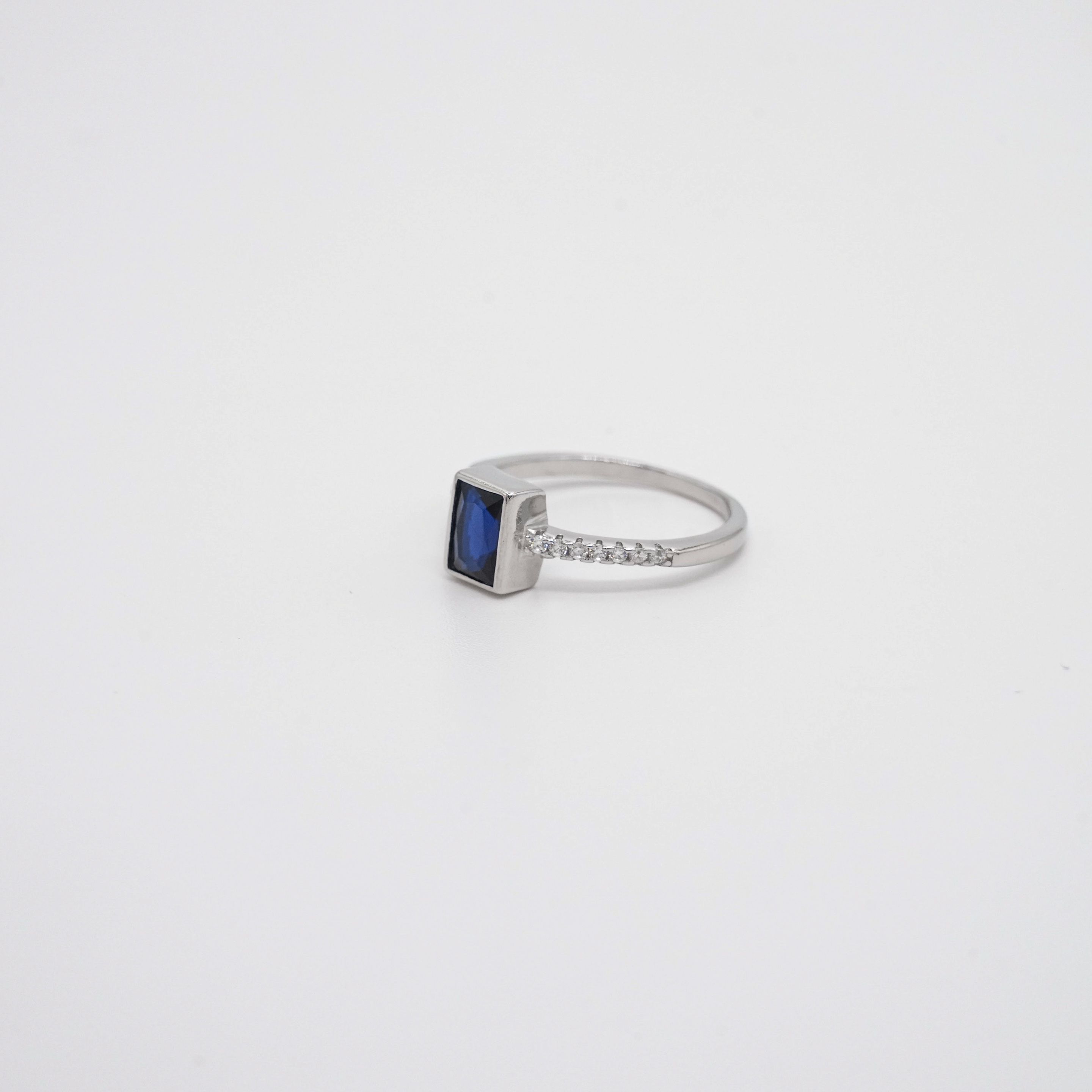 Sterling silver ring with rectangular blue stone and cubic zirconia accents. Perfect as a fashion accessory. Buy silver fashion ring from Arham Gold in Hyderabad.