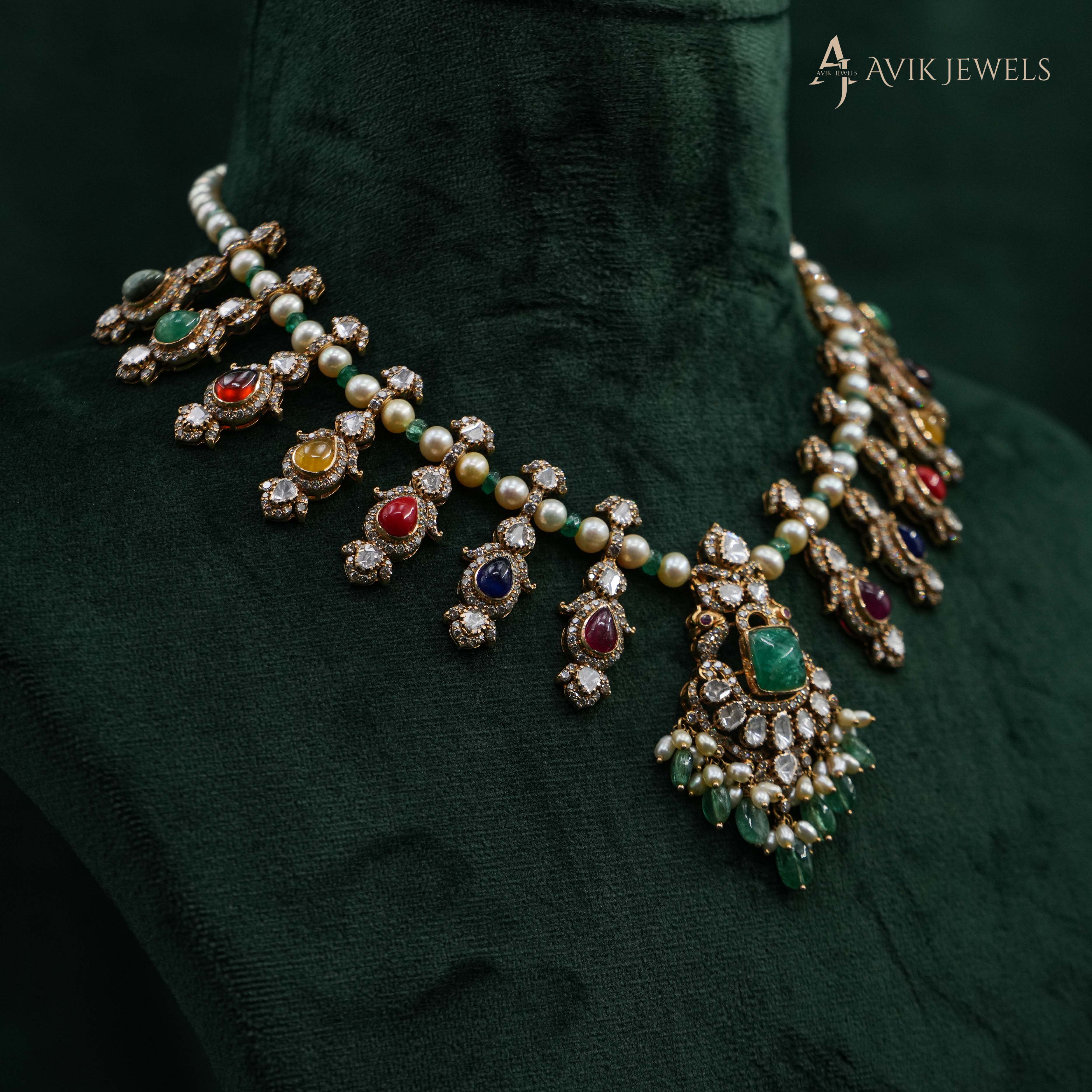 Stunning polki choker necklace with colorful gemstone drops, perfect for weddings and special occasions. Buy polki choker necklace from Avik Jewels in Hyderabad.