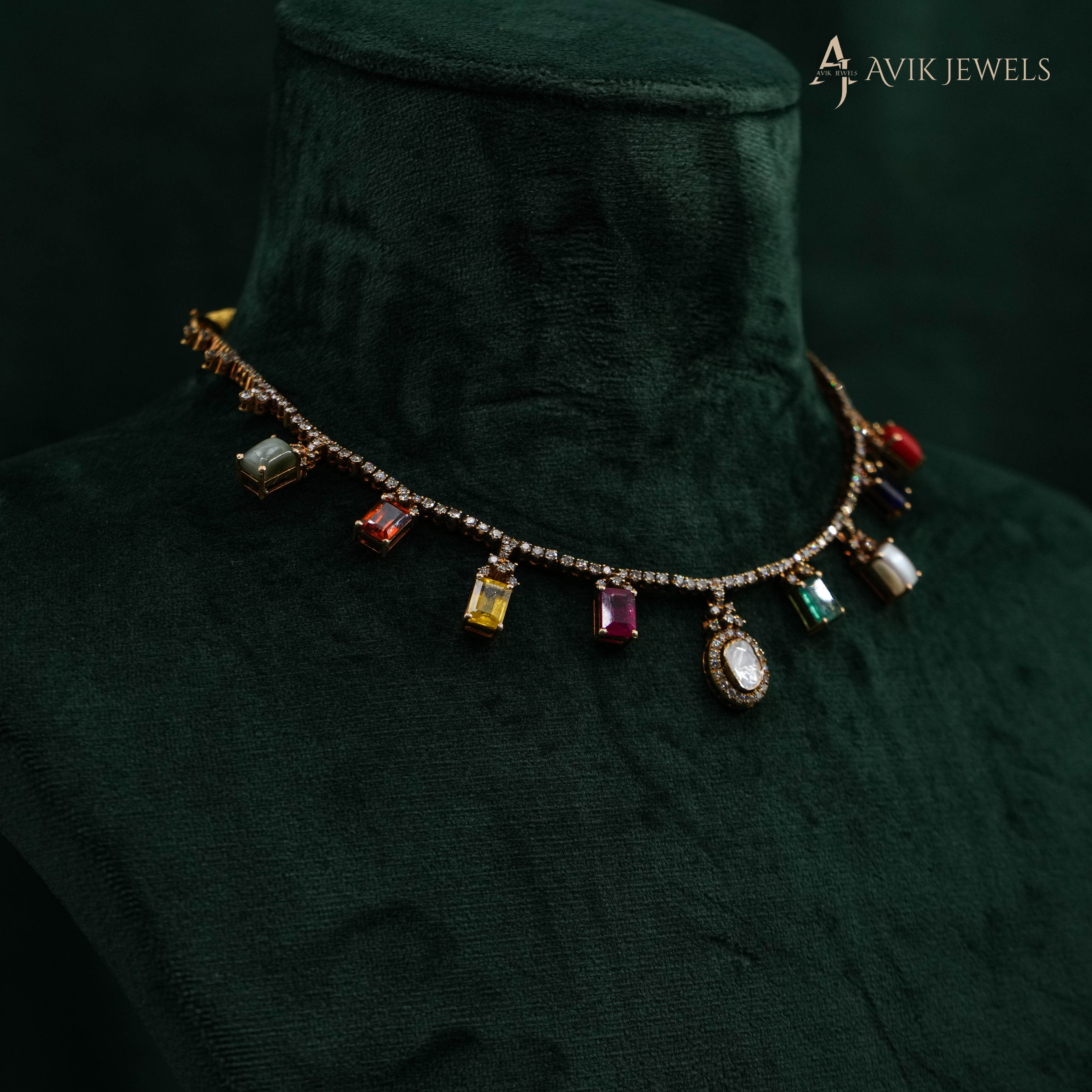 Stunning polki choker necklace with colorful gemstone drops, perfect for weddings and special occasions. Buy polki choker necklace from Avik Jewels in Hyderabad.