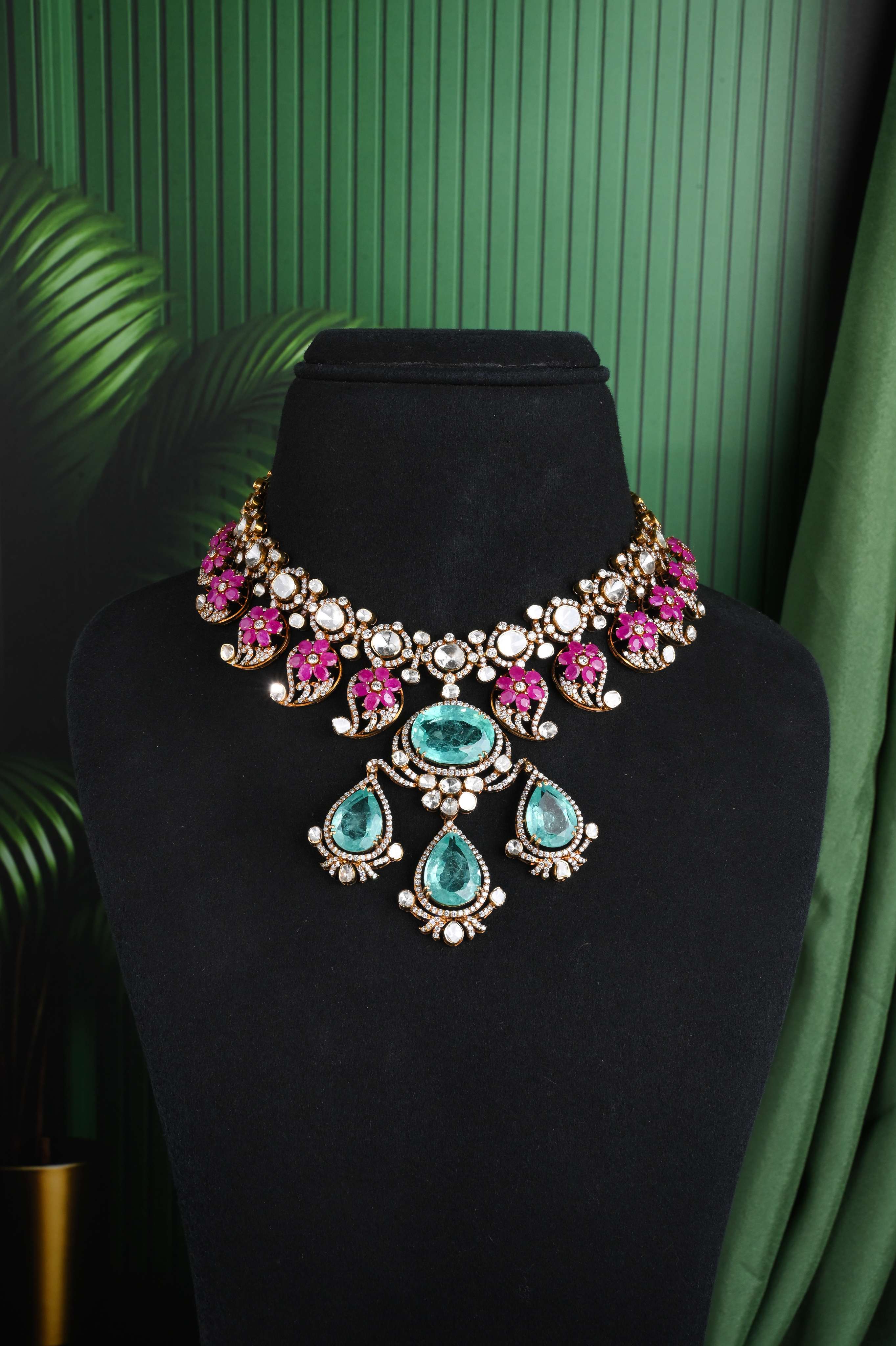 The sitara jharna lab grown dimaond Necklace showcases timeless elegance with a regal centerpiece framed by brilliant stones. The intricate lattice design along the chain flows gracefully into a majestic drop pendant featuring a vivid green gemstone that radiates sophistication. Crafted for statement occasions, this necklace blends classic luxury with modern refinement, making it perfect for weddings, gala evenings, or grand celebrations.VVS-VS EF