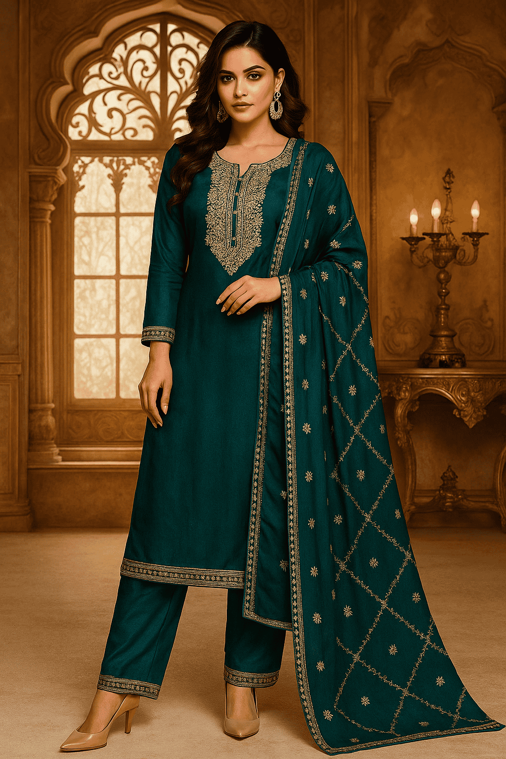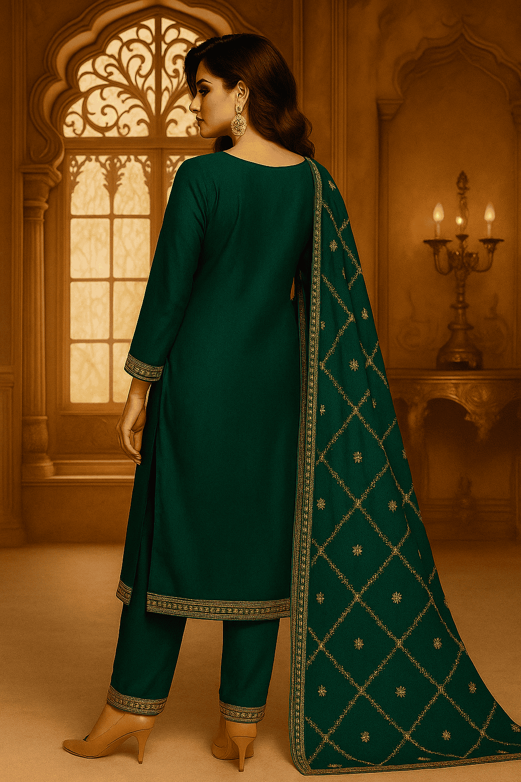 Step out in style with this beautifully Dark Green kurti set, paired with striped palazzo pants and dupatta. The intricate motifs and detailed neckline.