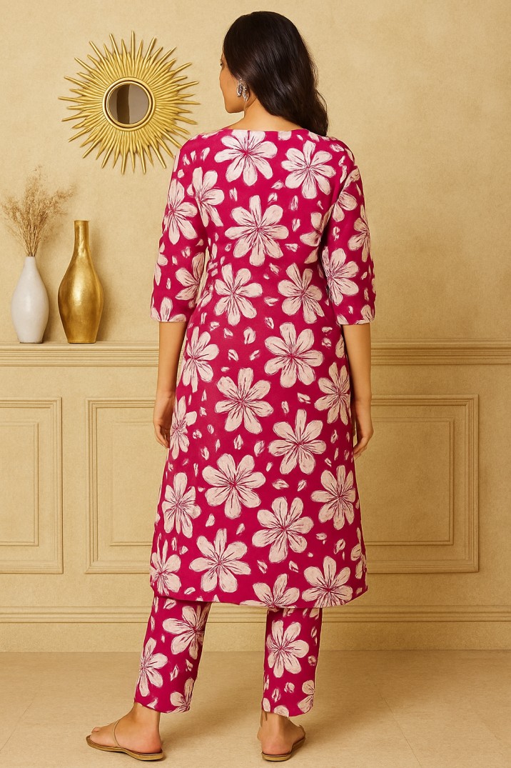 Step into effortless elegance with this vibrant magenta floral Cord Set, crafted from breathable cloth for all-day comfort. Featuring an A-line silhouette, this kurta is adorned with bold ivory floral motifs that add a touch of charm and sophistication. The three-quarter sleeves and round neckline with a button-down front enhance its contemporary appeal, making it ideal for both casual outings and at-home relaxation.