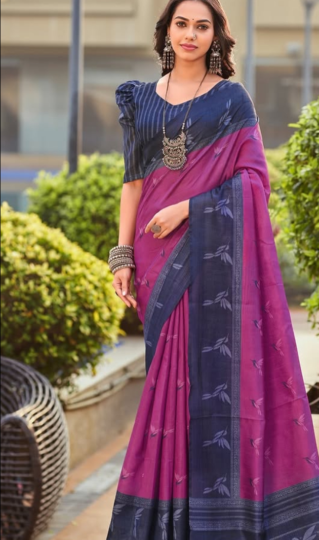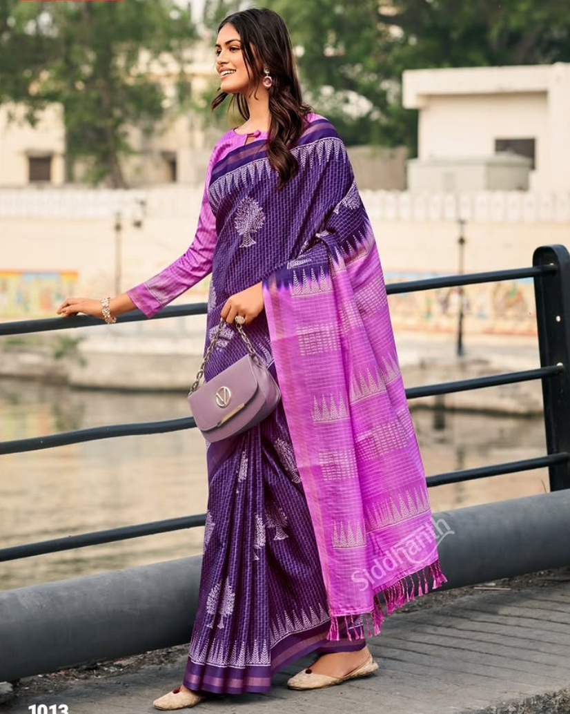 Vibrant purple and pink saree with intricate patterns, perfect for festive gatherings and elegant occasions.
