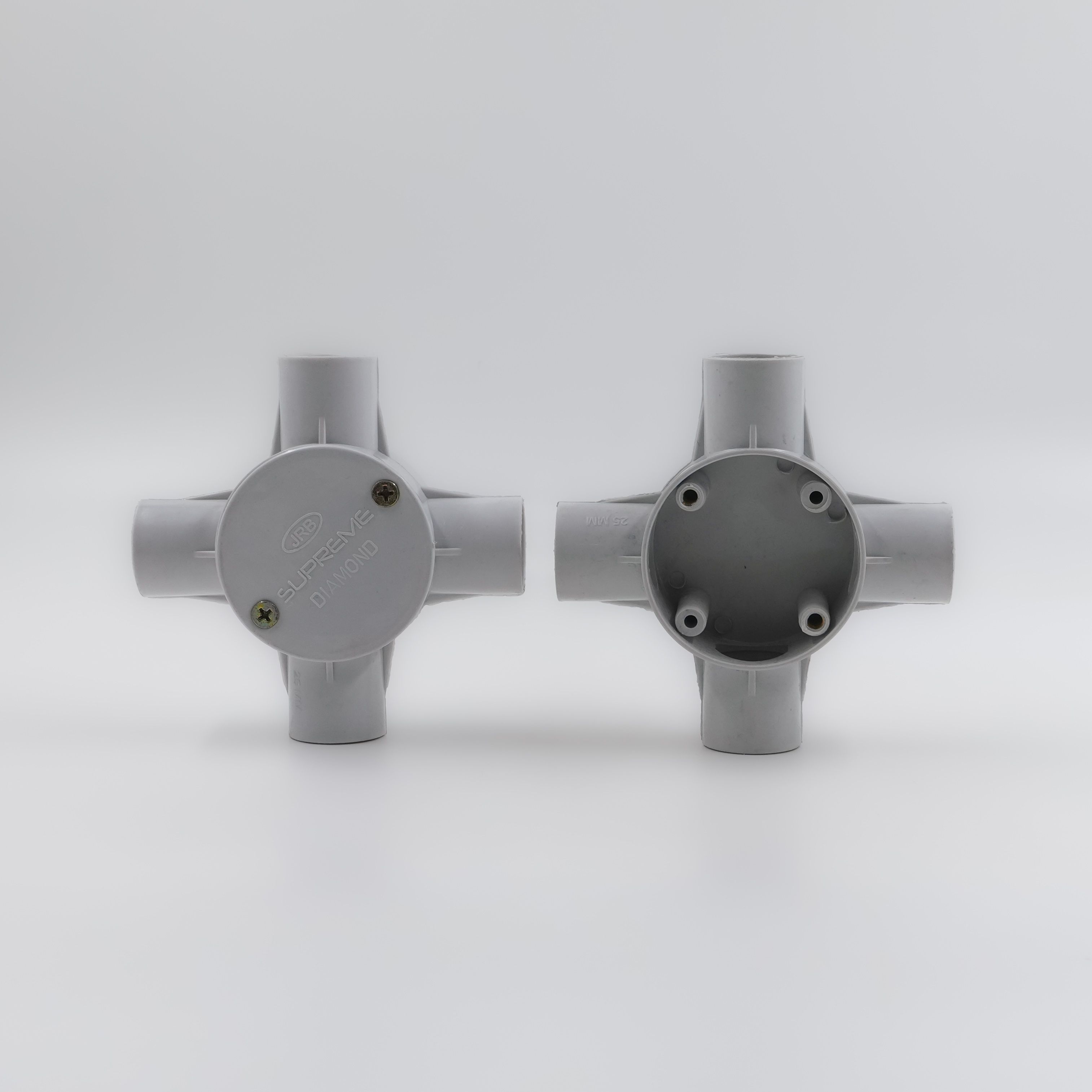 BRASS - Threading and Screw 25MM 4 Way PVC conduit JUNCTION BOX in GRAY colour , high-quality, durable,easy installation, strong insulation, weatherproof, ideal for safe electrical wiring connections in residential and commercial applications projects